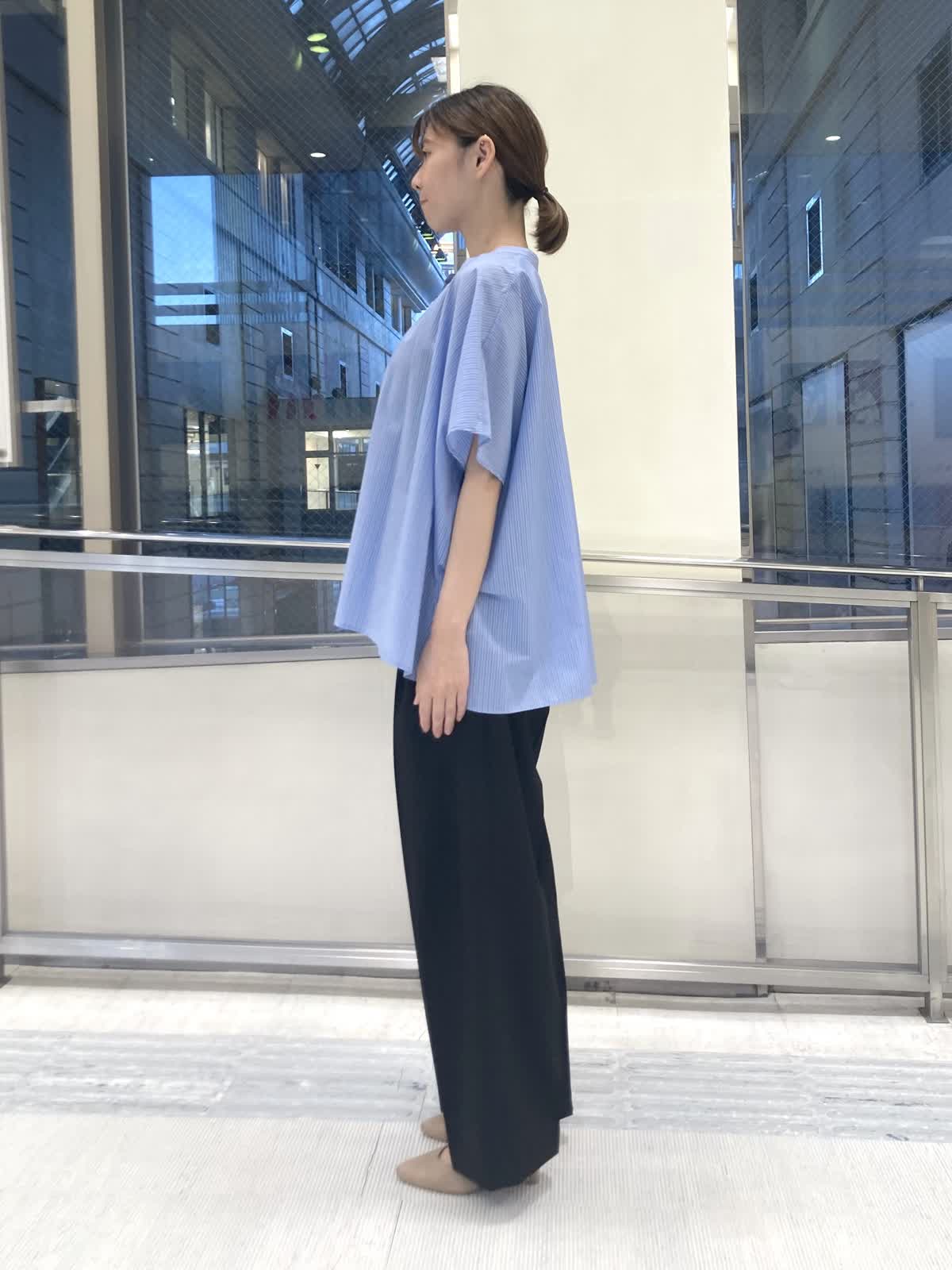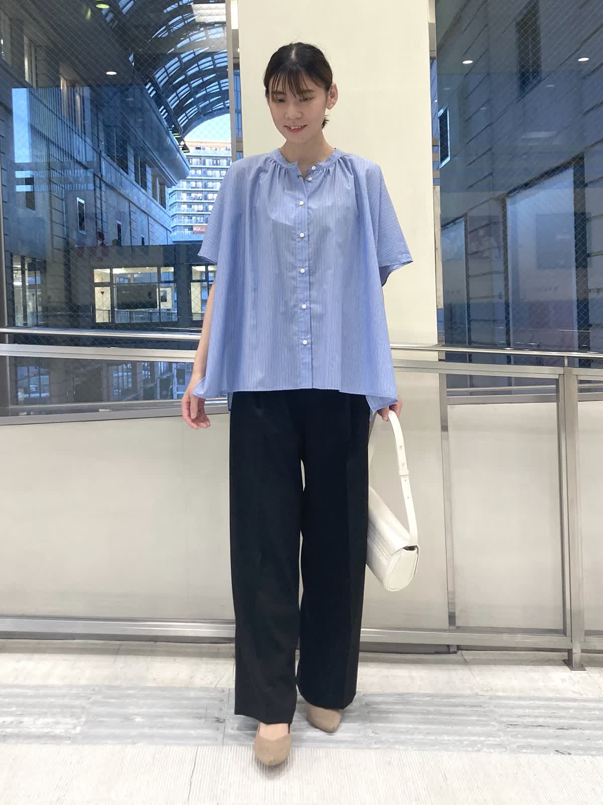 【着用サイズ】ブラウス : フリー パンツ : 9号 【着用カラー】ブラウス:ブルー パンツ : ブラック バッグ :クリーム 爽やかなお仕事コーデ。ブラウスはポンチョ風のデザインなので、ゆったり着られ、風通しもいいので涼しく快適に着ていただけます。ボタンを開けて、羽織として着ても◎。パンツはセンタープレスが入っており、立体感のあるパンツです。シンプルなデザインなので、オールシーズン着ていただけます。