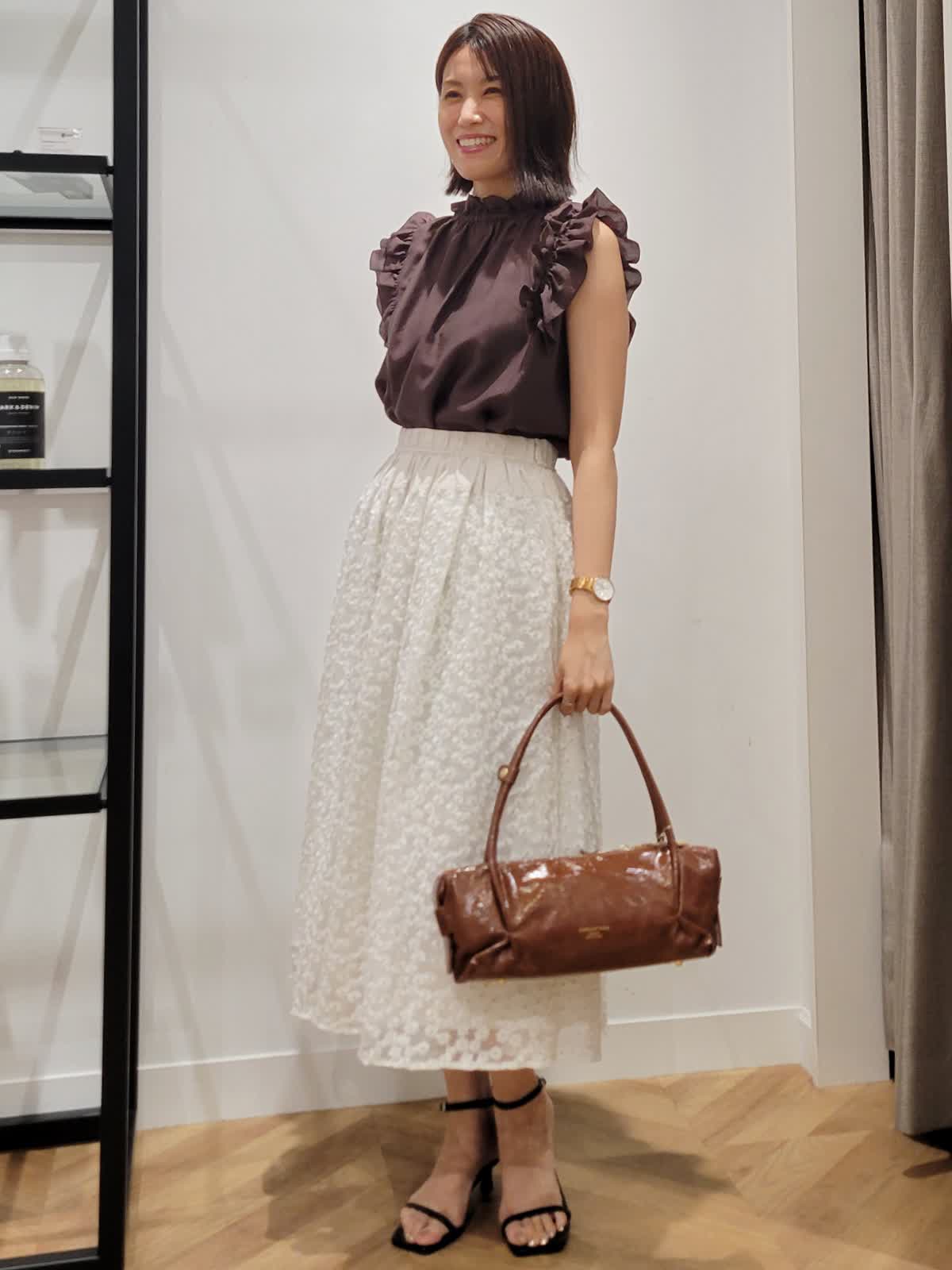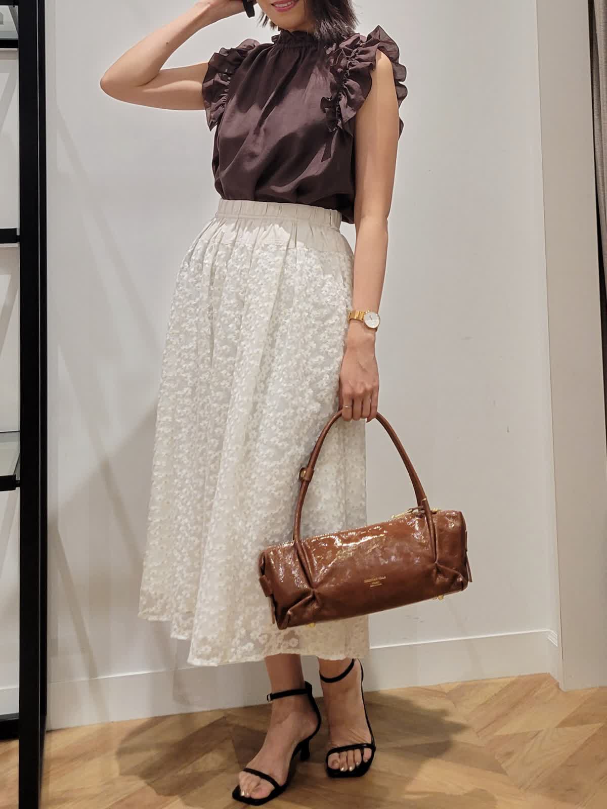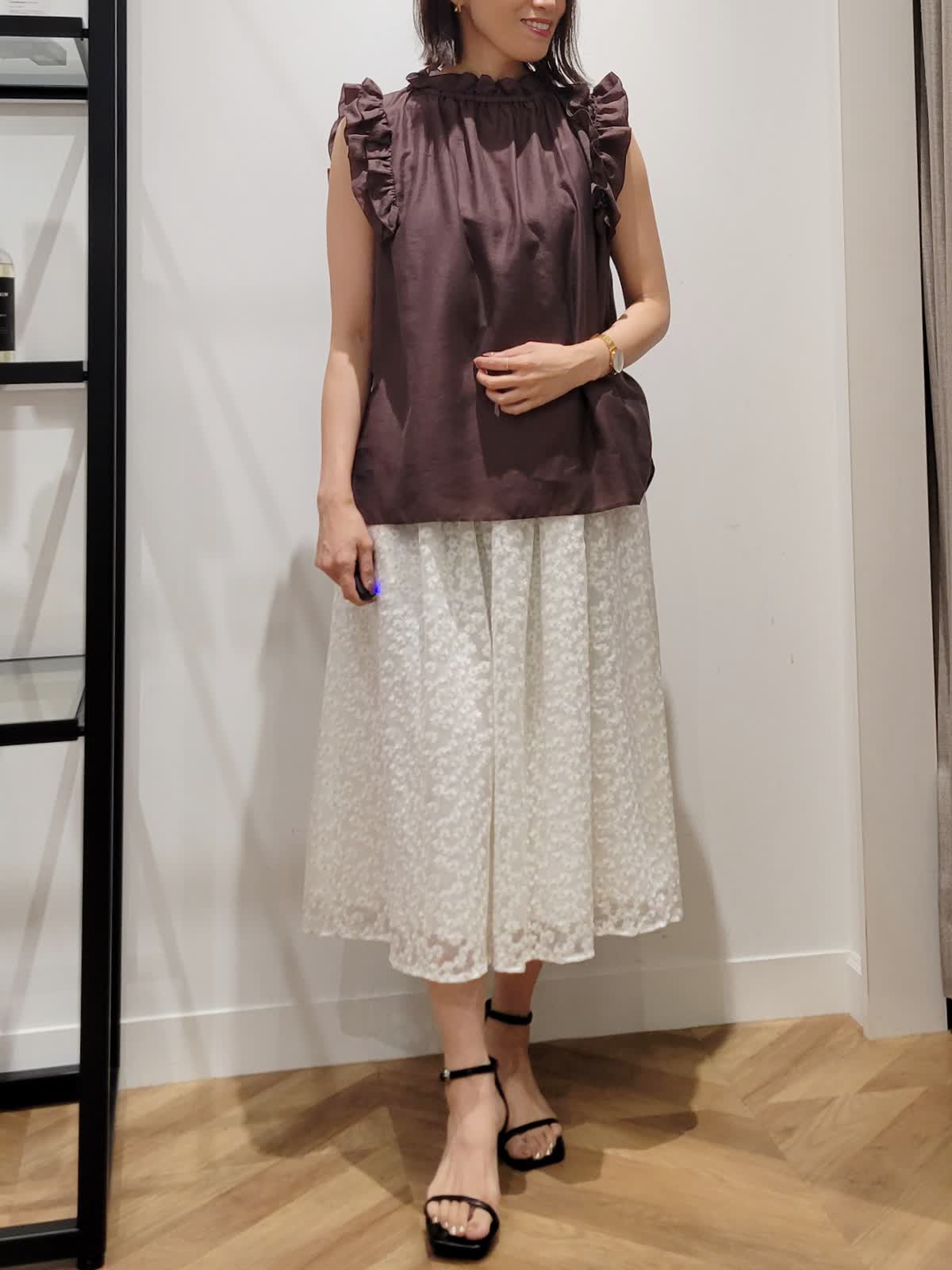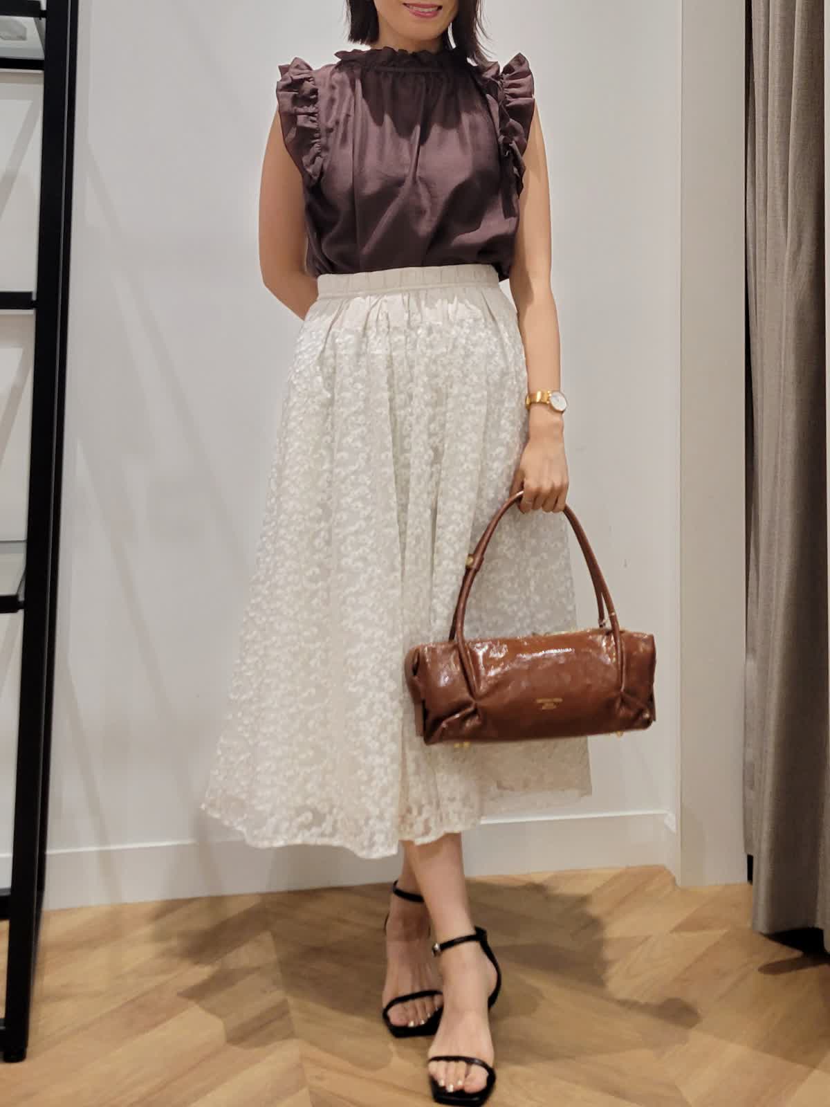 【着用サイズ】ブラウス:ダークブラウン:9号 スカート:オフホワイト:9号 秋のフェミニンスタイル。 お袖と首もとのフリルがか可愛いくさらに二段階フリルで二の腕もカバーしてくれます。首のみゴムが入っています。後ろボタンあり。胸回りなどゆったりした作り。いつもより1つ下のサイズも大丈夫ですがサイズによって袖の長さがかわるので腕が見えすぎない方がお好きでしたらいつものサイズがおすすめです。スカートはよく見るとお花の刺繍。 ウエストの切り返しがあるので広がりすぎず上品なAラインに。ウエストはゴム仕様。エアリーな素材感と裾の透け感が大人可愛いスカートです。