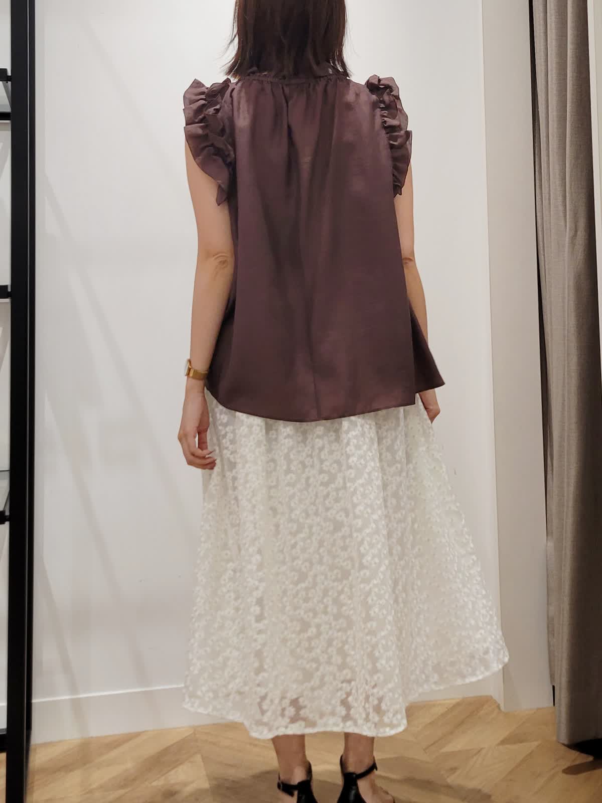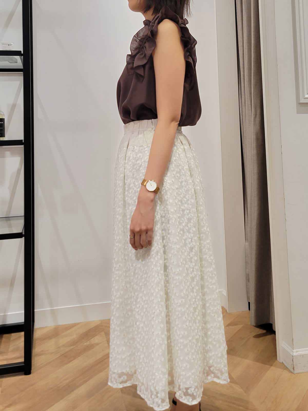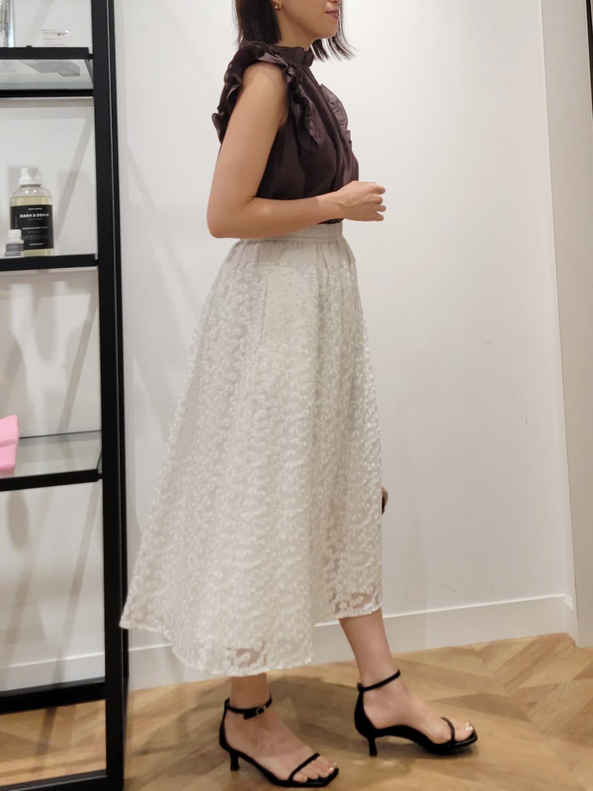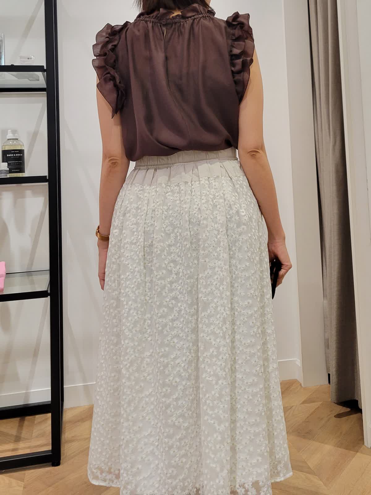 【着用サイズ】ブラウス:ダークブラウン:9号 スカート:オフホワイト:9号 秋のフェミニンスタイル。 お袖と首もとのフリルがか可愛いくさらに二段階フリルで二の腕もカバーしてくれます。首のみゴムが入っています。後ろボタンあり。胸回りなどゆったりした作り。いつもより1つ下のサイズも大丈夫ですがサイズによって袖の長さがかわるので腕が見えすぎない方がお好きでしたらいつものサイズがおすすめです。スカートはよく見るとお花の刺繍。 ウエストの切り返しがあるので広がりすぎず上品なAラインに。ウエストはゴム仕様。エアリーな素材感と裾の透け感が大人可愛いスカートです。