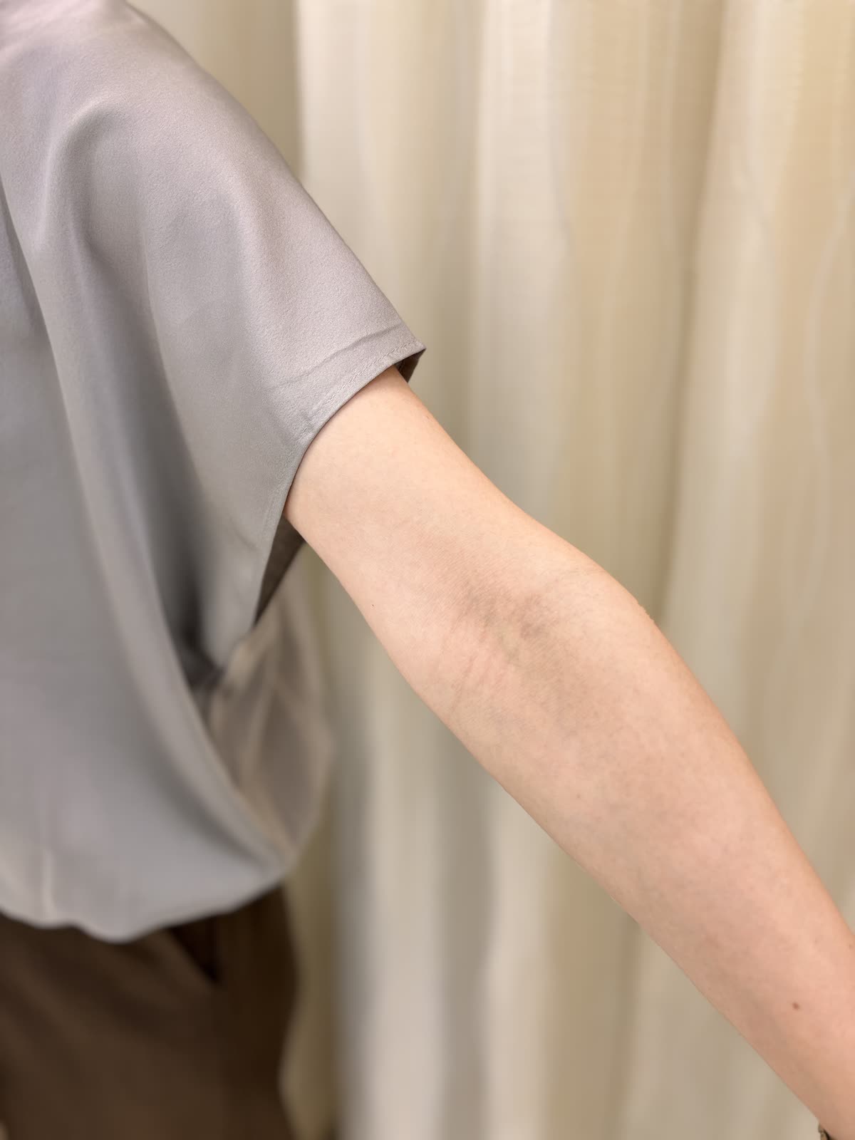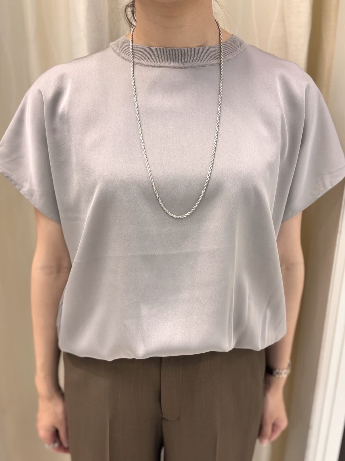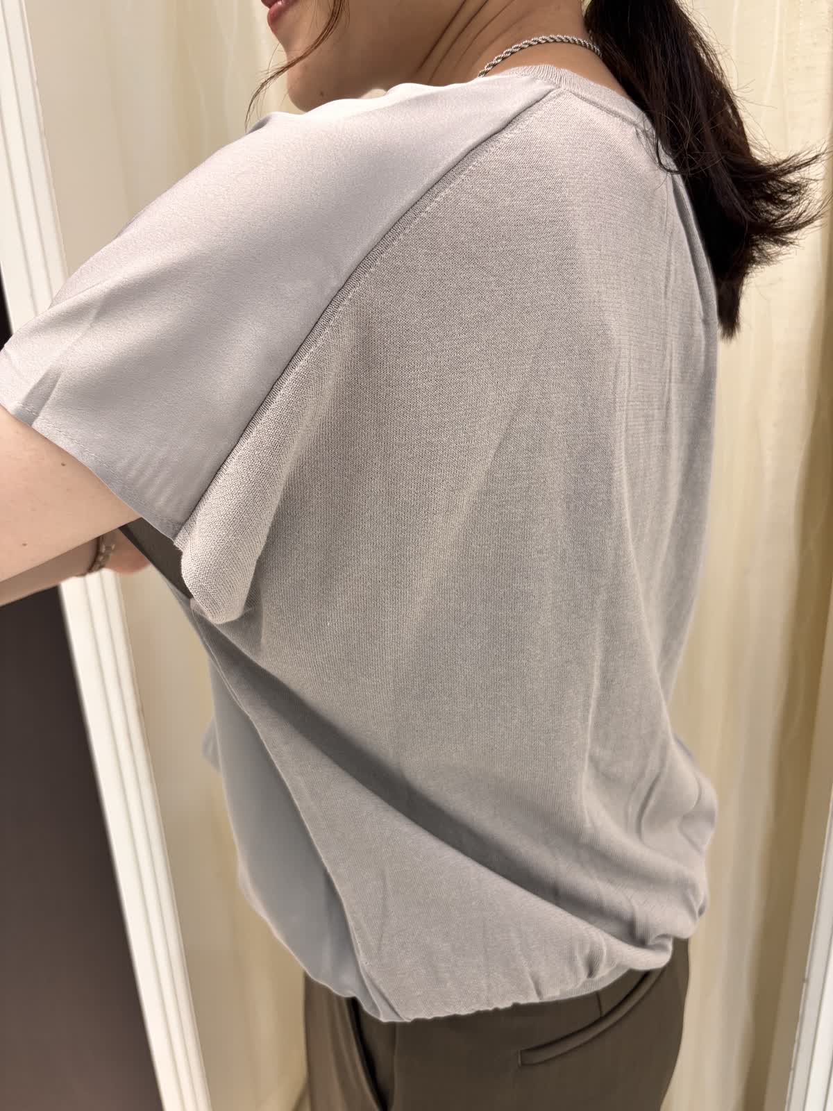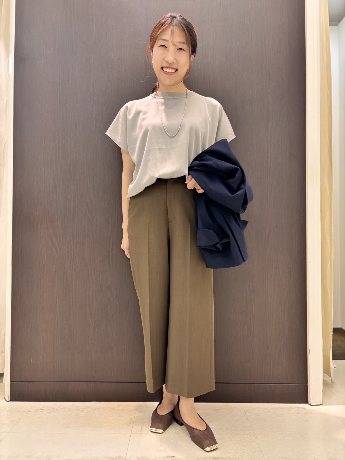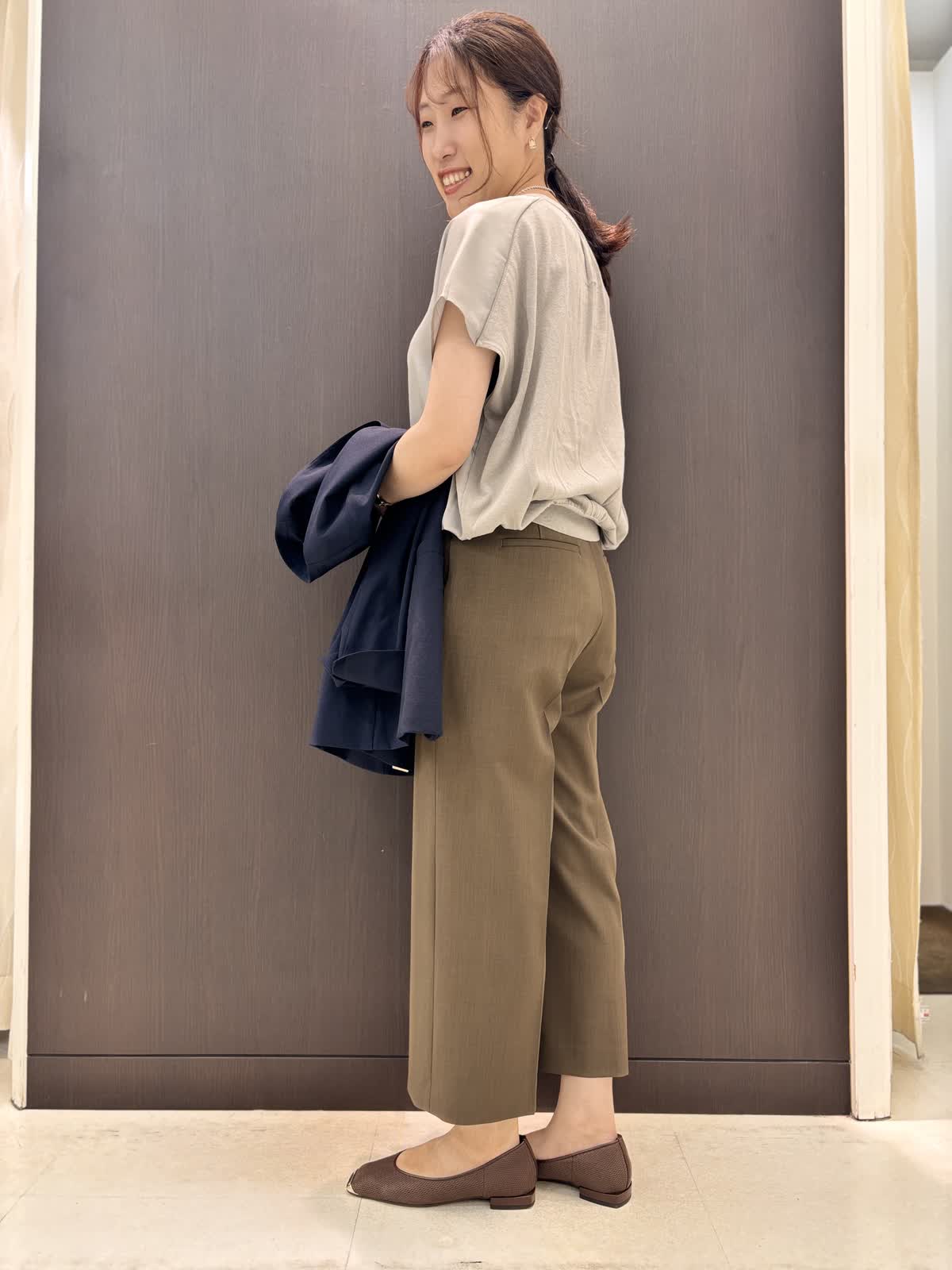 ジャケットのインナーにはデザインに奥行きのあるサテンドッキングニットがおすすめです。ニット自体は薄手ですが、表見がサテンなので上品さがあります。ジャケットのインナーに半袖なら10月まではしっかり着れそう。インするのが苦手な方にも安心なすそリブで、リブもゆったりしたサイズのゴム仕様なのでぽっこりお腹はごまかせます!まだ暑さが残る時期からでも履けるのはクロップド丈のセミワイドパンツです。サラッとしたキレイな目面なのでビジネスシーンにピッタリです。ウエストはいつものサイズ感を選んでピッタリです。