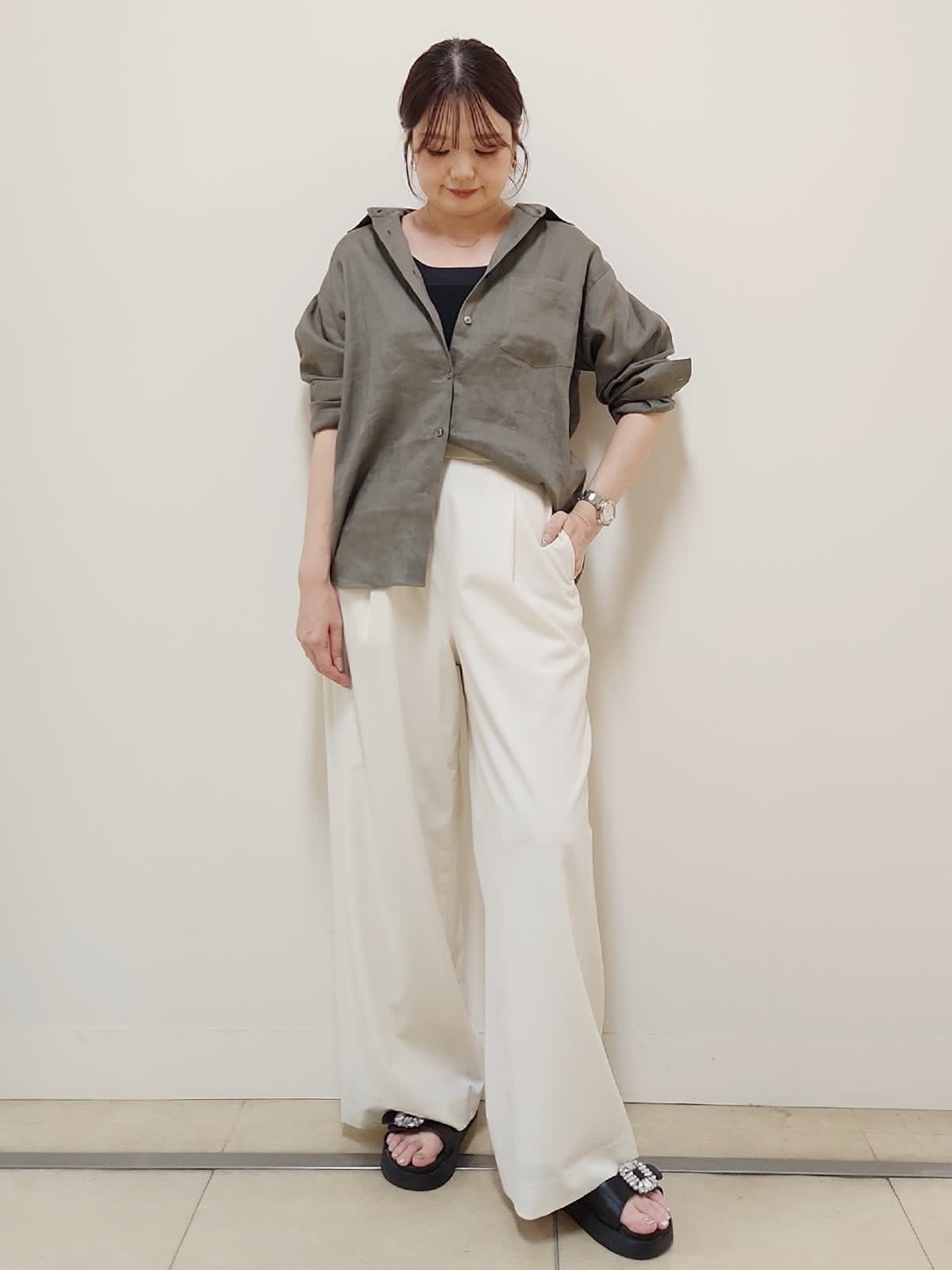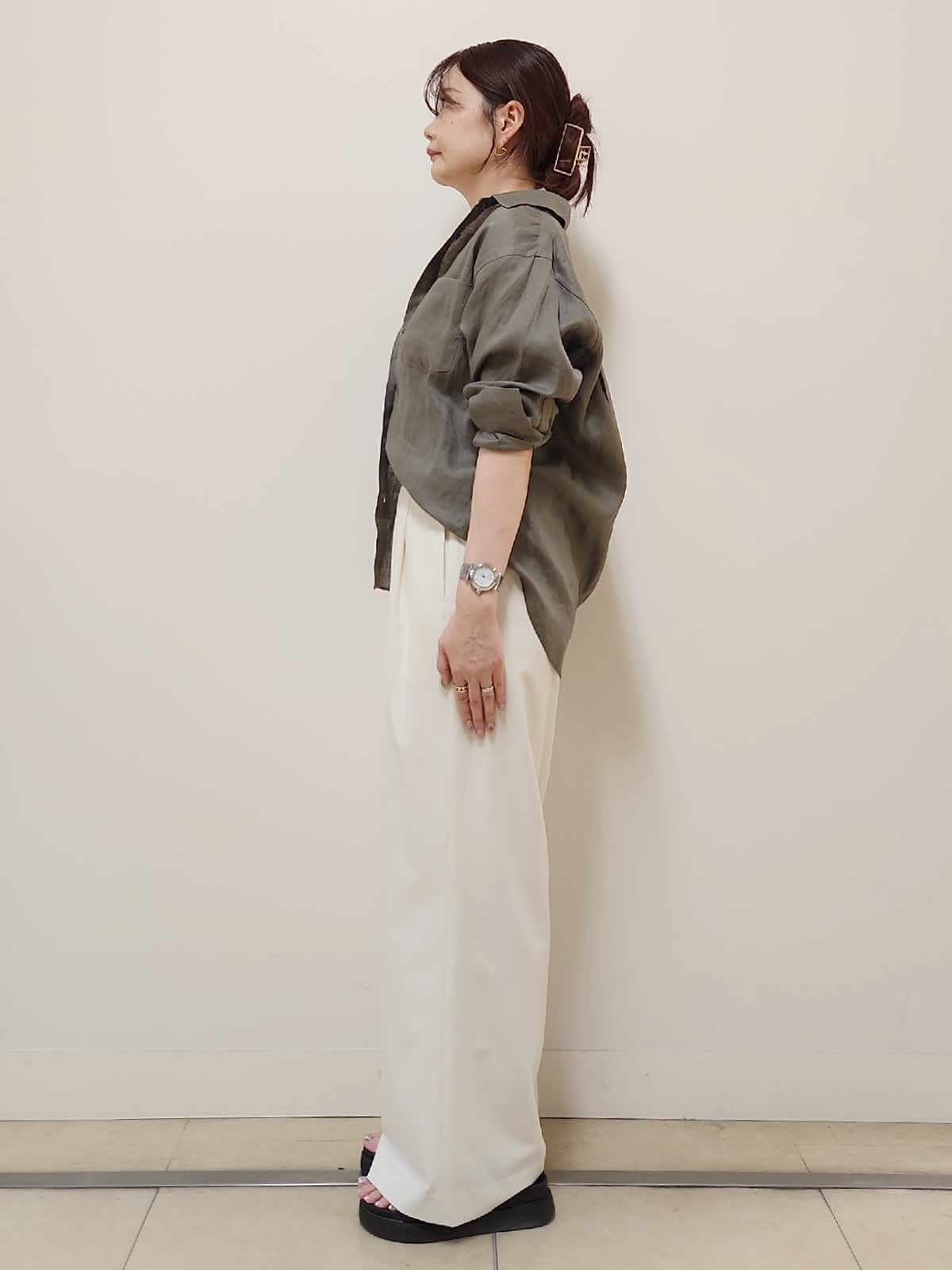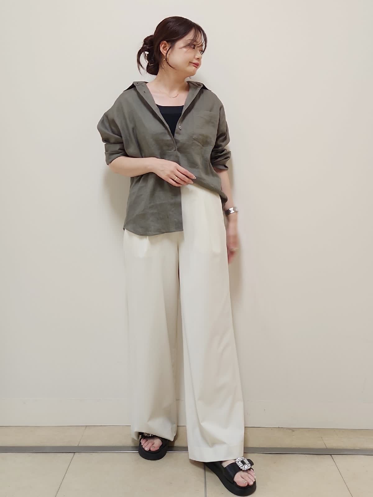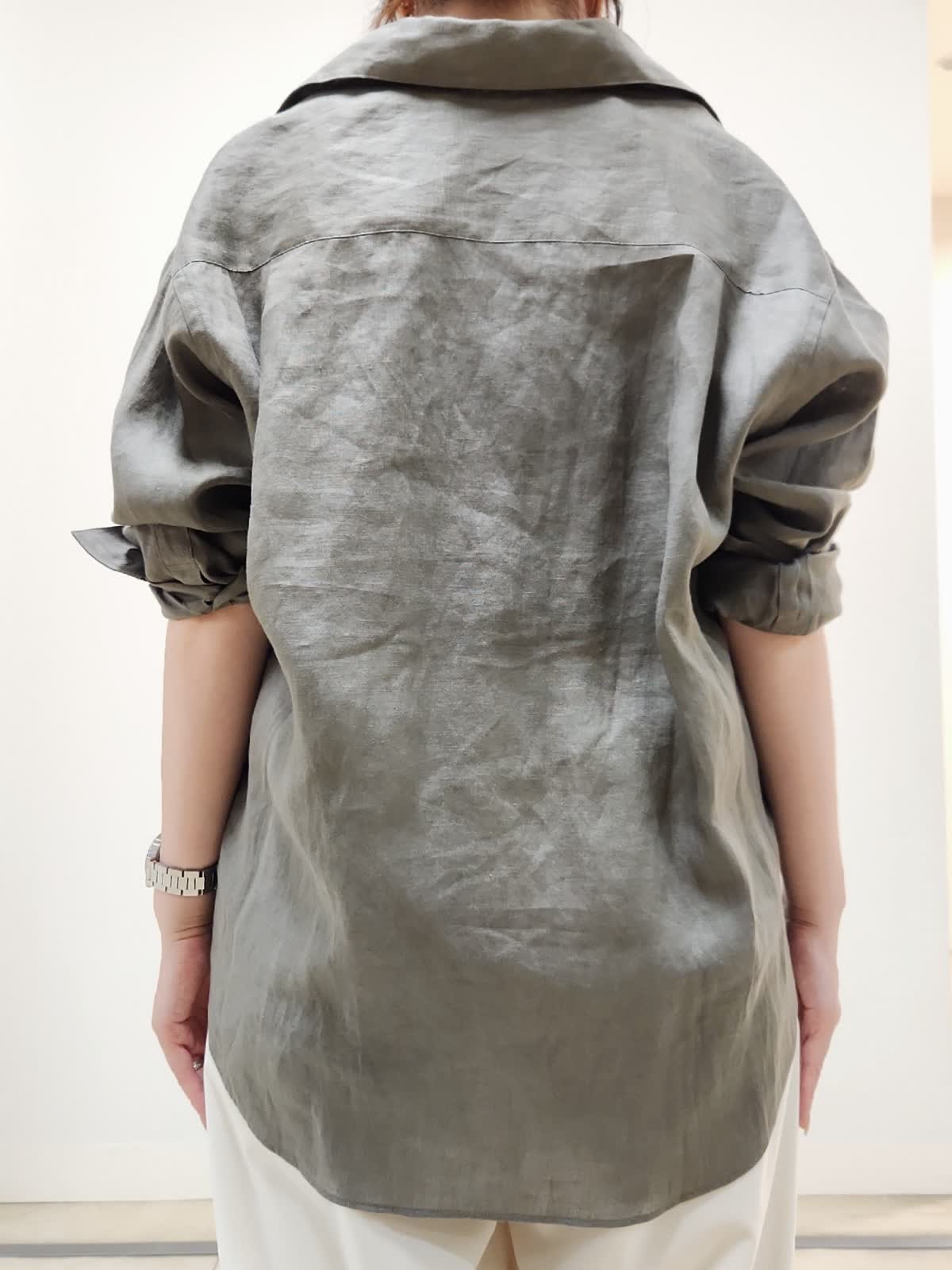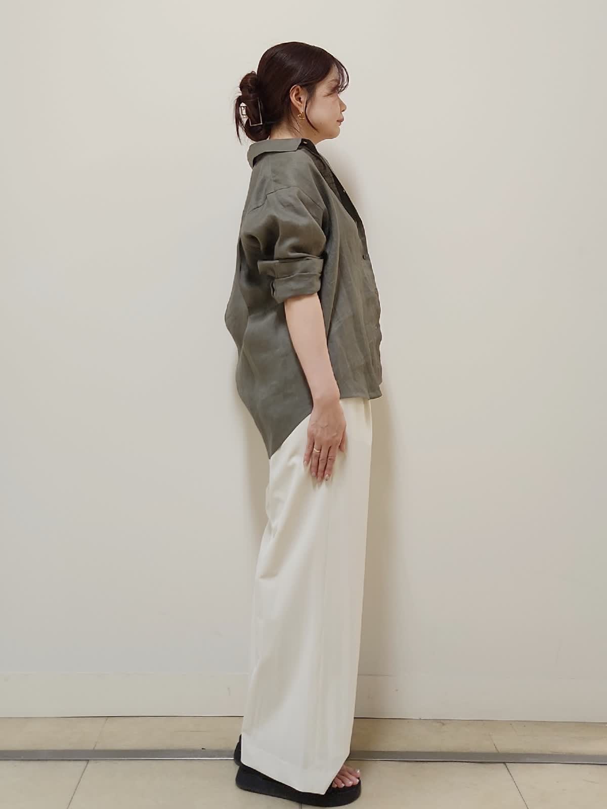 【着用サイズ】シャツ:7号/カーキ パンツ:9号/オフホワイト 秋まで着まわせるリネンシャツコーデ。リネン(麻)100%で涼しくて着心地◎夏は袖をまくって、秋は長袖で着るのがオススメ。毛羽立ちにくい上品な素材なのも嬉しいポイント。普段9号着用しておりますが、こちらはゆったりめのサイズ感なので7号着用。パンツも真っ白すぎないオフホワイトのカラーで裏地付きなので下着も透けにくいです!ウエストゴムでゆとり有って履きやすいです◎