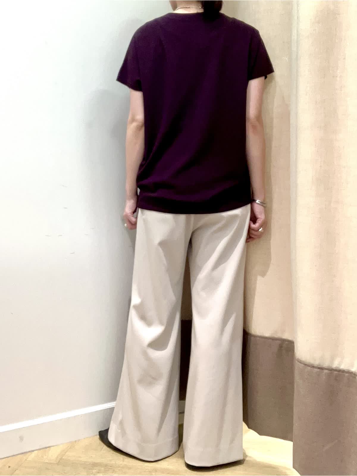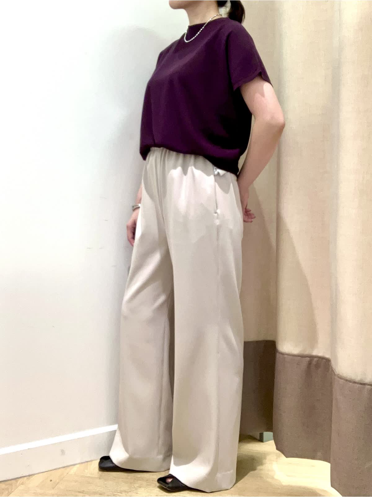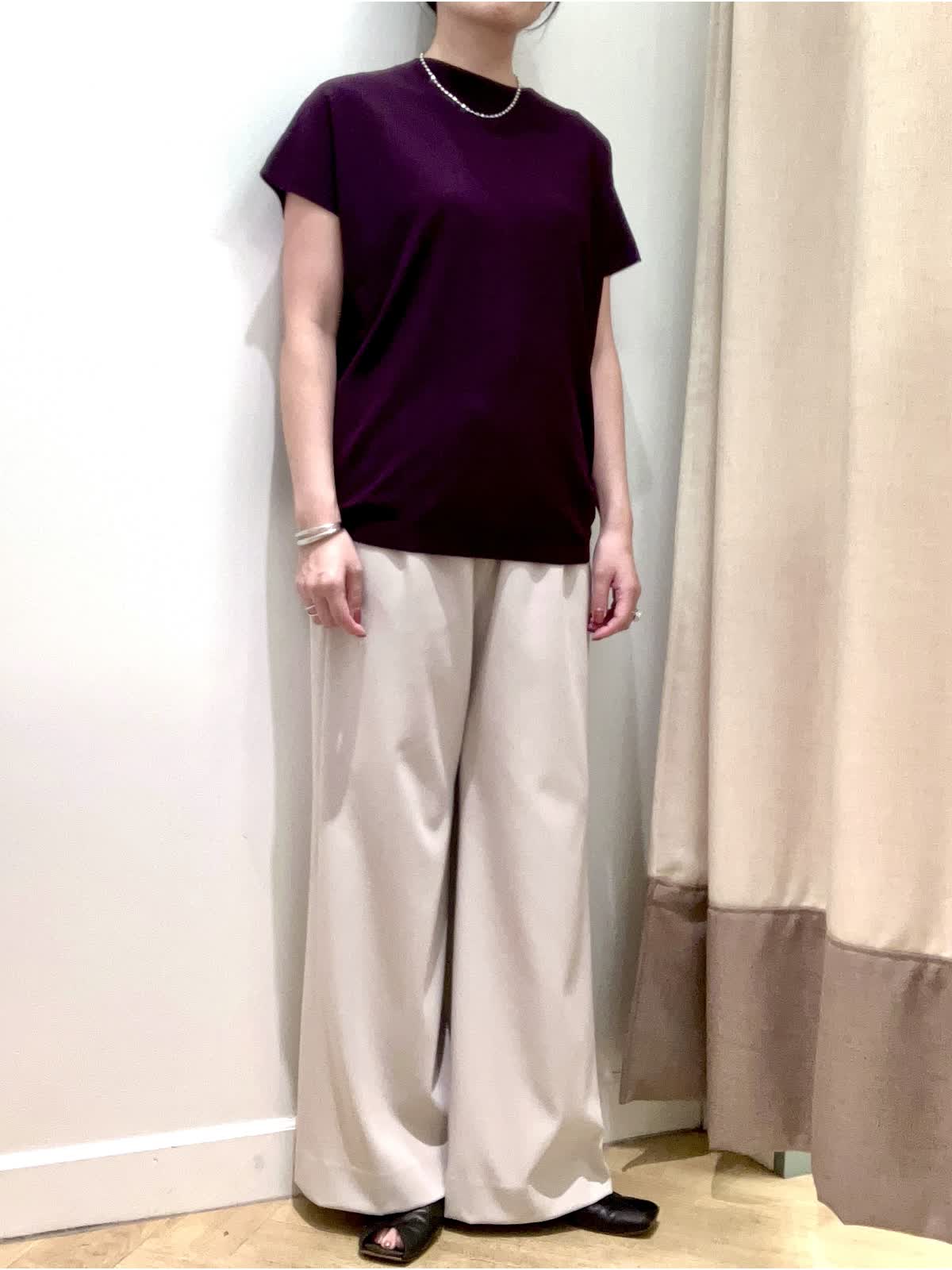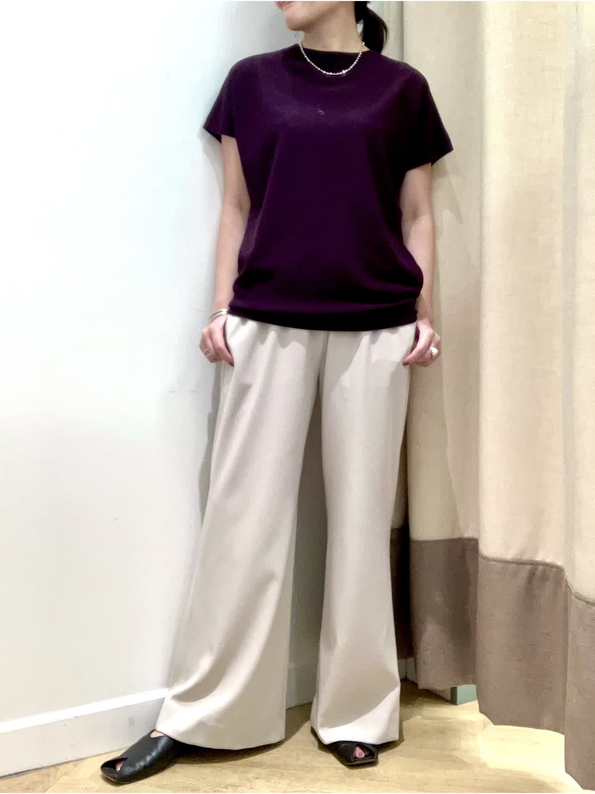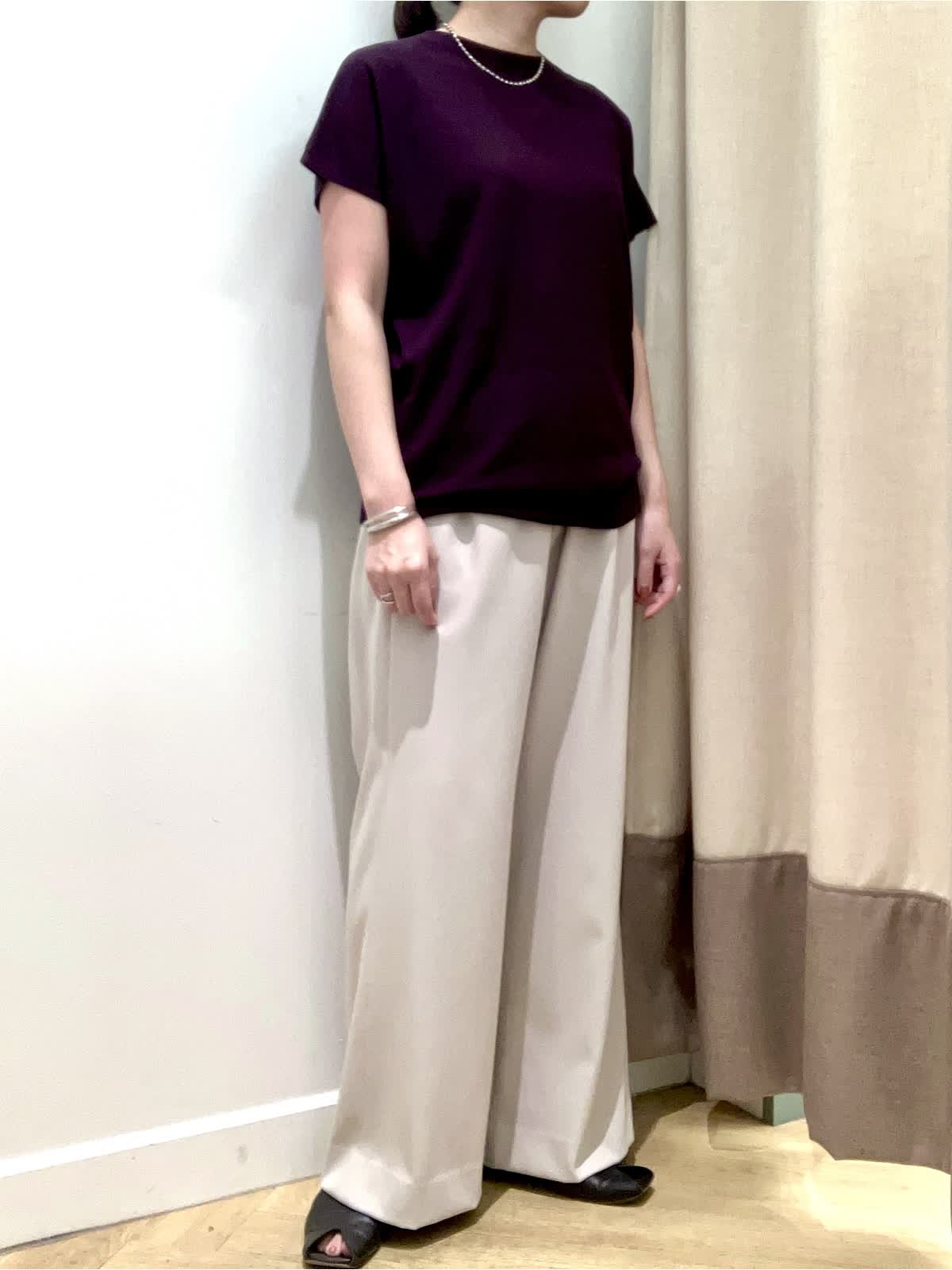 【着用サイズ】全て9号【着用カラー】ニット:エンジ パンツ:ベージュ 夏から秋へのスイッチシーズンに頼りになるニットとパンツ。暑いけど、どこか秋を感じさせたい≠叶えてくれるコーディネート。キュプラ混素材のニットは汗によるベタつきを抑え、すぐに戦力になってくれます。