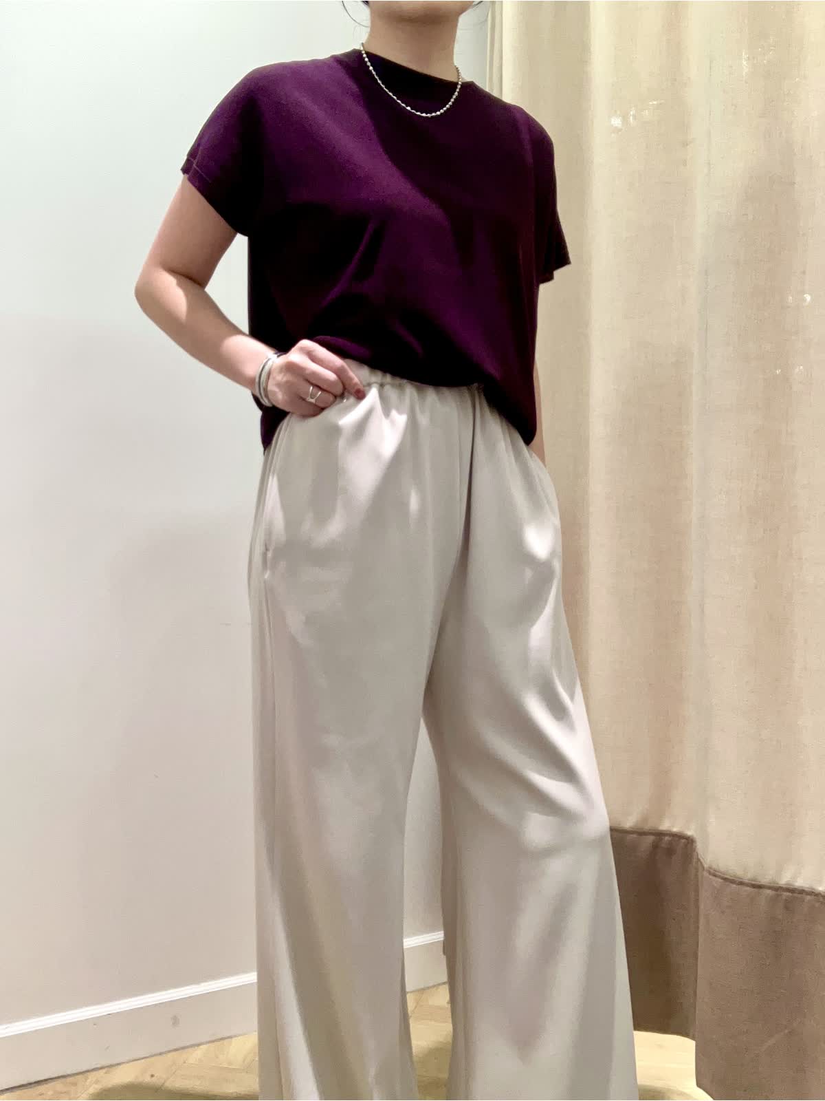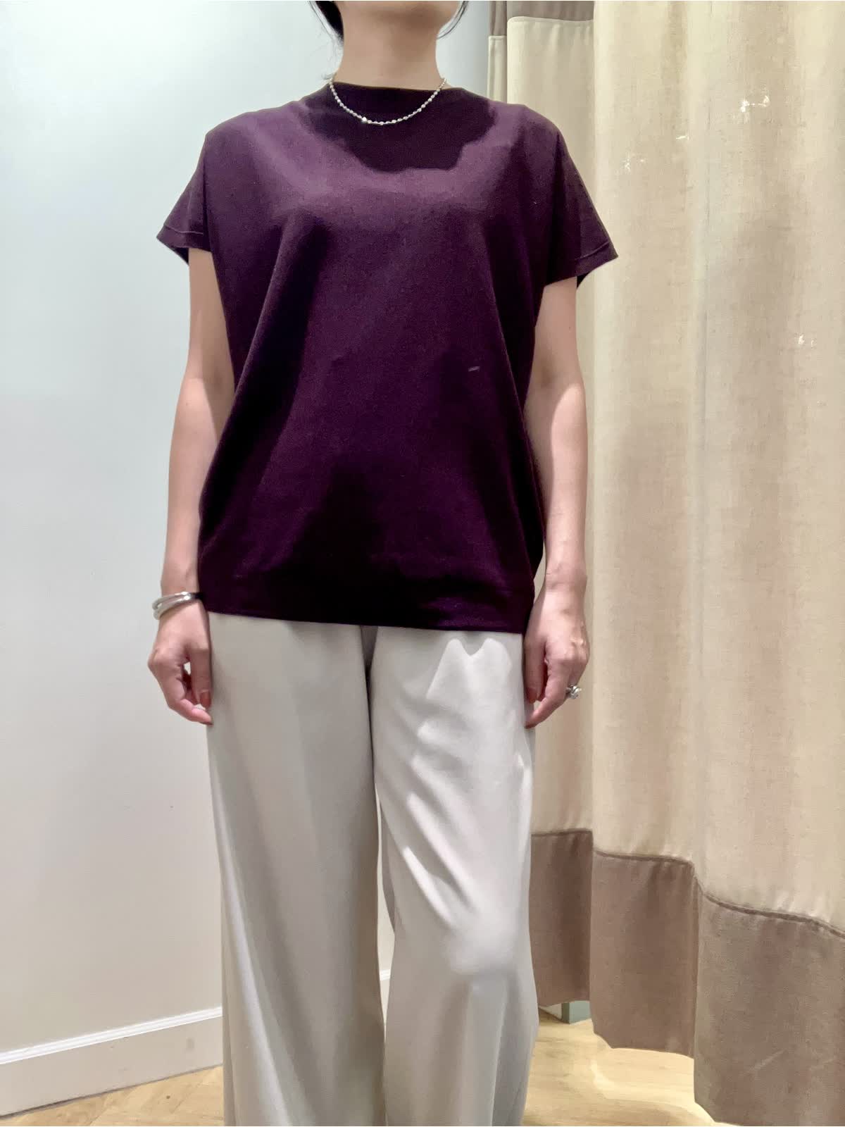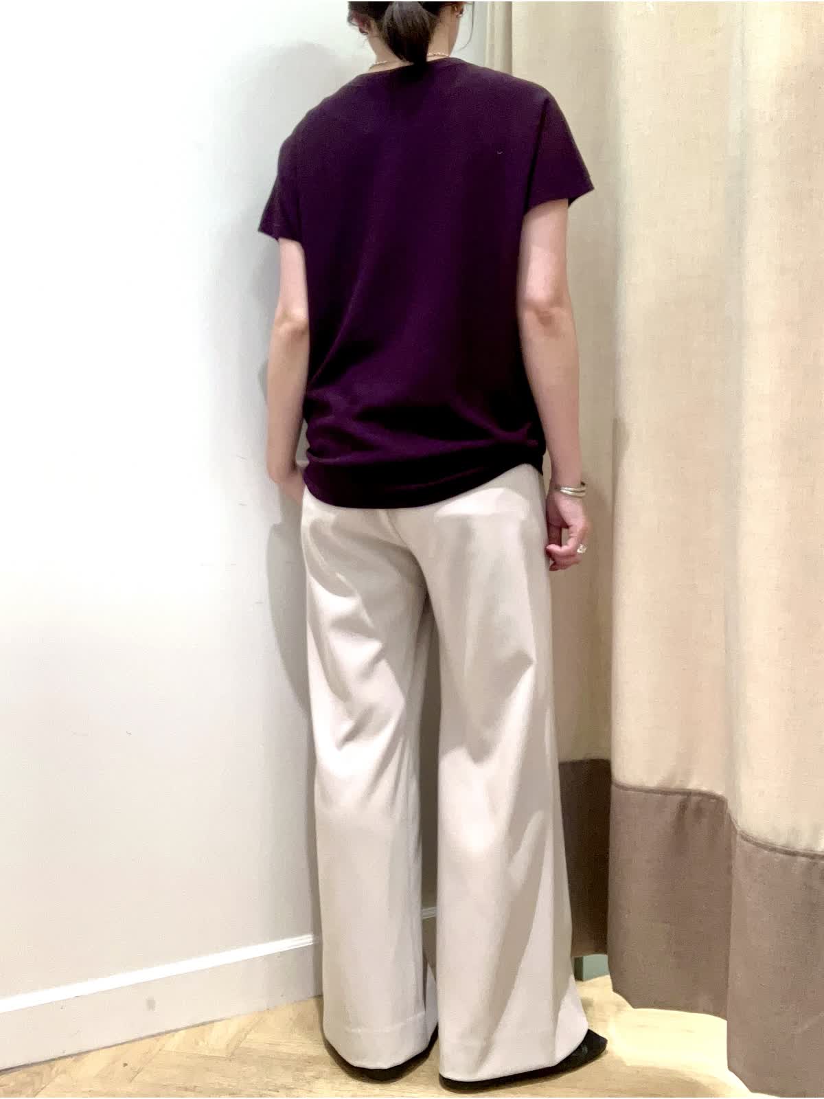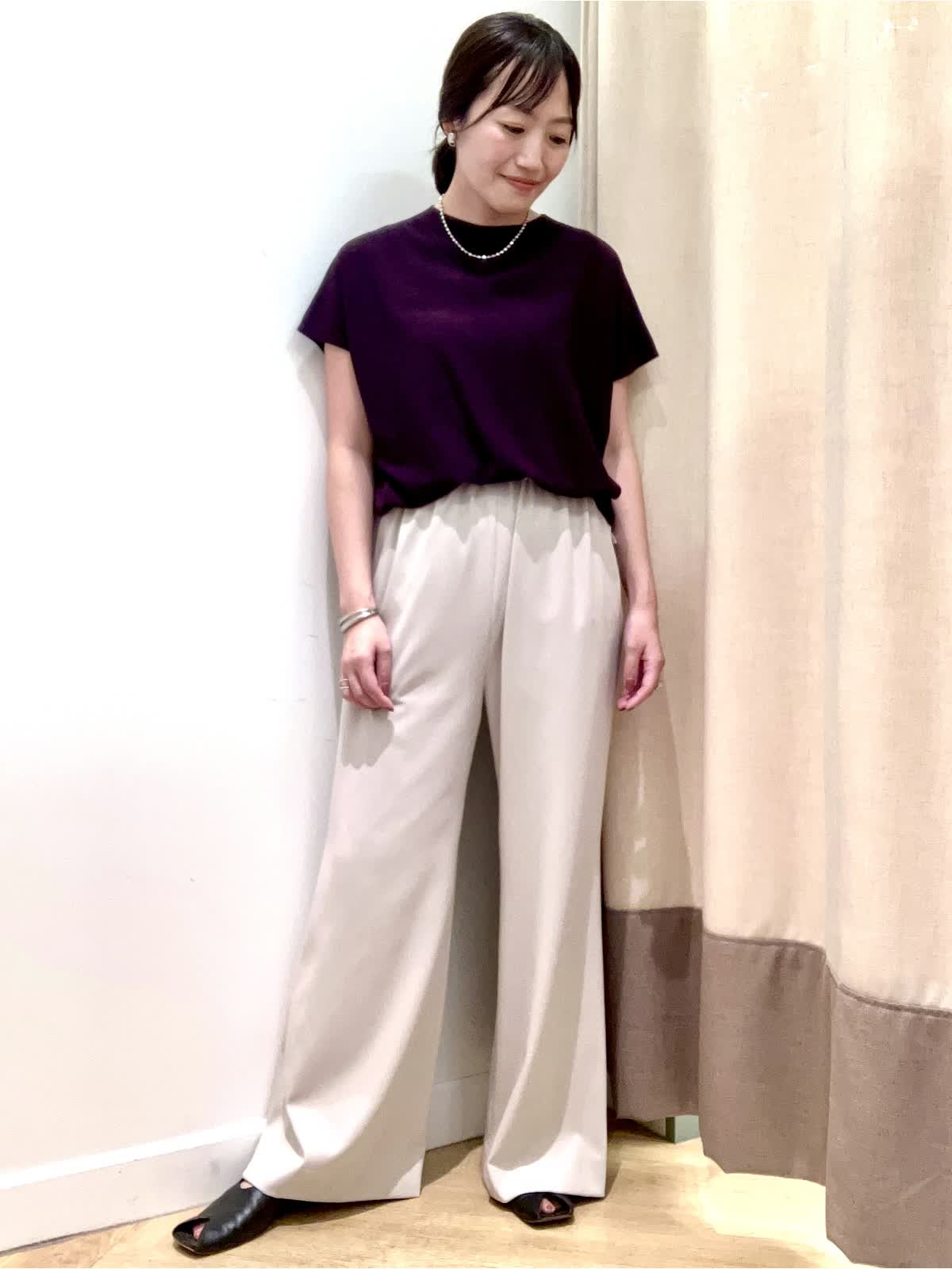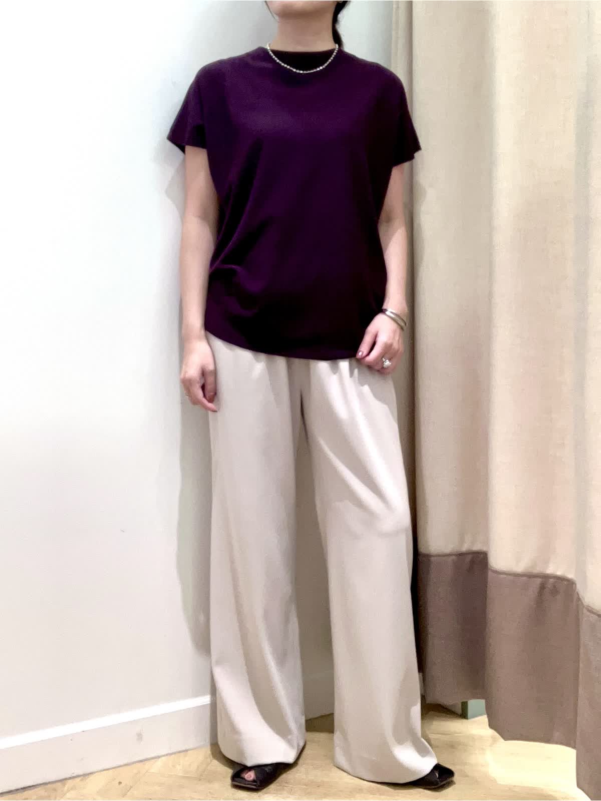 【着用サイズ】全て9号【着用カラー】ニット:エンジ パンツ:ベージュ 夏から秋へのスイッチシーズンに頼りになるニットとパンツ。暑いけど、どこか秋を感じさせたい≠叶えてくれるコーディネート。キュプラ混素材のニットは汗によるベタつきを抑え、すぐに戦力になってくれます。
