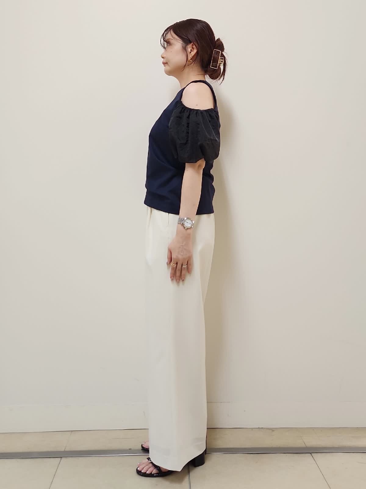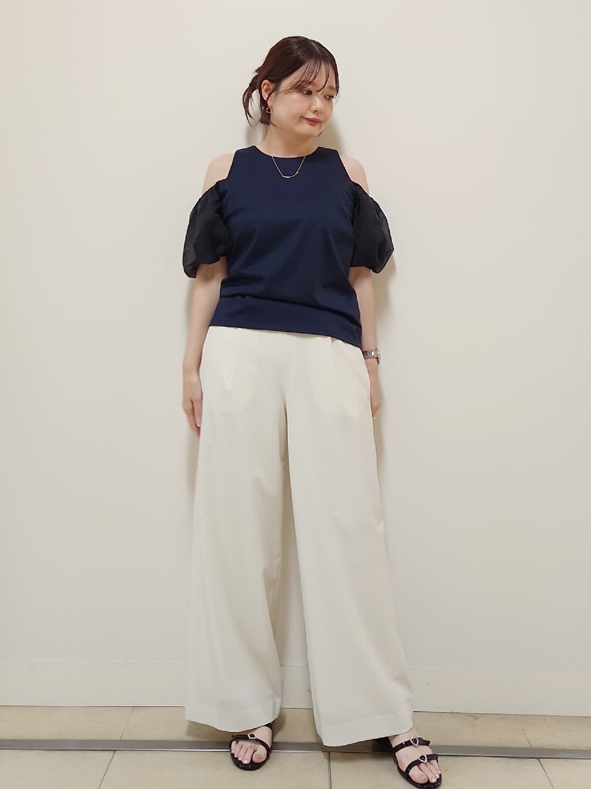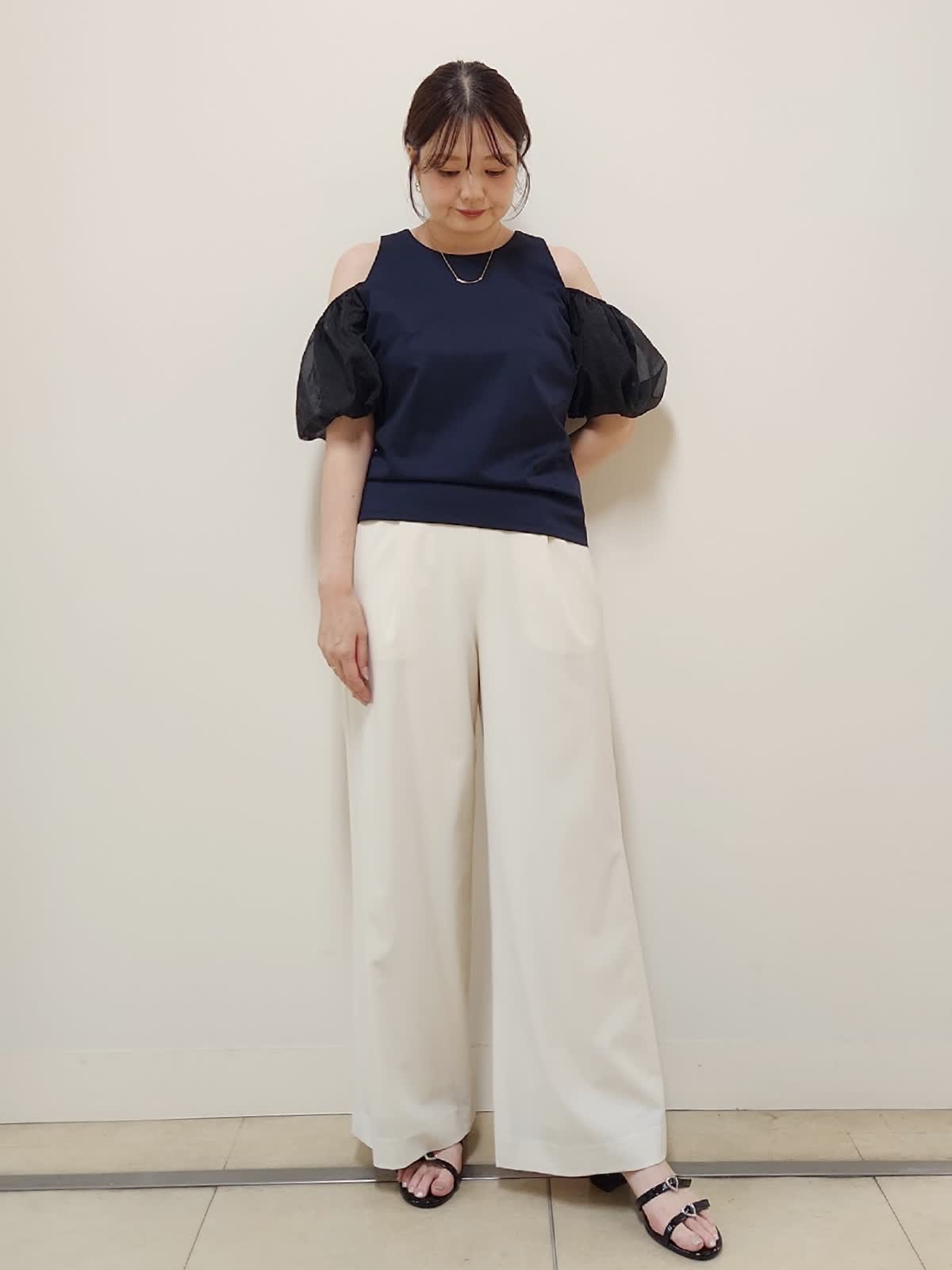 【着用サイズ】カットソー:9号/ネイビー パンツ:9号/オフホワイト ヘルシーな肌見せが大人可愛いコラボカットソー。ネイビーは大人っぽく着ていただけて個人的に一番おすすめ。イージーパンツと合わせると、こなれ感も出ます♪カットソーのサイズ感はコンパクトです。着丈もスッキリしているのでアウトで着用してもバランス良かったです。