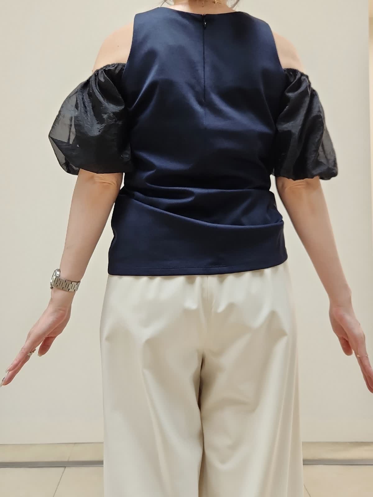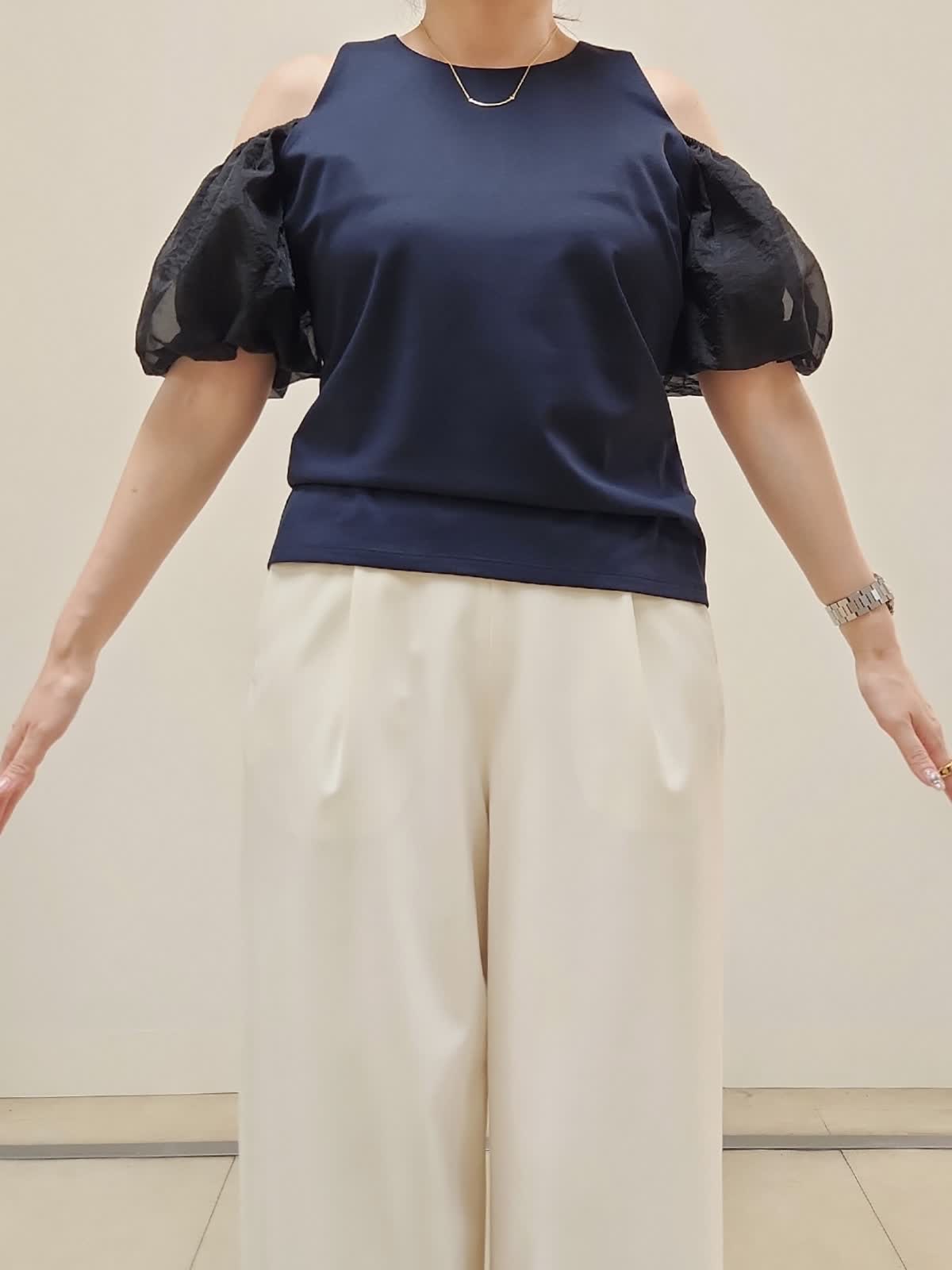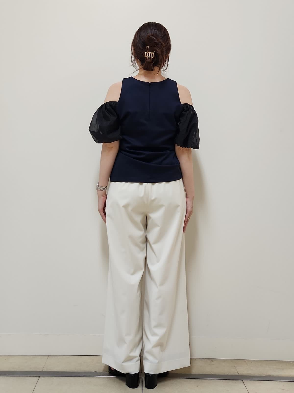 【着用サイズ】カットソー:9号/ネイビー パンツ:9号/オフホワイト ヘルシーな肌見せが大人可愛いコラボカットソー。ネイビーは大人っぽく着ていただけて個人的に一番おすすめ。イージーパンツと合わせると、こなれ感も出ます♪カットソーのサイズ感はコンパクトです。着丈もスッキリしているのでアウトで着用してもバランス良かったです。