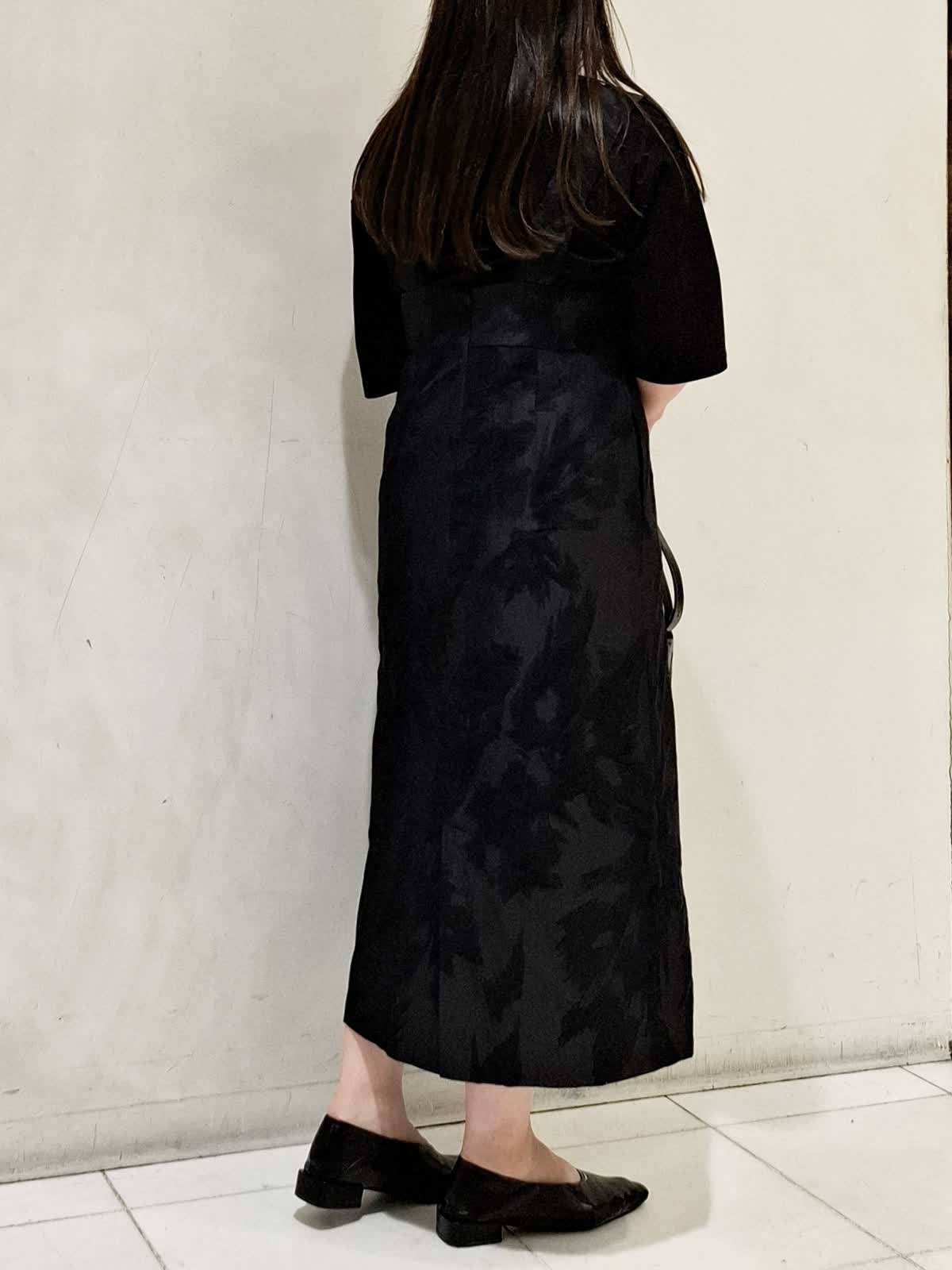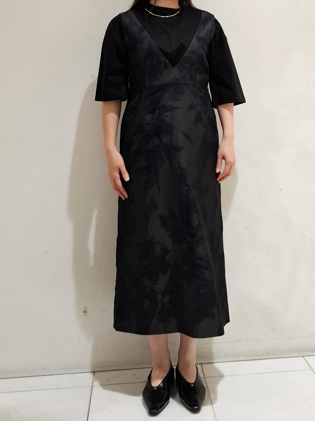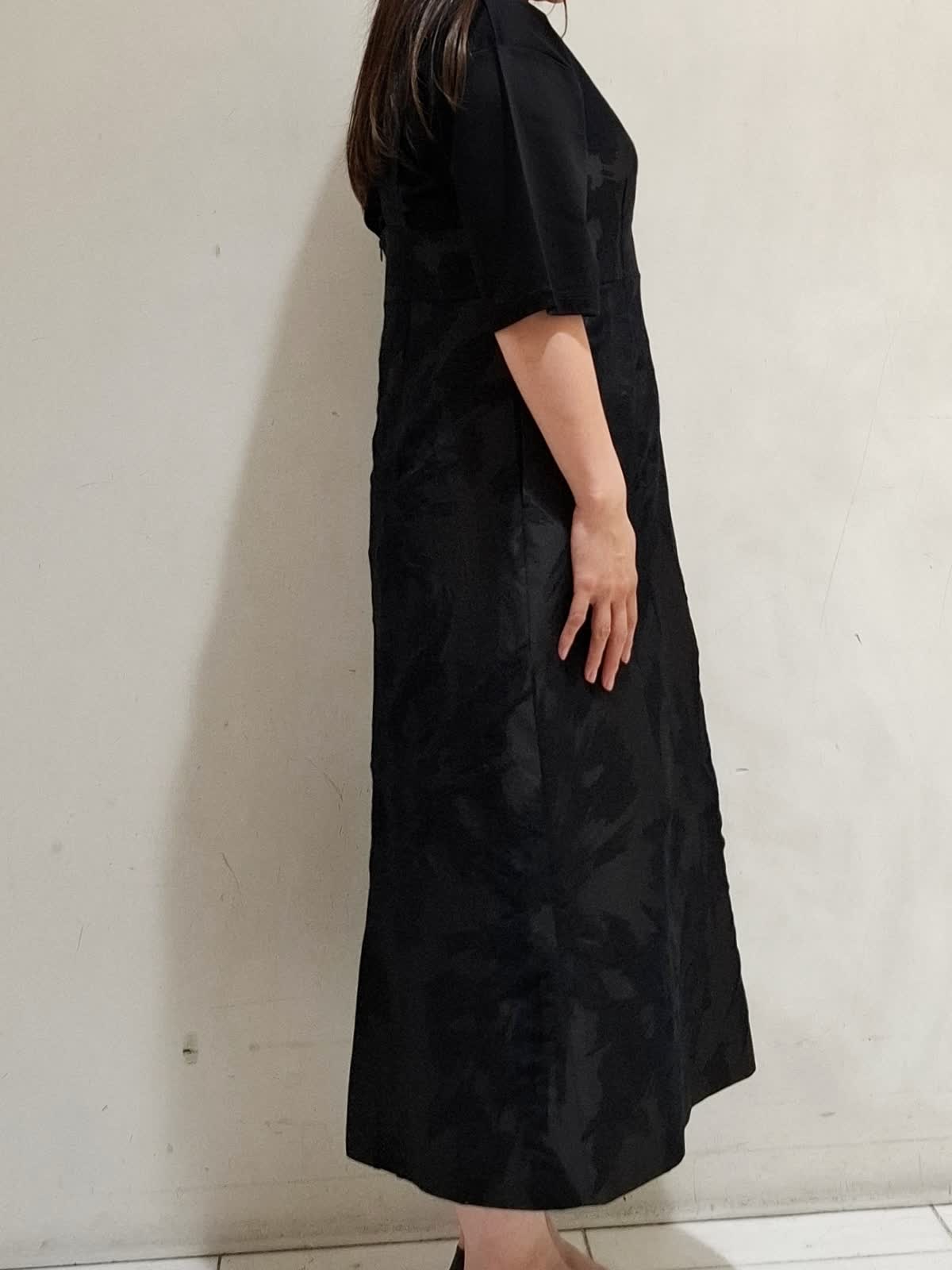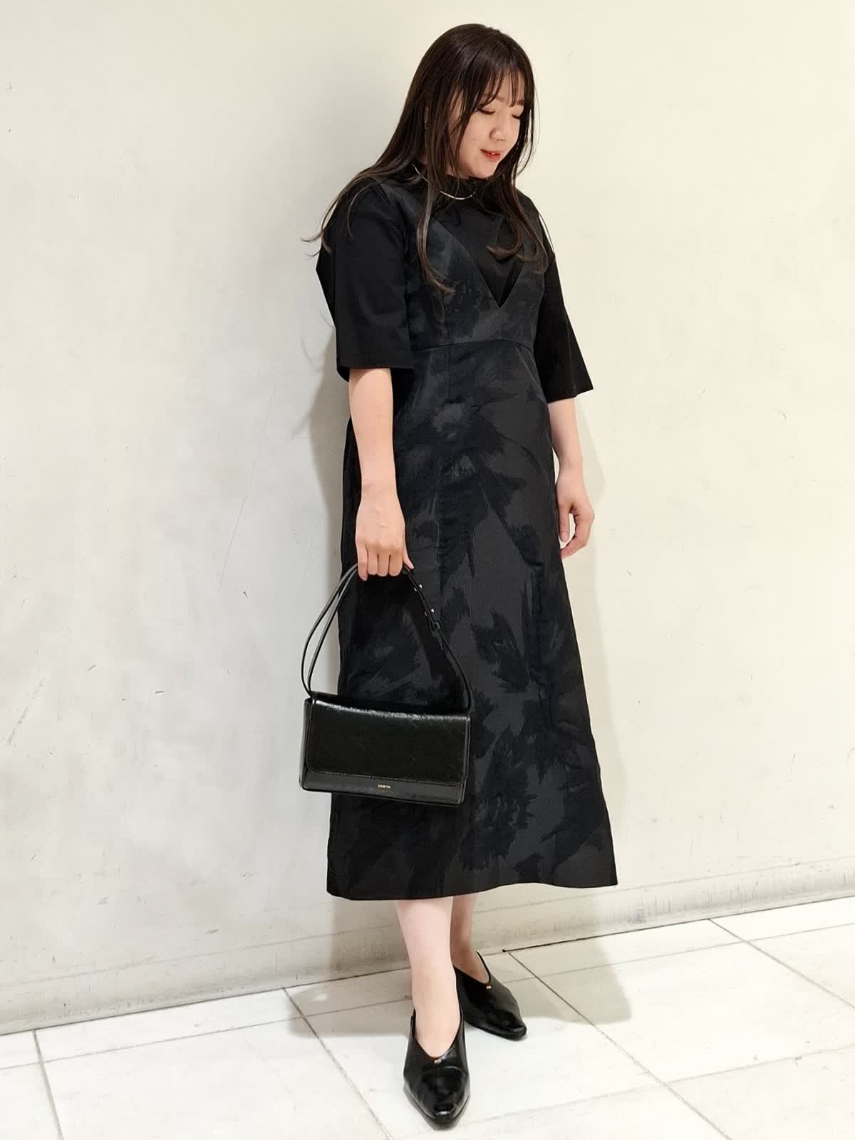 【着用サイズ】ワンピース:9号サイズ ブラック カットソー:フリーサイズ ブラック バック:フリーサイズ ブラック ワンピースは、表面に立体感のある素材で、身体のラインをひろわないゆったりとしたシルエットです。深めのVのデザインのため、合わせるインナーで雰囲気を変えて長いシーズン着ていただけます。