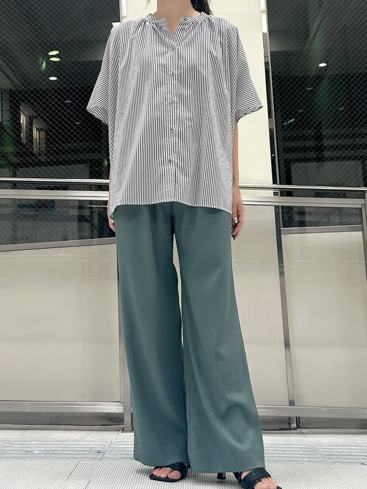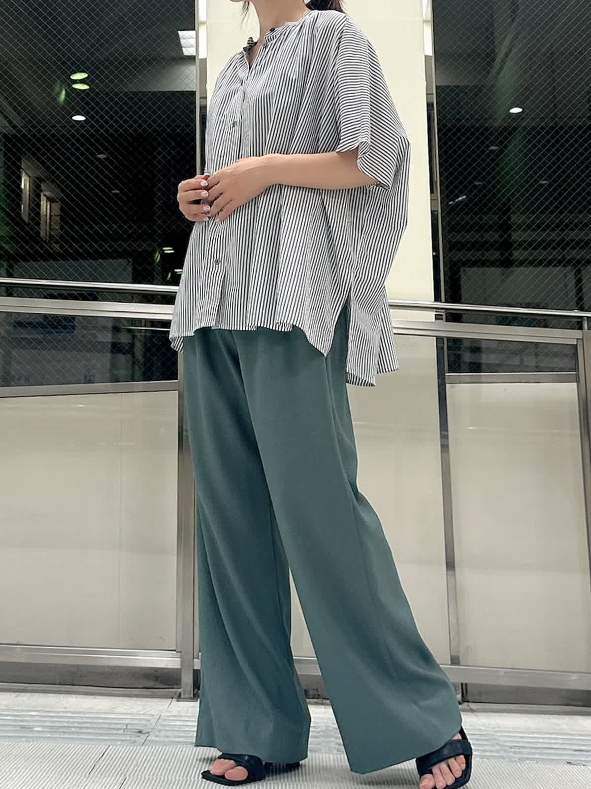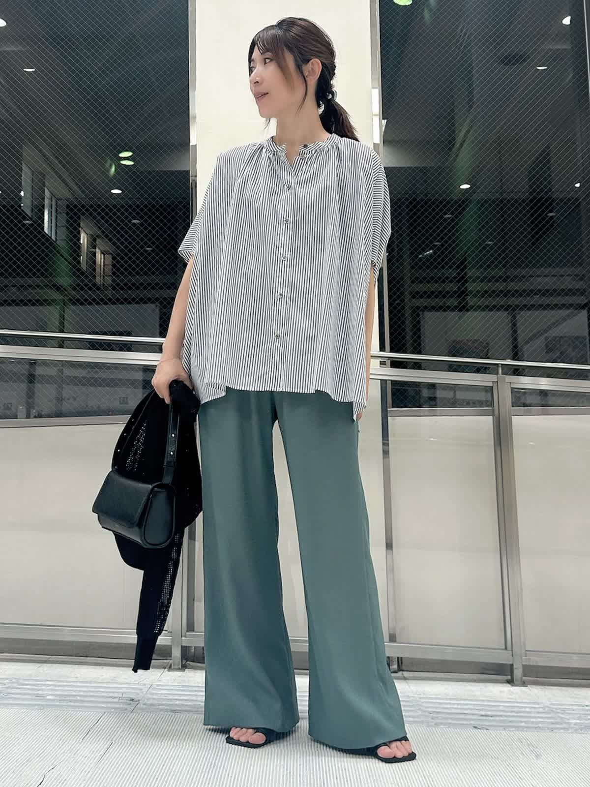 【 着用サイズ/カラー】 ブラウス:フリー/ストライプ パンツ:9号/グリーン いつものブラウススタイルにアクセントが加わり、簡単にこなれ感を手に入れられるストライプブラウス。前開きなので羽織りとしても◎ ボトムにグリーンをもってくるとぐっと洒落感がアップ。ウエストは総ゴムでストレスフリーです。