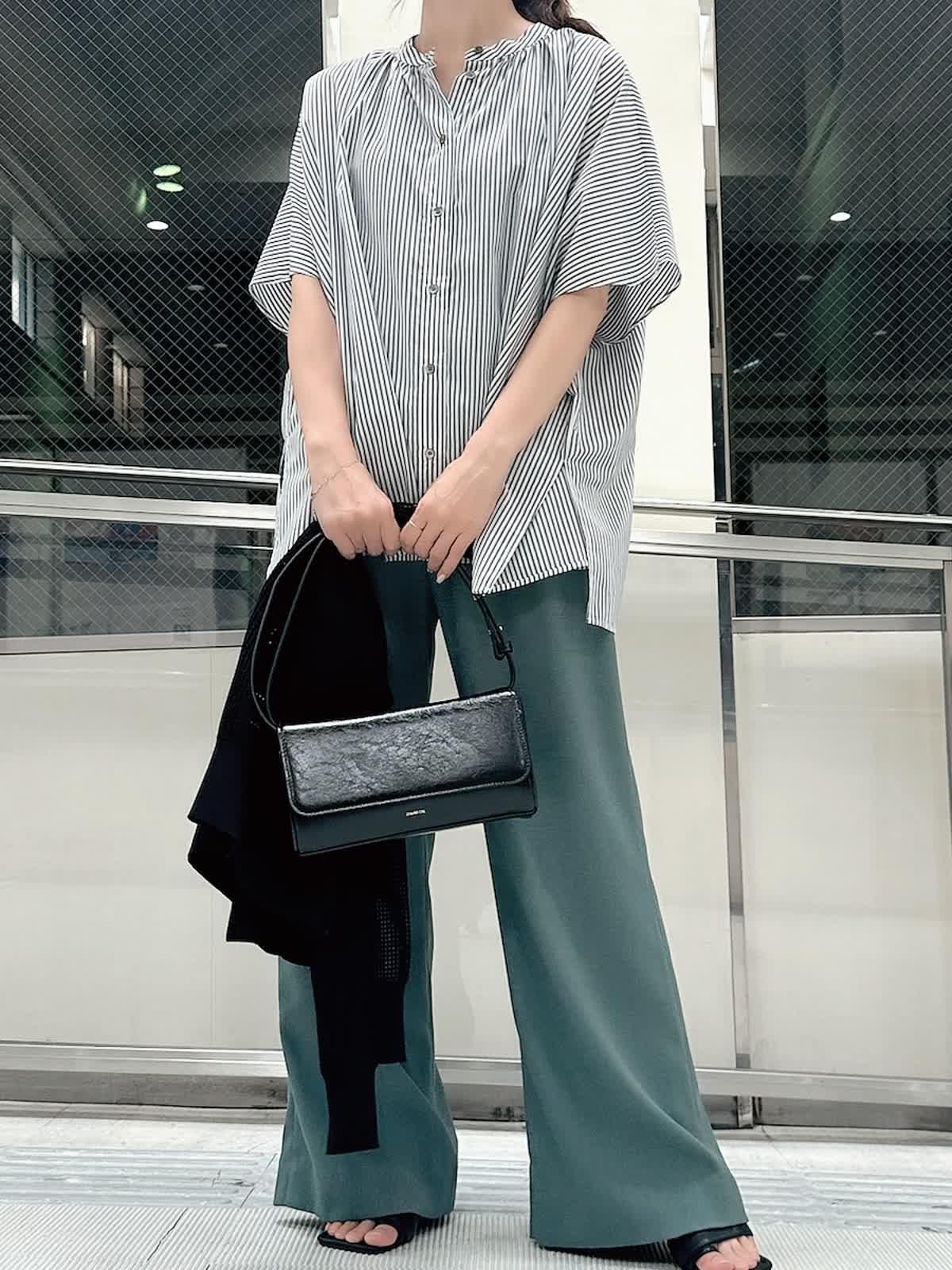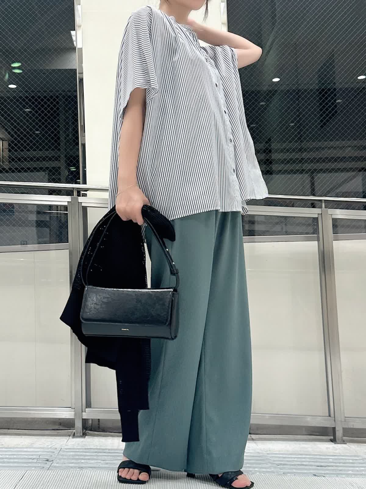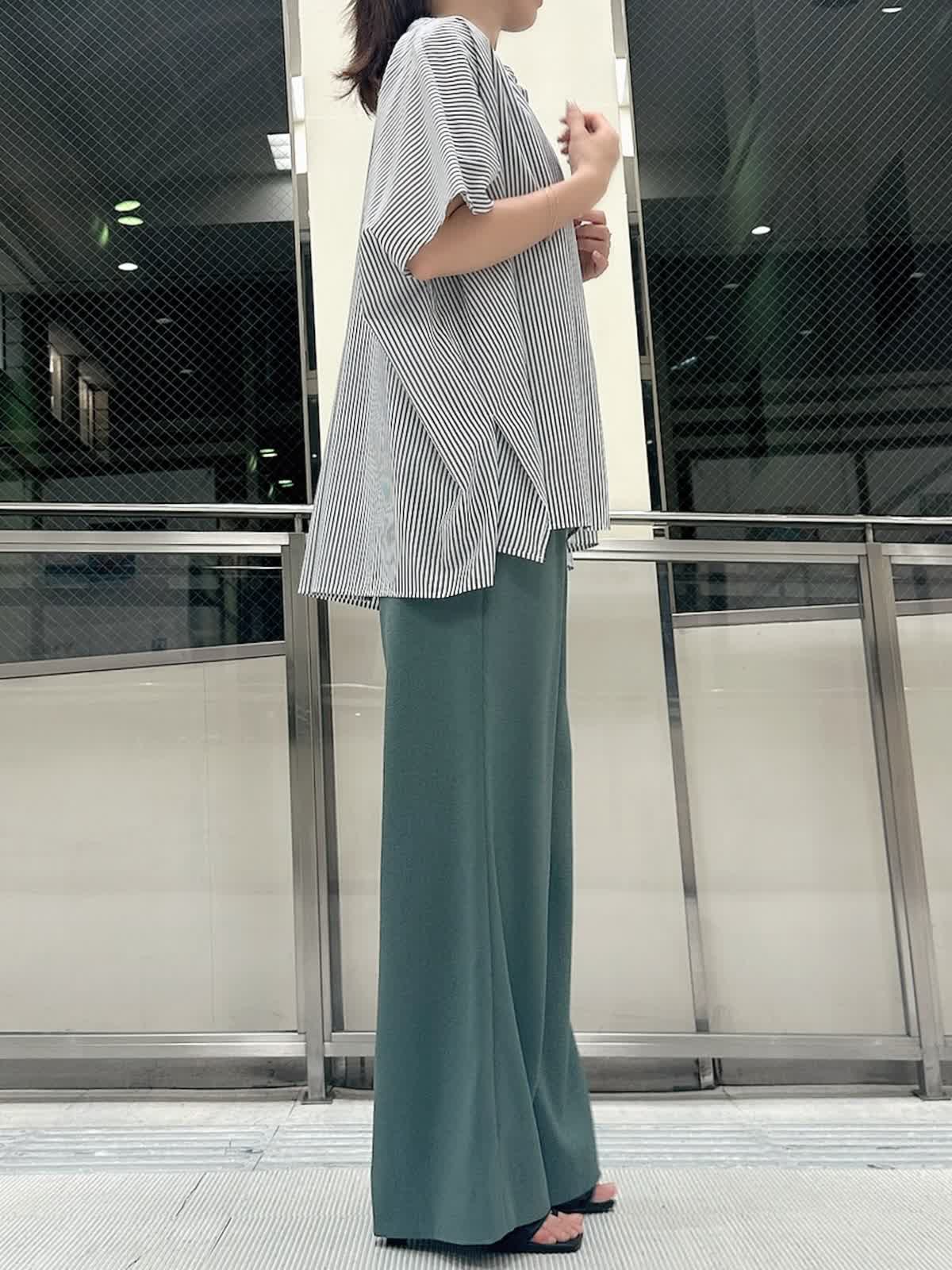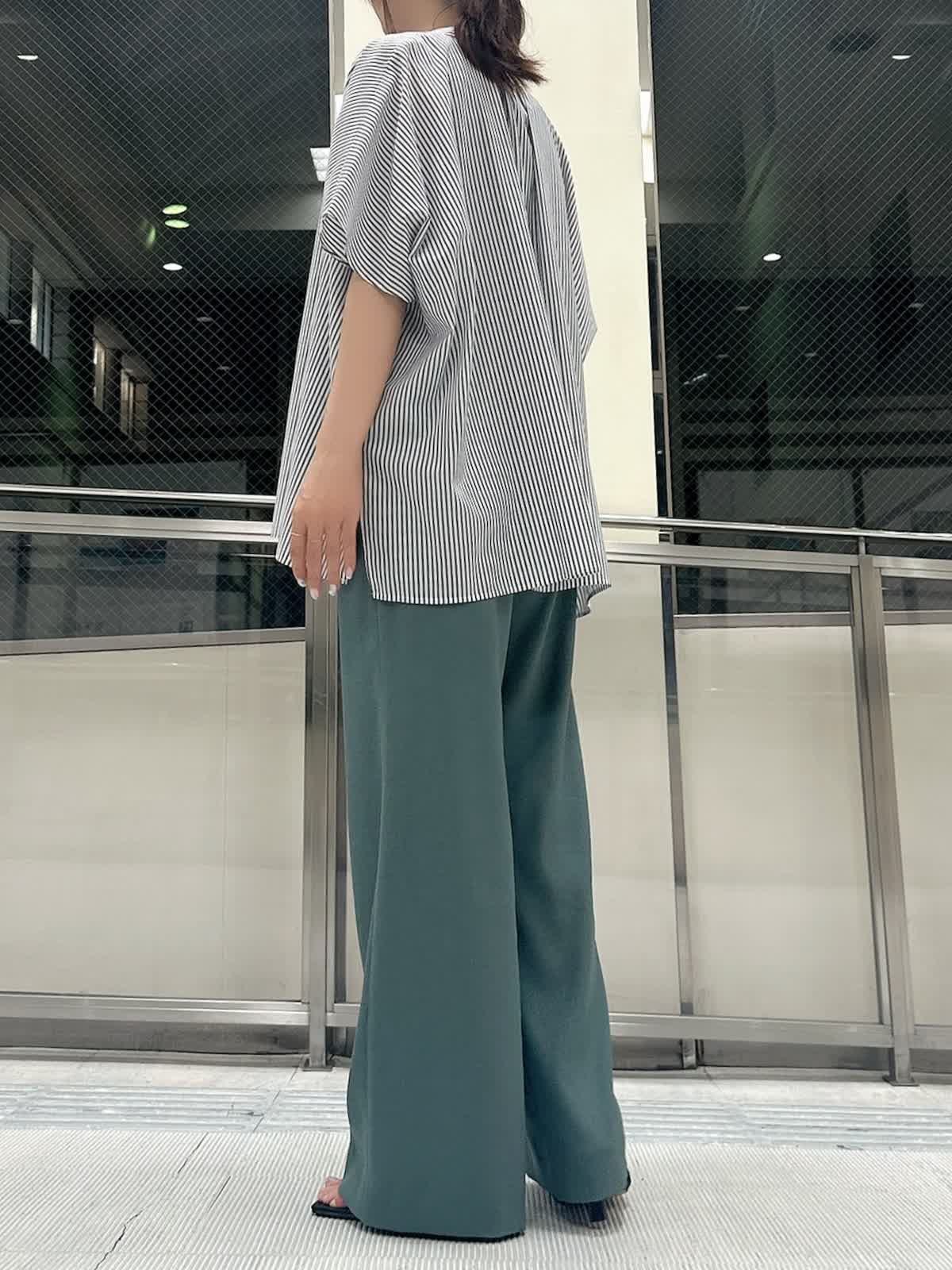 【 着用サイズ/カラー】 ブラウス:フリー/ストライプ パンツ:9号/グリーン いつものブラウススタイルにアクセントが加わり、簡単にこなれ感を手に入れられるストライプブラウス。前開きなので羽織りとしても◎ ボトムにグリーンをもってくるとぐっと洒落感がアップ。ウエストは総ゴムでストレスフリーです。
