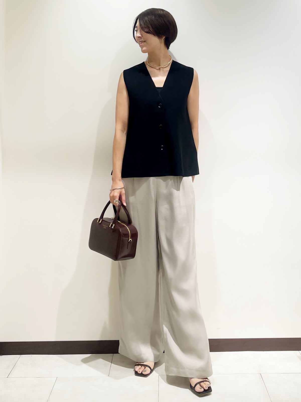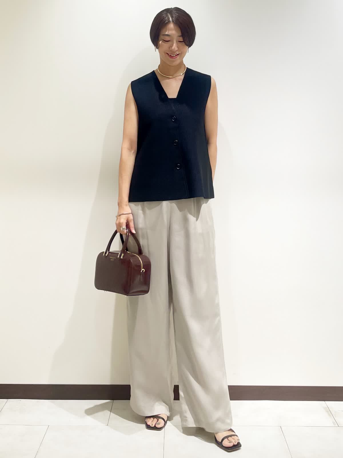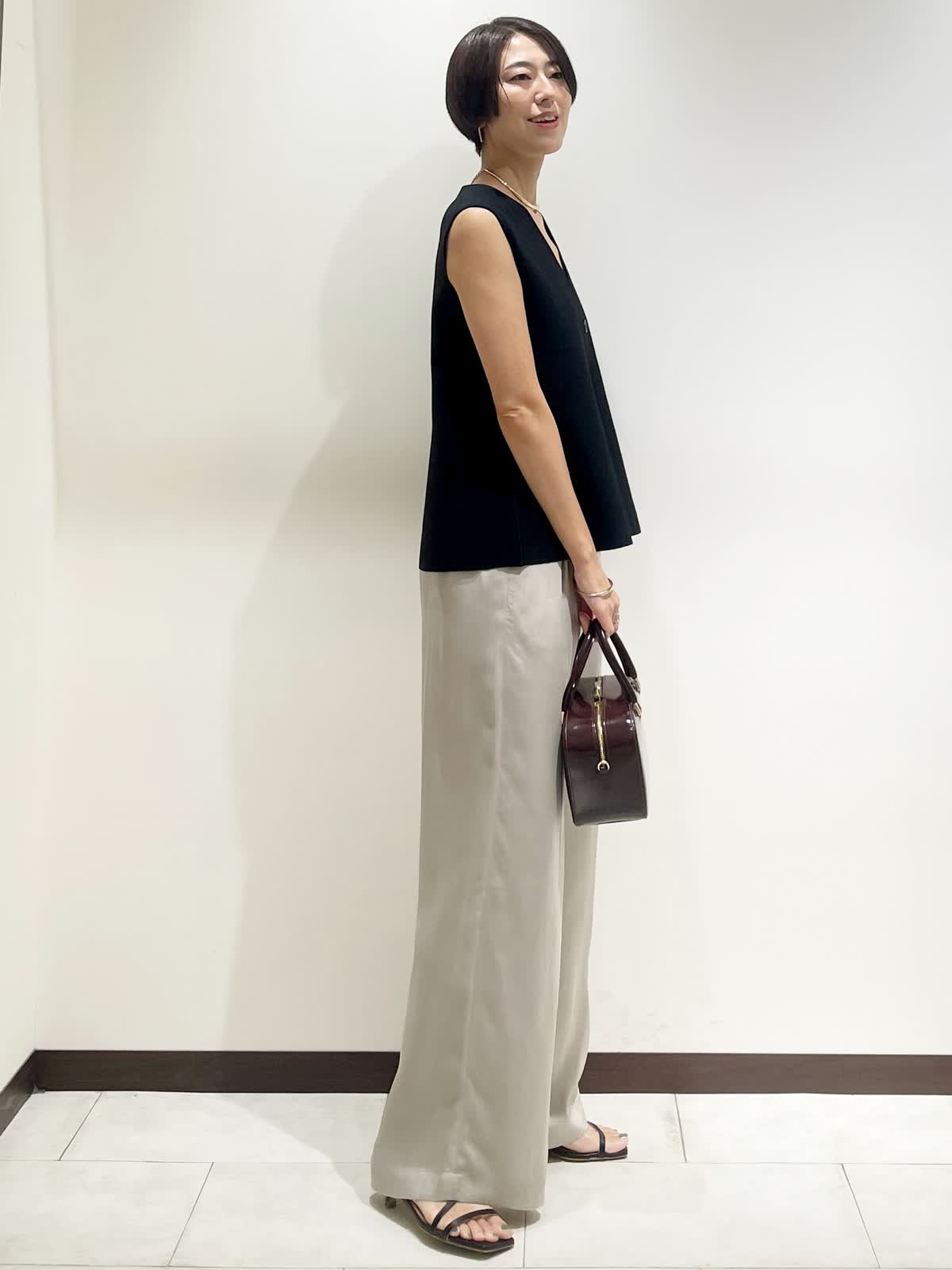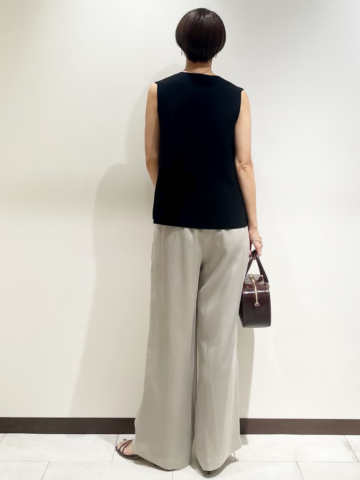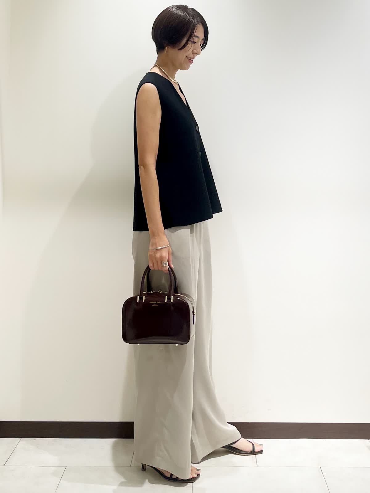 【着用サイズ】全て9号 【カラー】ジレ:ブラック パンツ:グレーベージュ バック:ワイン チョーカー:ゴールド 【コーディネートテーマ】 夏から秋へのスイッチコーデ 【サイズ感】 163p 普段9号サイズ 骨格ウェーブで上半身に比べてヒップがやや大きい ニットジレ:標準 パンツ:標準 ※ウエストのゴムですが、そこまで伸びないのでいつものおサイズでお選びいただくと良いと思います。