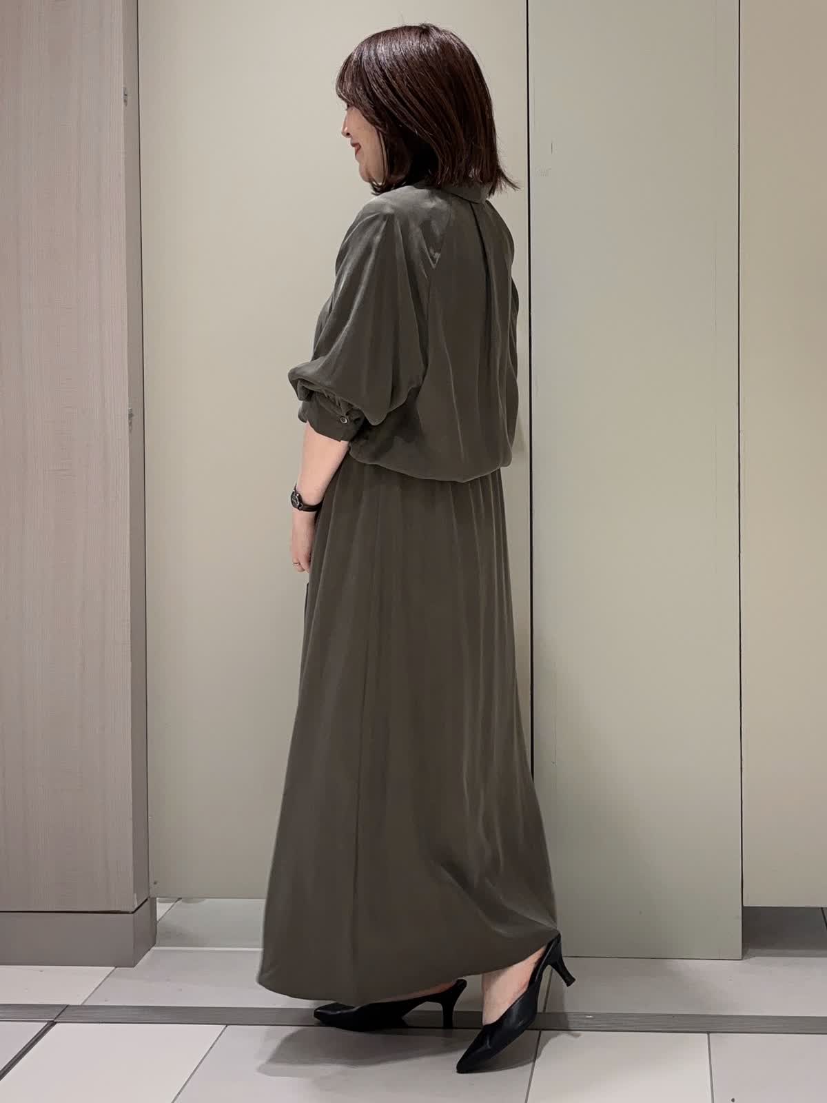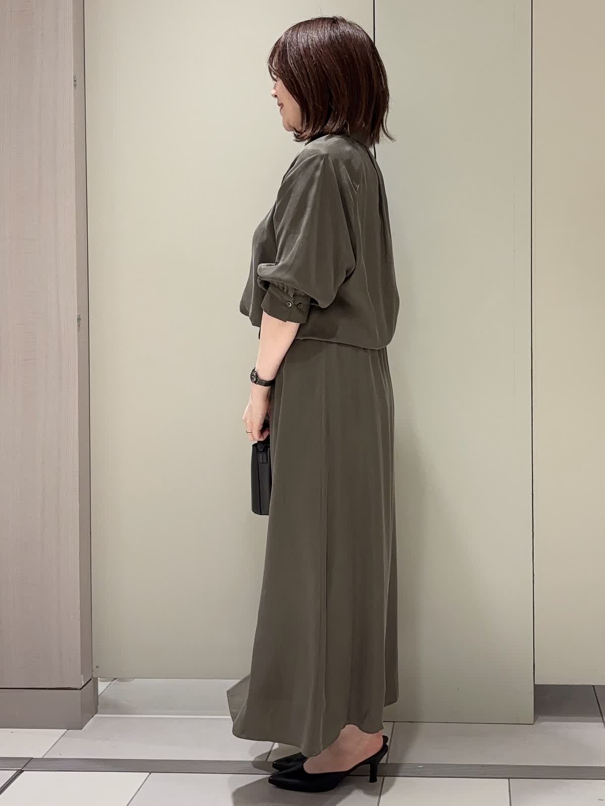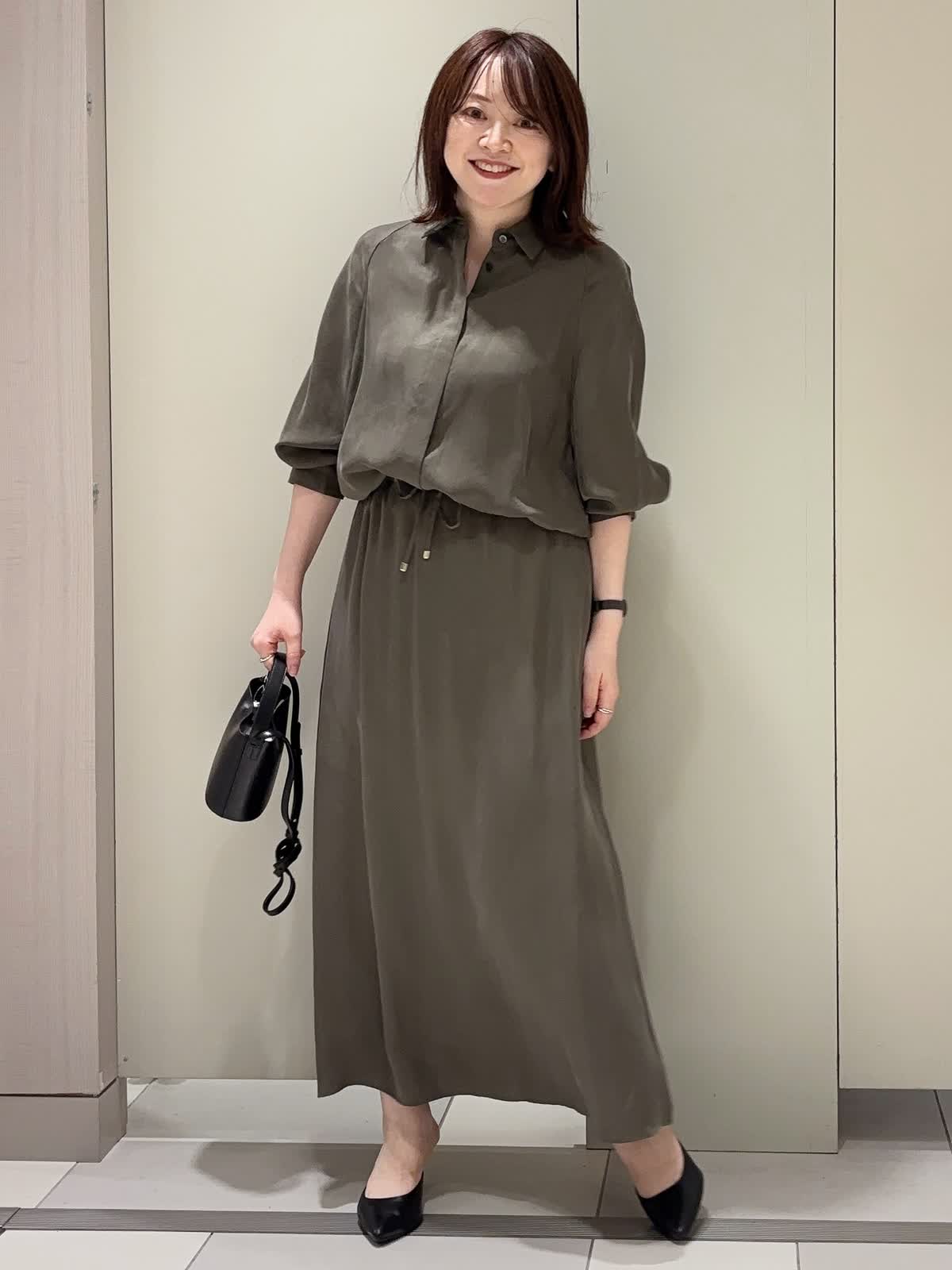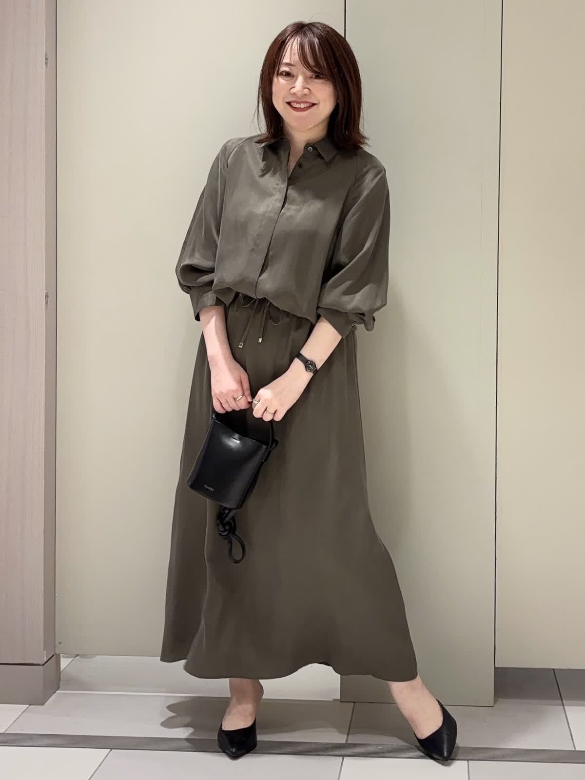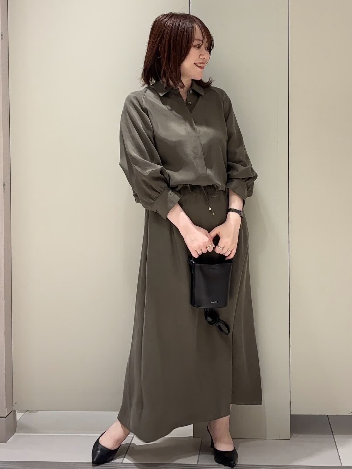 【着用カラー】 ブラウス:カーキ スカート:カーキ 【着用サイズ】 全て9号 落ち着きのあるカーキトーンでまとめた、大人の余裕漂うセットアップスタイル。 シャツとスカートは同素材で仕立てられており、統一感がありながらもきちんと感を演出してくれます。 シャツのウエスト部分を絞る事で自然にウエストマークされ、スタイルアップ効果も◎ スカートのウエスト部分もドロスト仕様なので楽チンです♪
