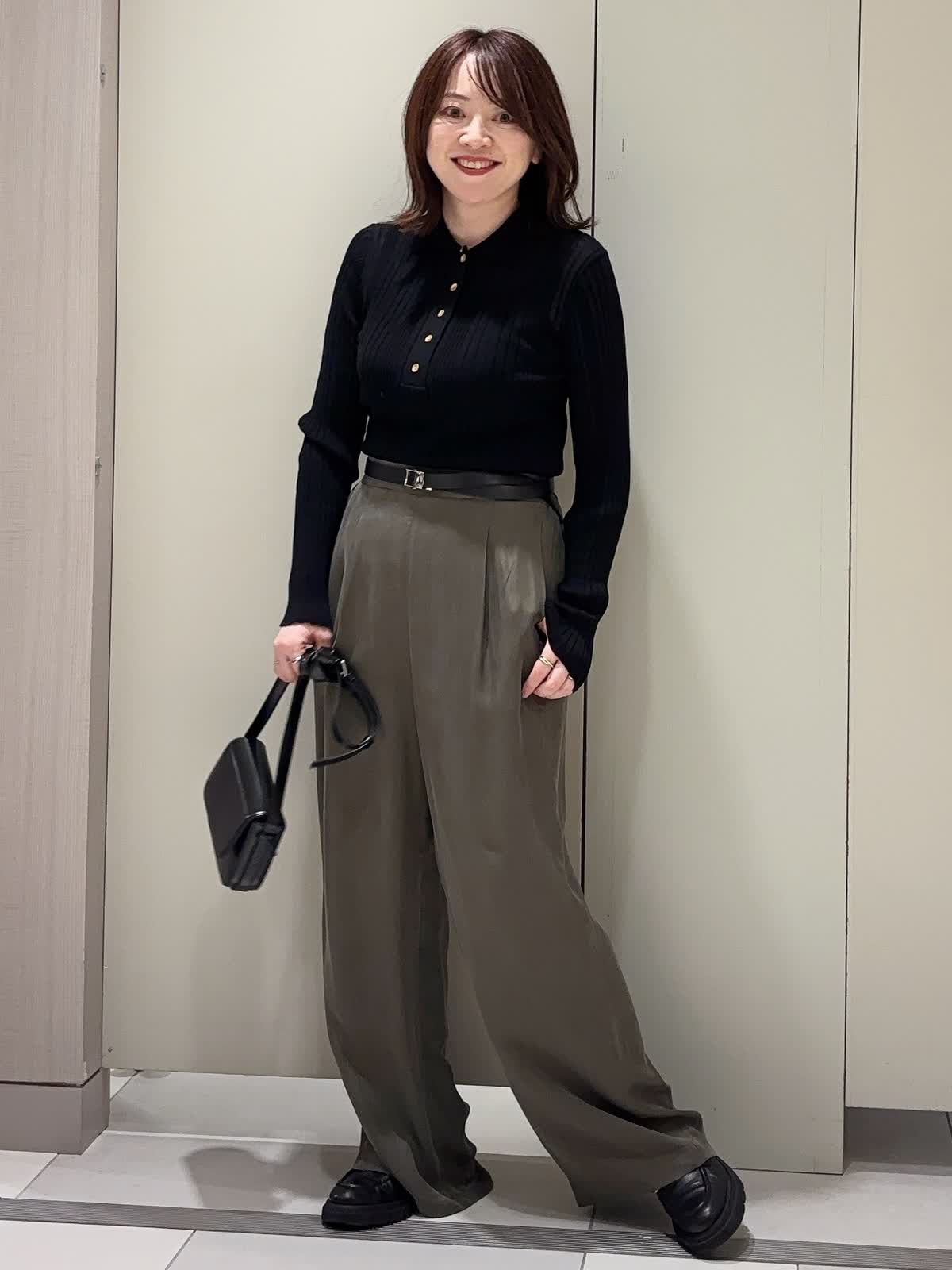 【着用カラー】 ニット:ブラック パンツ:カーキ 【着用サイズ】 全て9号 シアー素材のポロニットに、フィブリル素材のタックワイドパンツを合わせたシーズンムード漂うコーディネート。 ほんのり透け感のあるニットが抜け感を演出しつつ、落ち感のきれいなワイドパンツがリラクシーな大人の雰囲気を引き立てます。 シンプルながら素材の表情で魅せる、きれいめカジュアルスタイルです。
