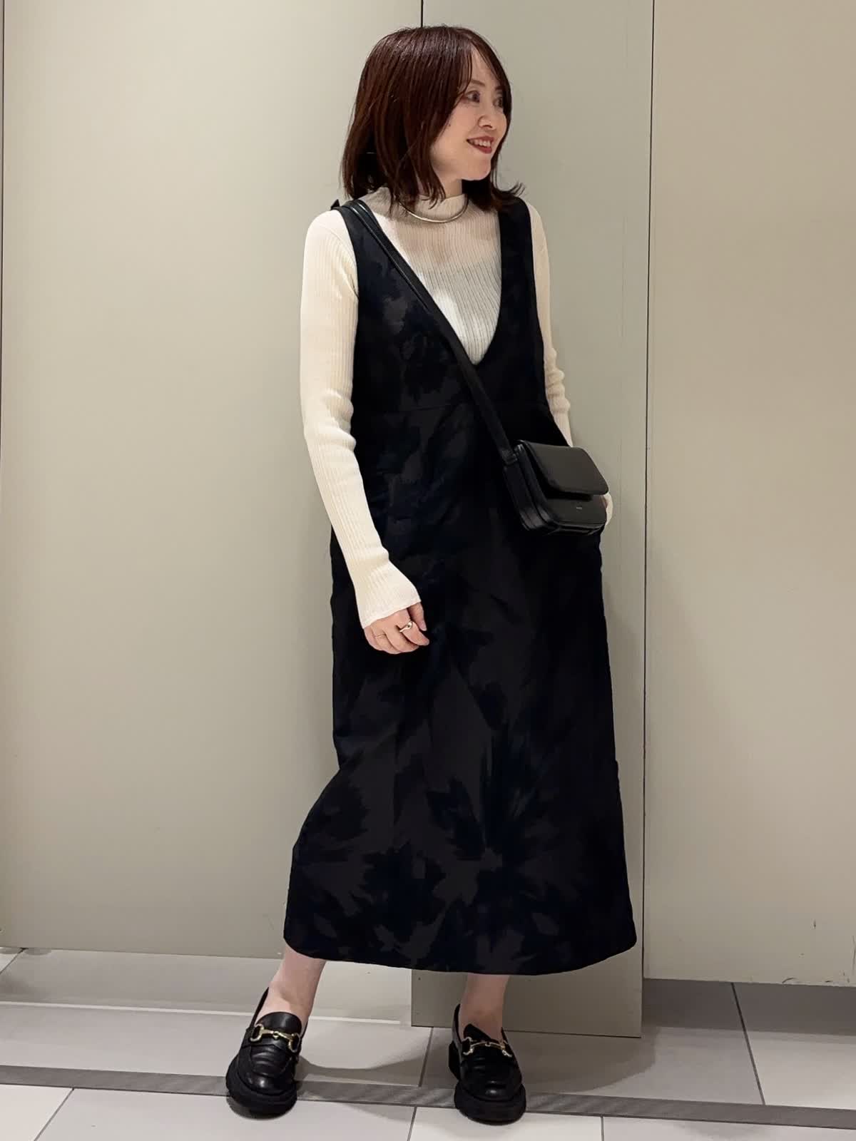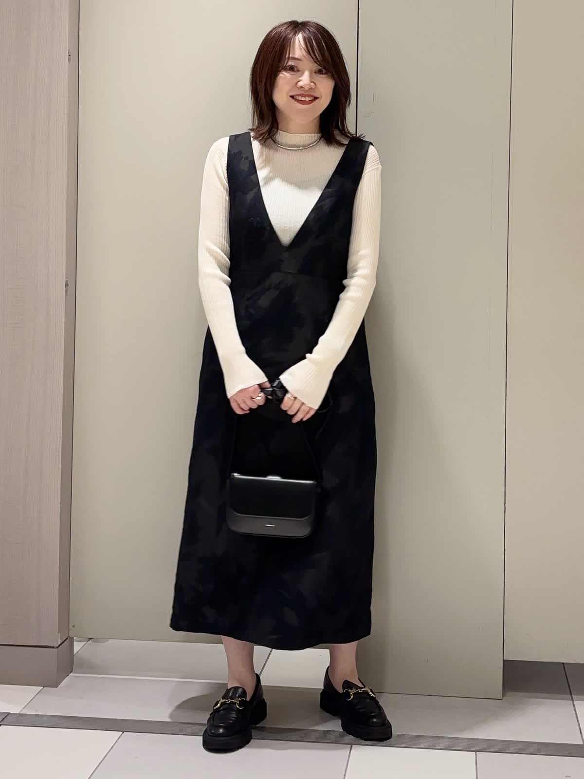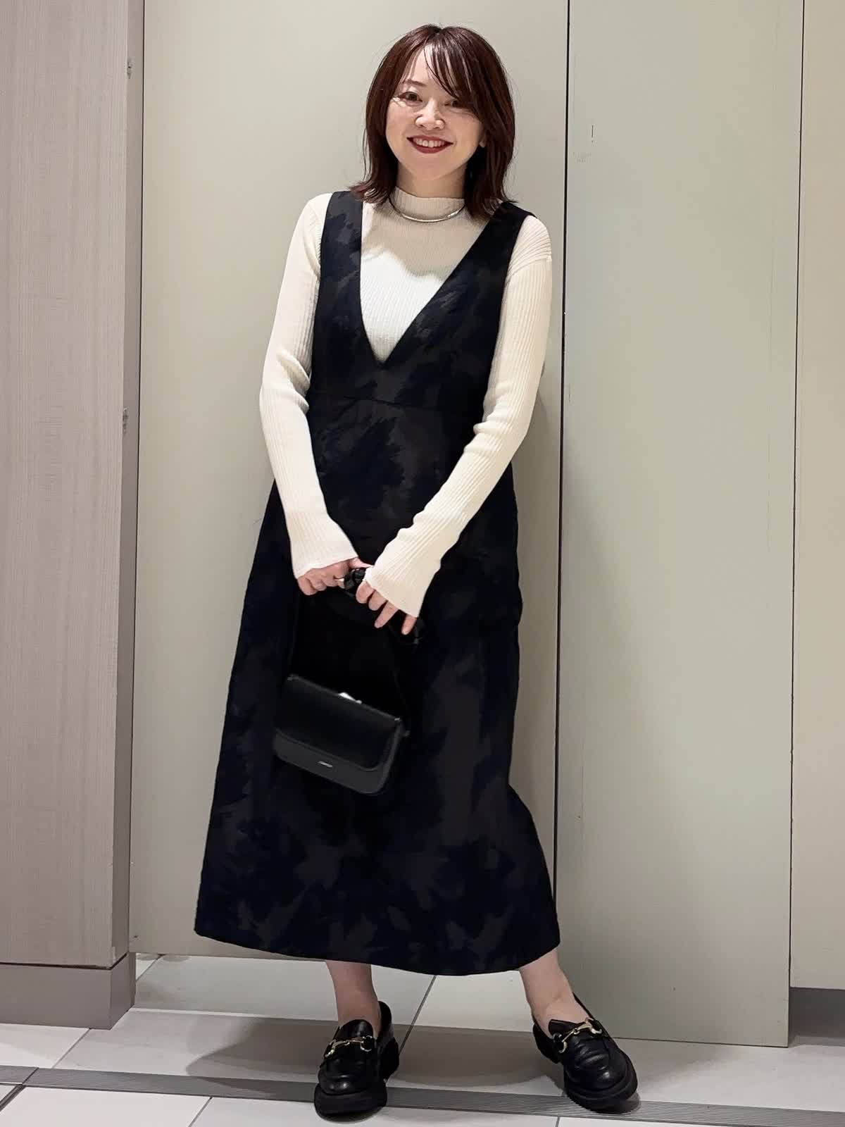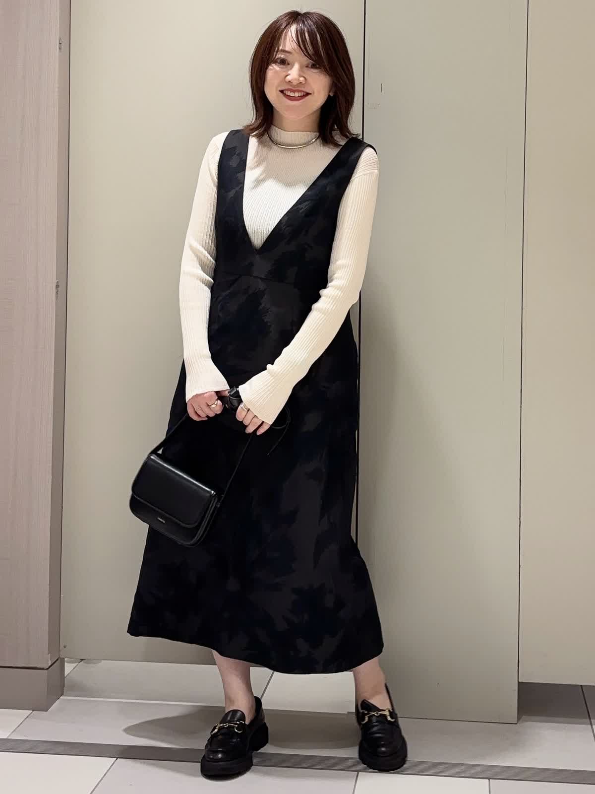 【着用カラー】 ニット:アイボリー ワンピース:ブラック 【着用サイズ】 全て9号 ジャガード素材のジャンスカに、シアーハイネックニットをレイヤードしたクラシカルなスタイリング。 深めのVネックデザインが顔まわりをすっきり見せつつ、胸下の高め位置に入った切り替えがスタイルアップ効果を演出。 ストンと落ちるストレートシルエットは身体のラインを拾わず、上品な抜け感を与えてくれます。 異素材を組み合わせた大人のきれいめレイヤードコーデです。