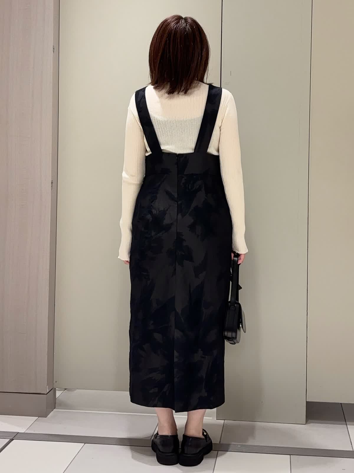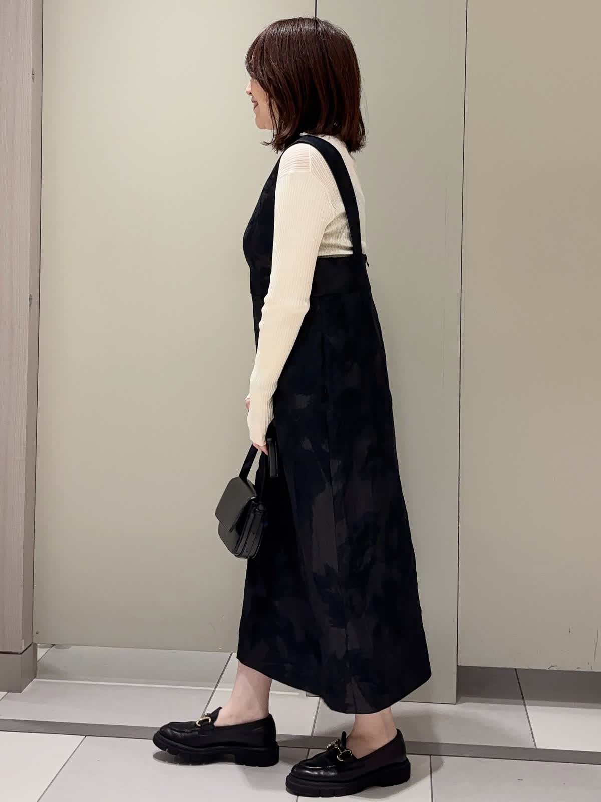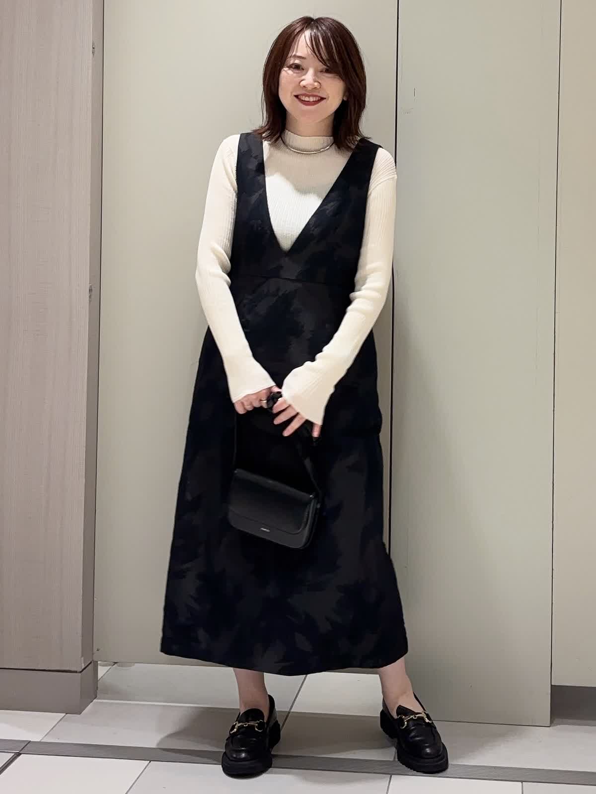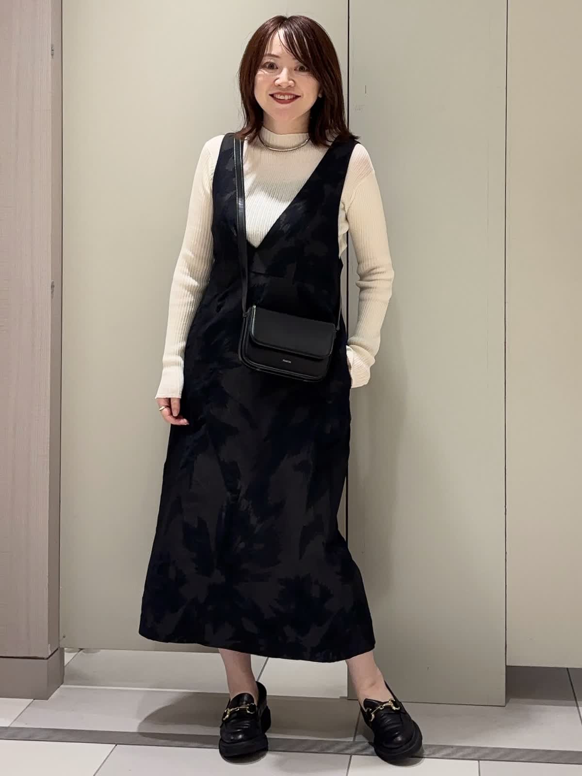 【着用カラー】 ニット:アイボリー ワンピース:ブラック 【着用サイズ】 全て9号 ジャガード素材のジャンスカに、シアーハイネックニットをレイヤードしたクラシカルなスタイリング。 深めのVネックデザインが顔まわりをすっきり見せつつ、胸下の高め位置に入った切り替えがスタイルアップ効果を演出。 ストンと落ちるストレートシルエットは身体のラインを拾わず、上品な抜け感を与えてくれます。 異素材を組み合わせた大人のきれいめレイヤードコーデです。