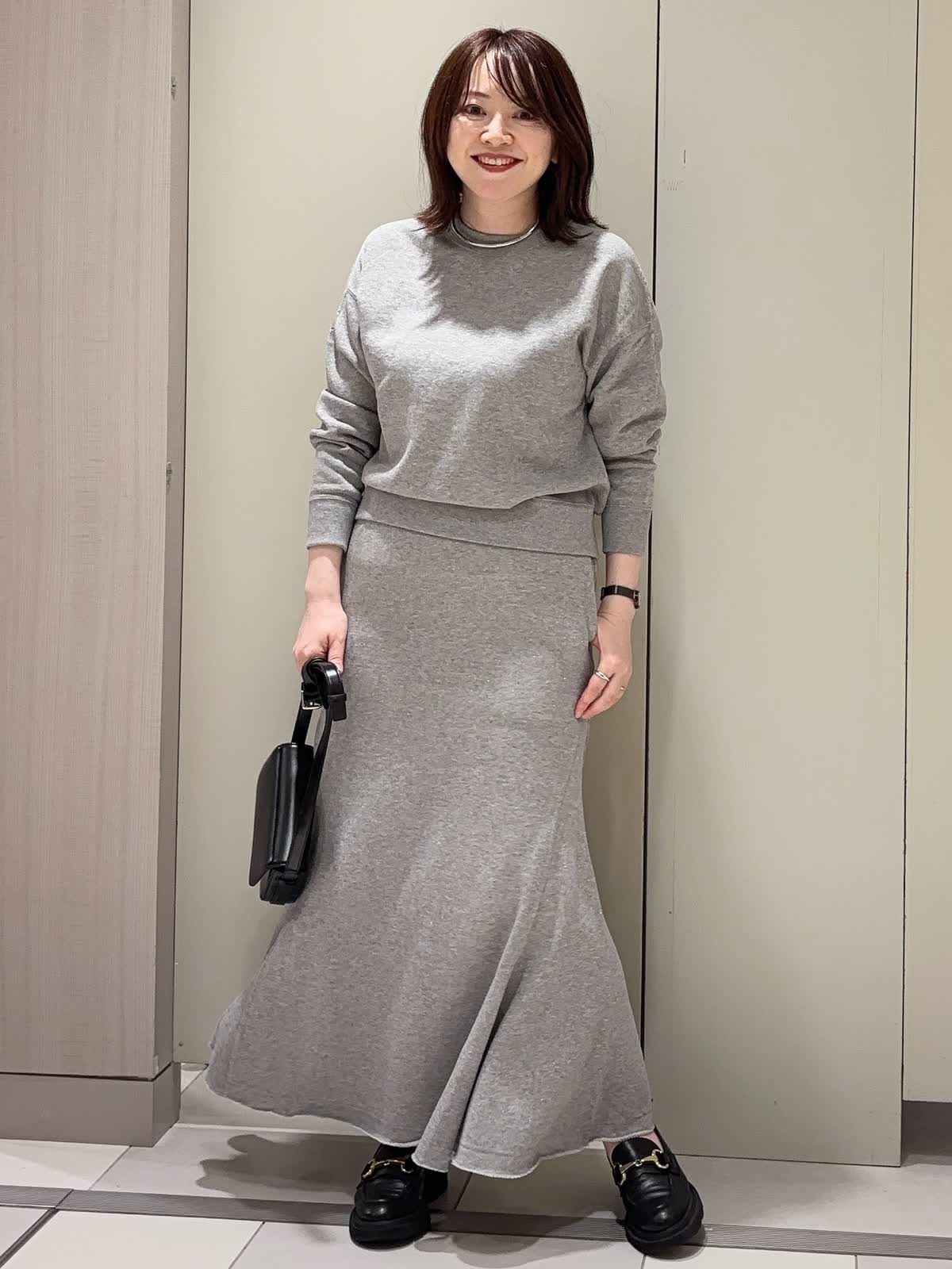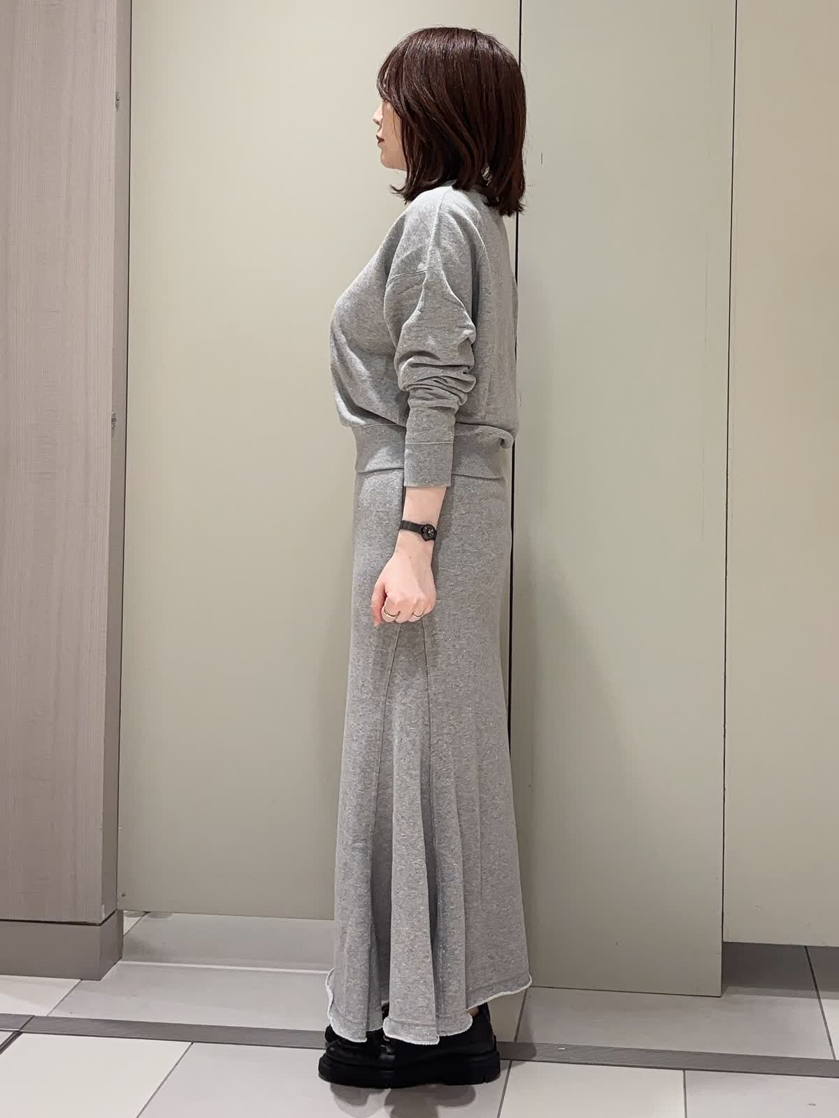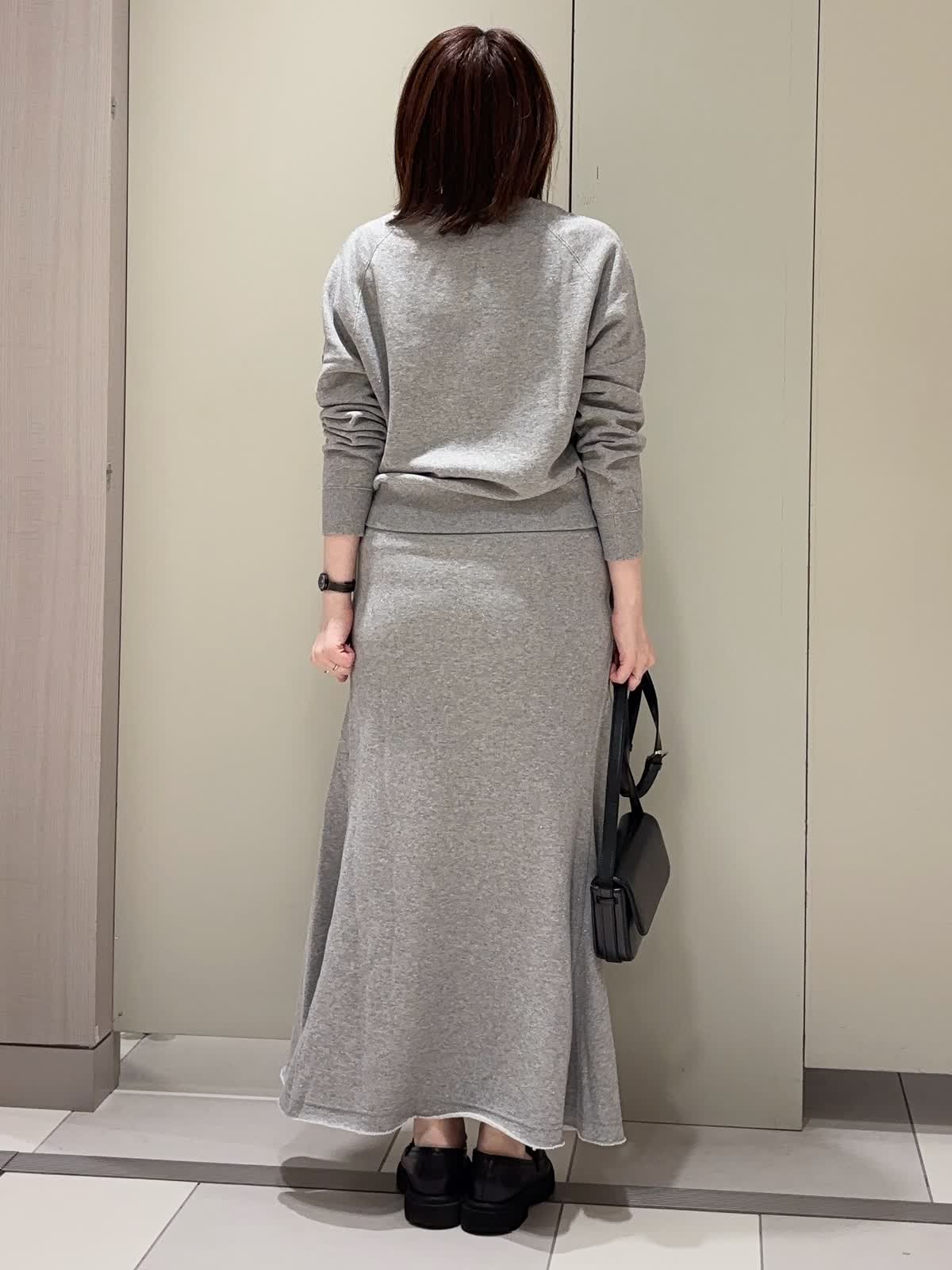 【着用カラー】 プルオーバー:グレー スカート:グレー 【着用サイズ】 全て9号 ラメ裏毛のスウェット素材で仕立てた上品カジュアルなセットアップ。 裏毛ならではの柔らかな肌ざわりと快適な着心地に、程よいラメ感をプラスして大人の華やかさを演出しています。 トップスはコンパクトな着丈の長袖でバランスが取りやすく、スカートは腰回りをすっきり見せつつ裾に向かって広がるフレアシルエット。リラックス感がありながらも、きれいめに着こなせるアイテムです。