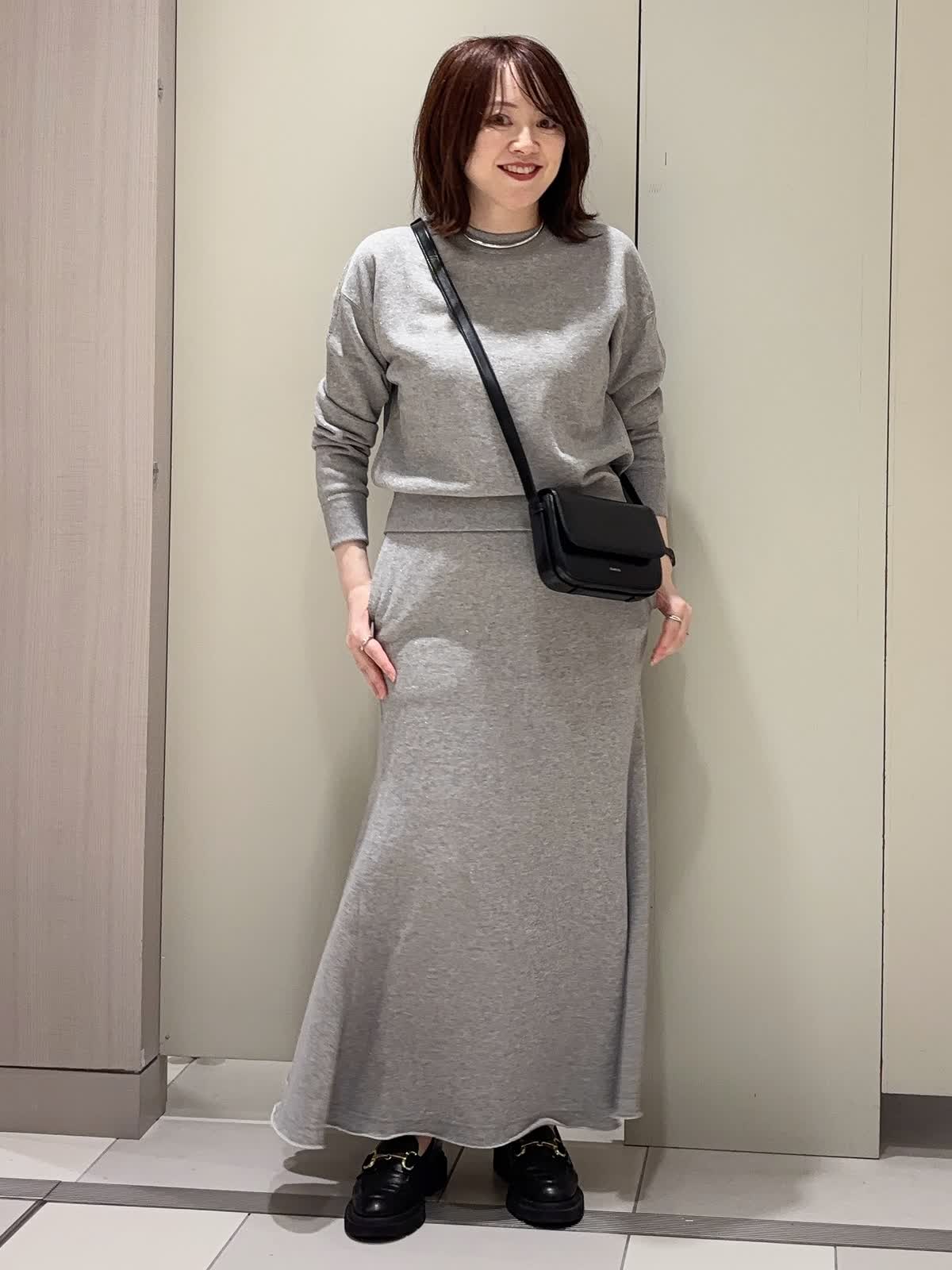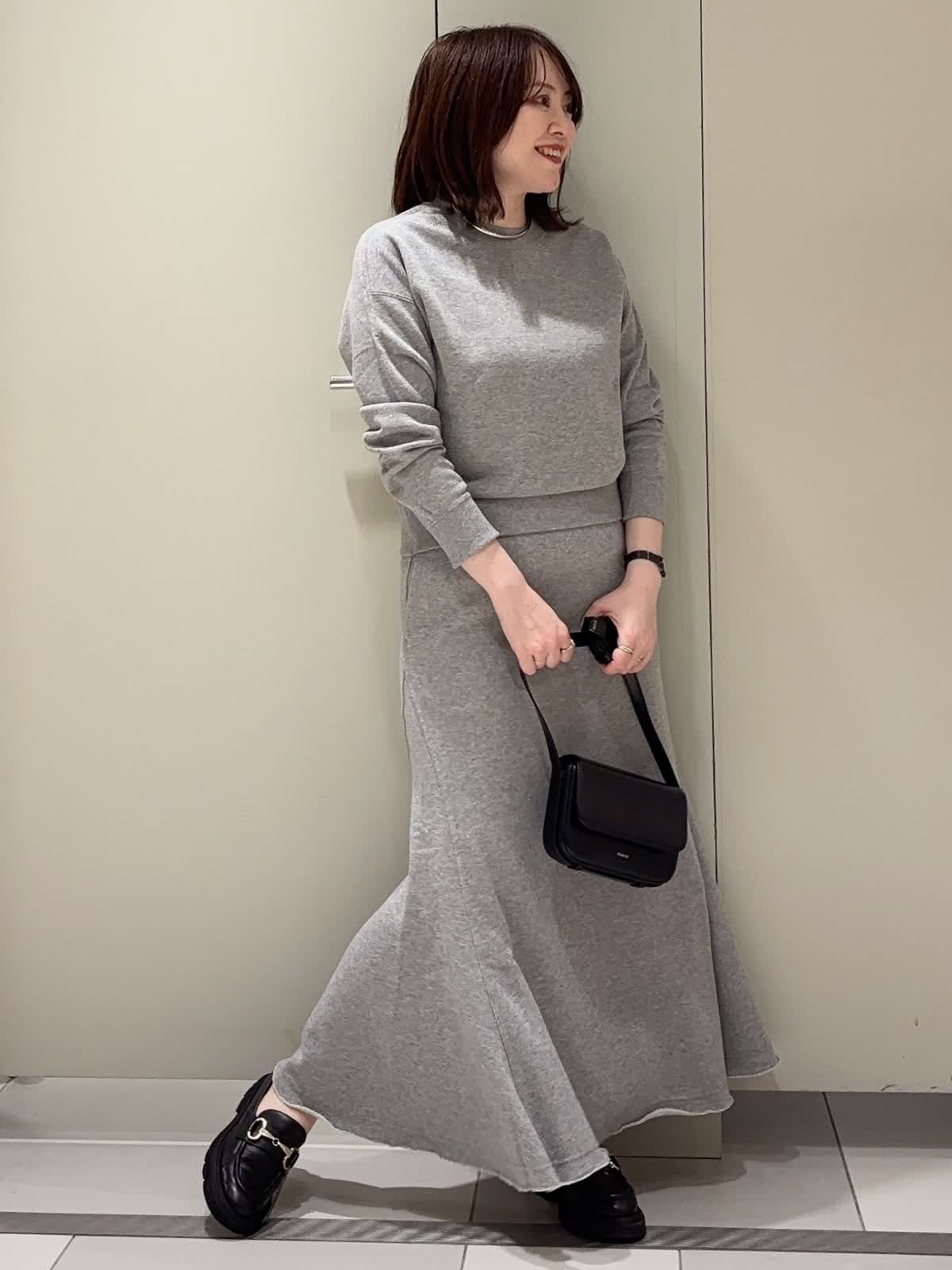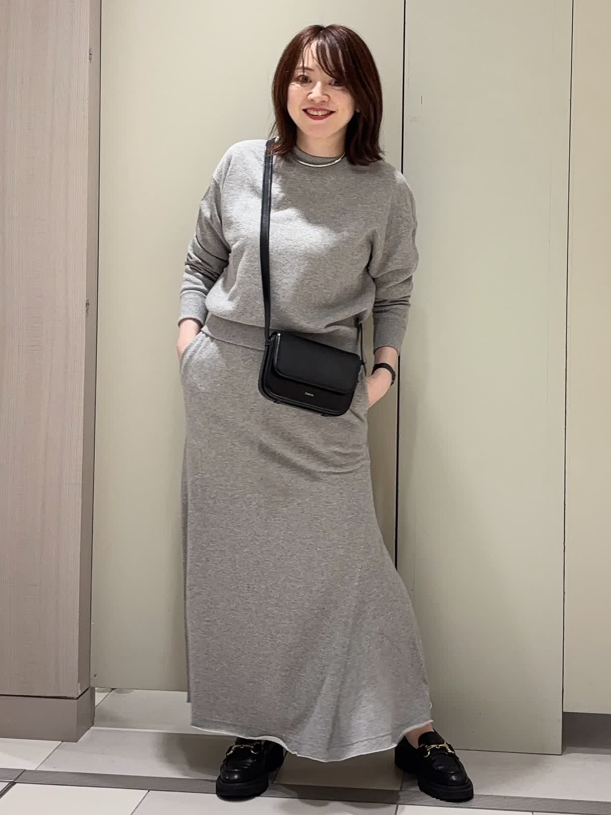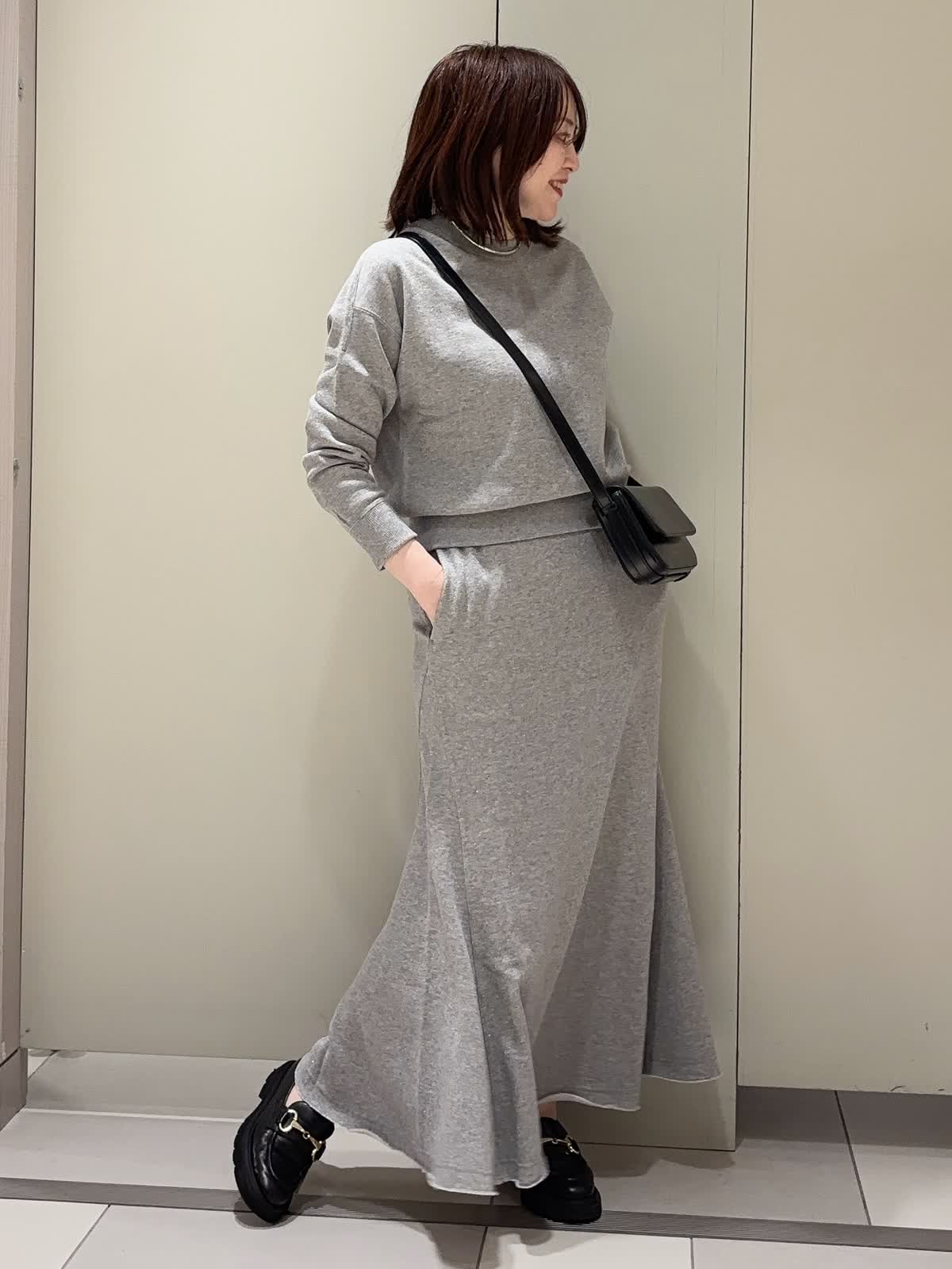 【着用カラー】 プルオーバー:グレー スカート:グレー 【着用サイズ】 全て9号 ラメ裏毛のスウェット素材で仕立てた上品カジュアルなセットアップ。 裏毛ならではの柔らかな肌ざわりと快適な着心地に、程よいラメ感をプラスして大人の華やかさを演出しています。 トップスはコンパクトな着丈の長袖でバランスが取りやすく、スカートは腰回りをすっきり見せつつ裾に向かって広がるフレアシルエット。リラックス感がありながらも、きれいめに着こなせるアイテムです。