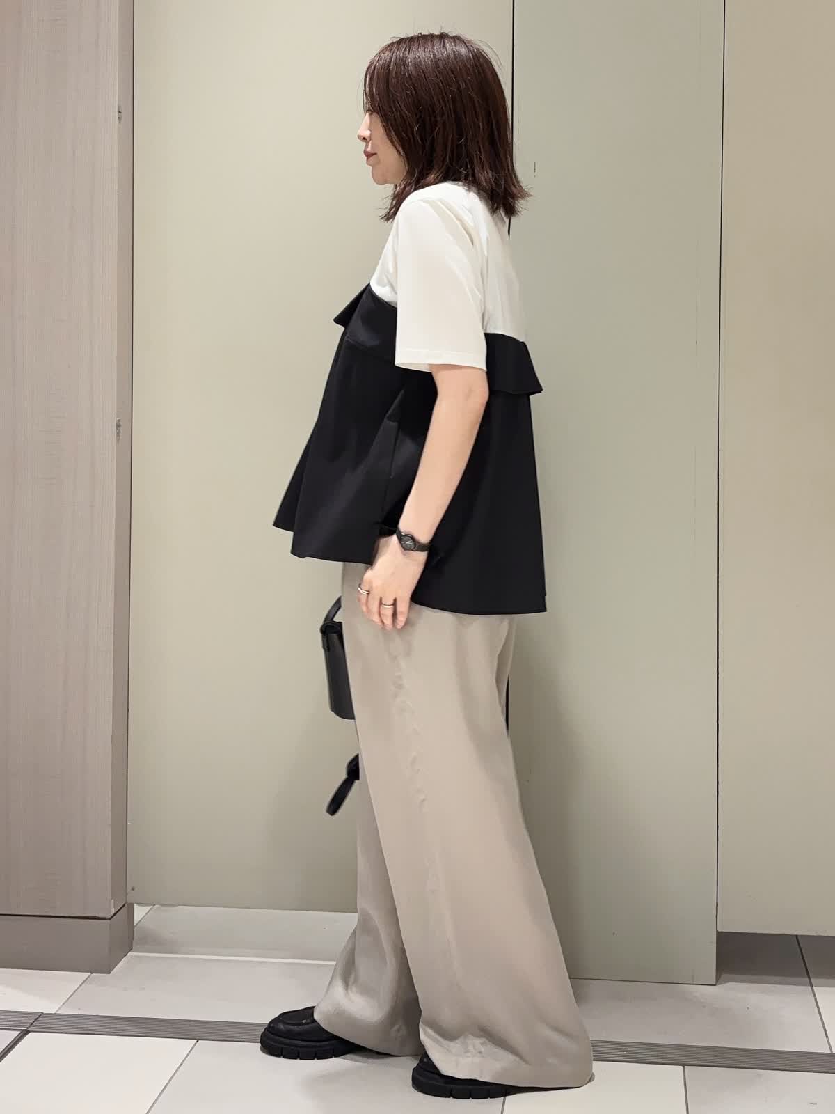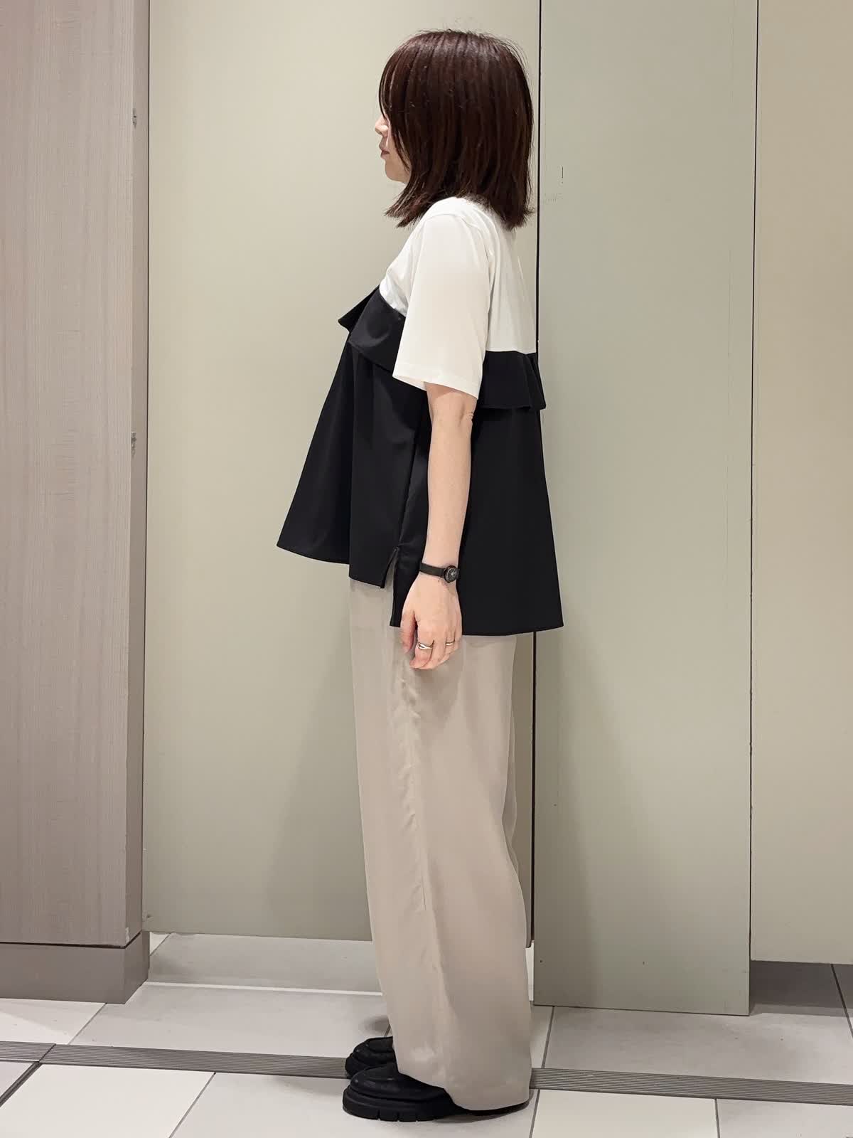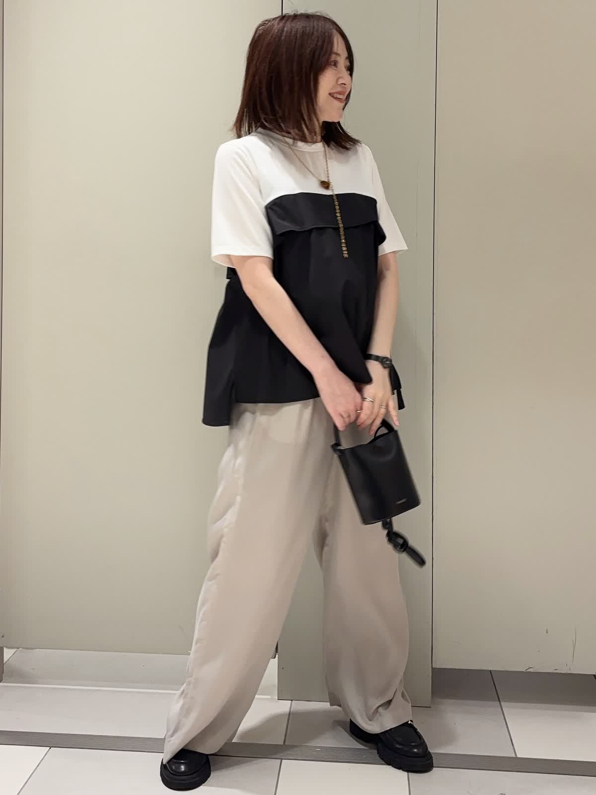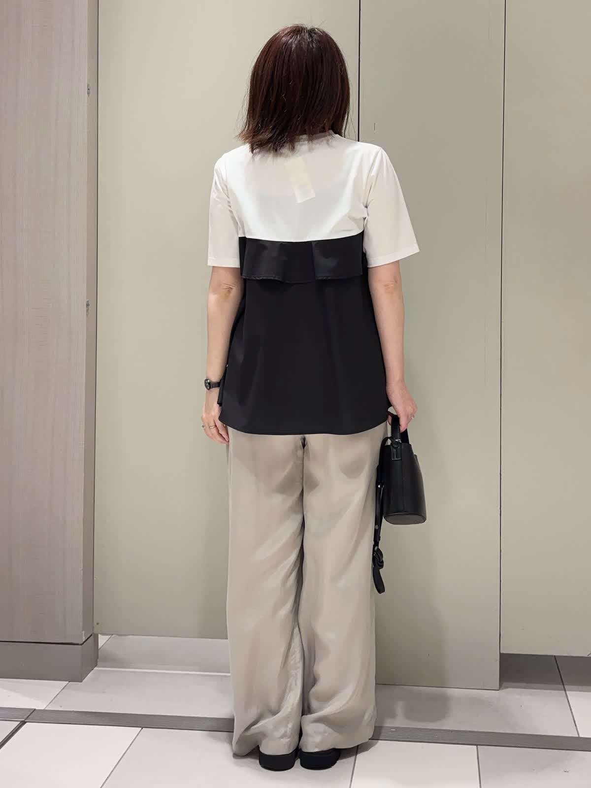【着用カラー】 カットソー:ホワイト パンツ:グレーベージュ 【着用サイズ】 全て9号 ブラック×ホワイトのコントラストが印象的なドッキングカットソーは、まるでビスチェをレイヤードしたかのようなデザインで、立体感とモードな雰囲気を演出します。 フィブリル素材のワイドパンツを合わせることで、程よくリラックス感をプラス。異素材の組み合わせが動きのあるスタイリングを作り出し、カジュアルながらも洗練された印象に仕上がります。モノトーンの配色が全体を引き締めつつ、シルエットのメリハリで着こなしにアクセントを添えています。