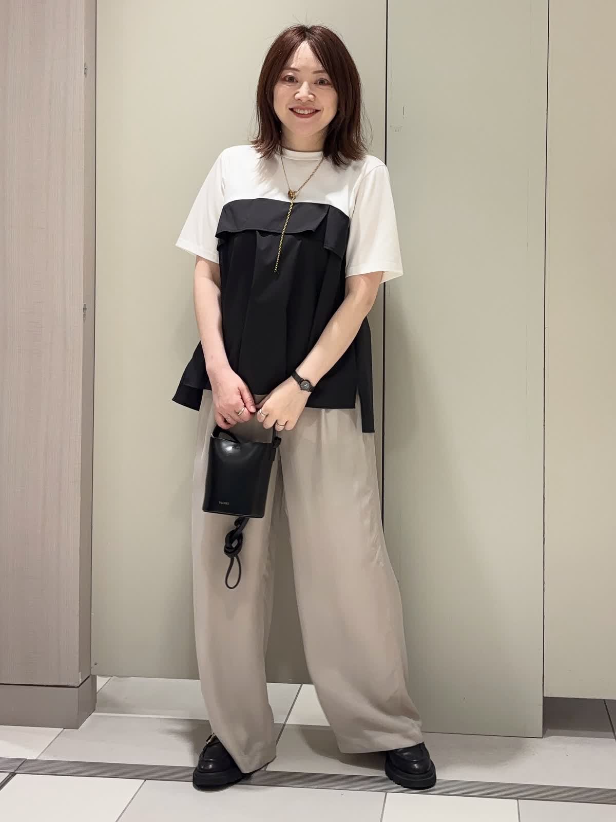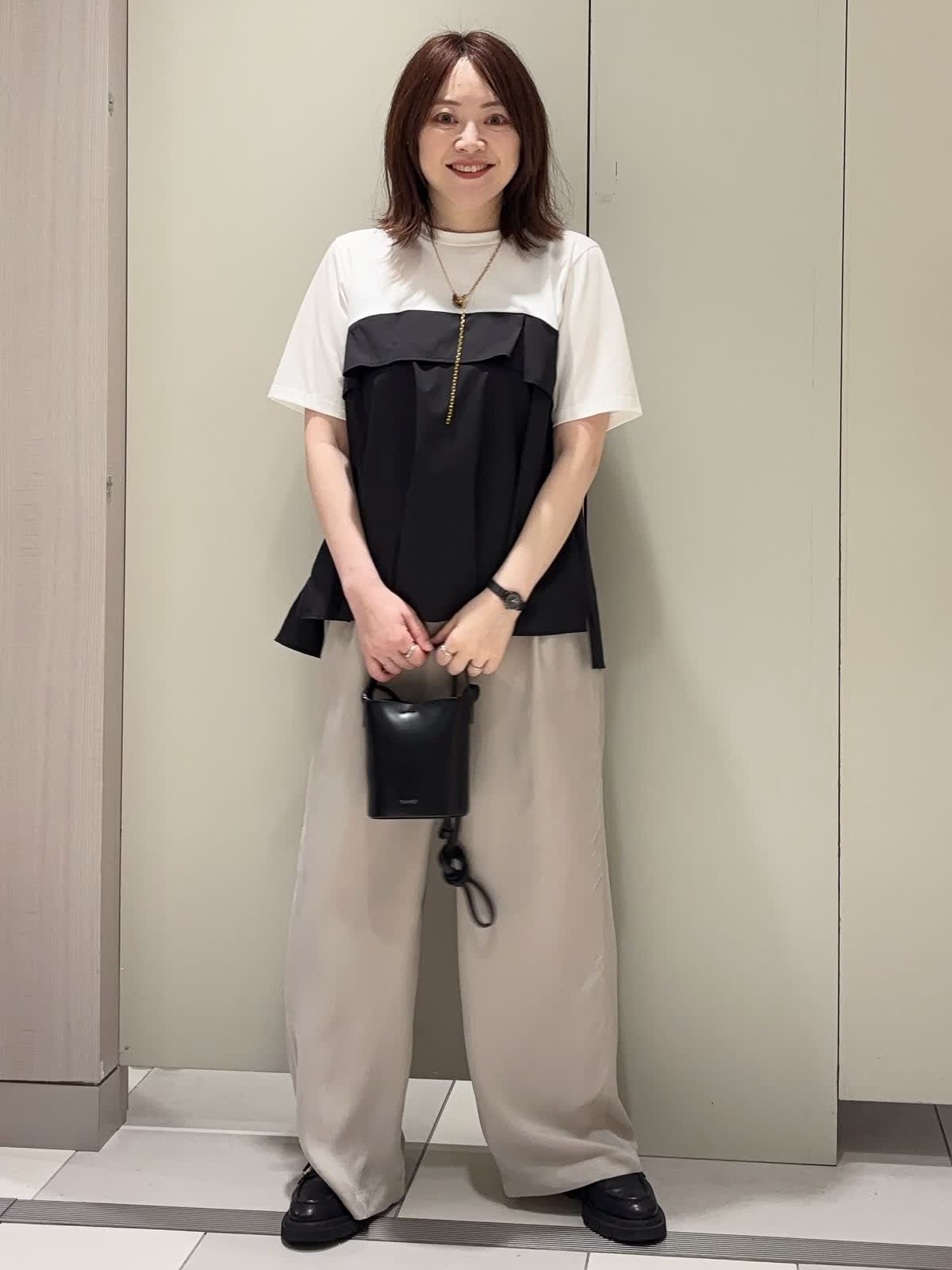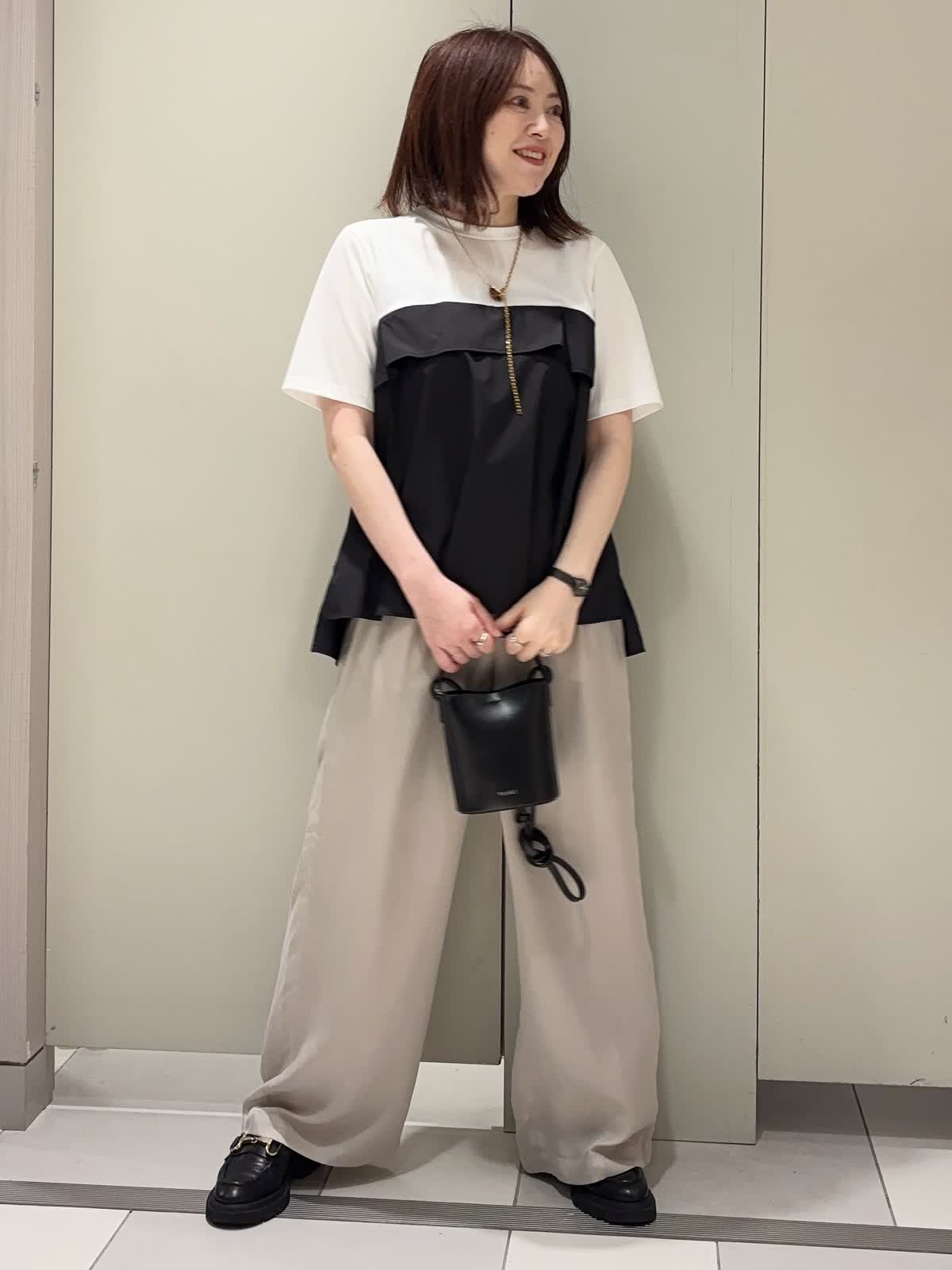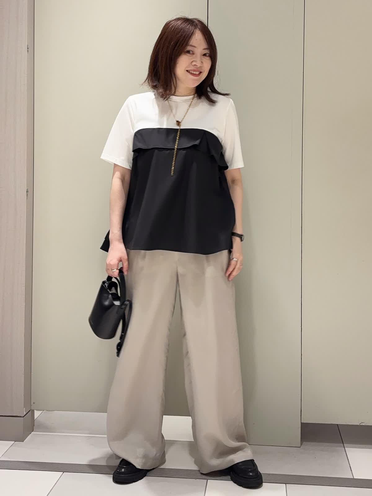 【着用カラー】 カットソー:ホワイト パンツ:グレーベージュ 【着用サイズ】 全て9号 ブラック×ホワイトのコントラストが印象的なドッキングカットソーは、まるでビスチェをレイヤードしたかのようなデザインで、立体感とモードな雰囲気を演出します。 フィブリル素材のワイドパンツを合わせることで、程よくリラックス感をプラス。異素材の組み合わせが動きのあるスタイリングを作り出し、カジュアルながらも洗練された印象に仕上がります。モノトーンの配色が全体を引き締めつつ、シルエットのメリハリで着こなしにアクセントを添えています。