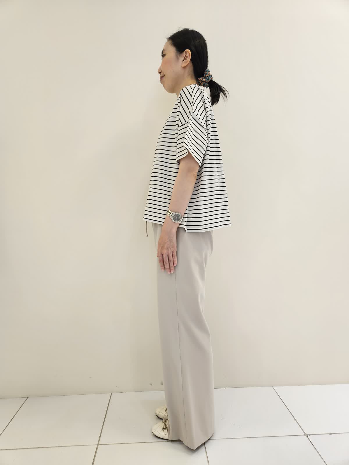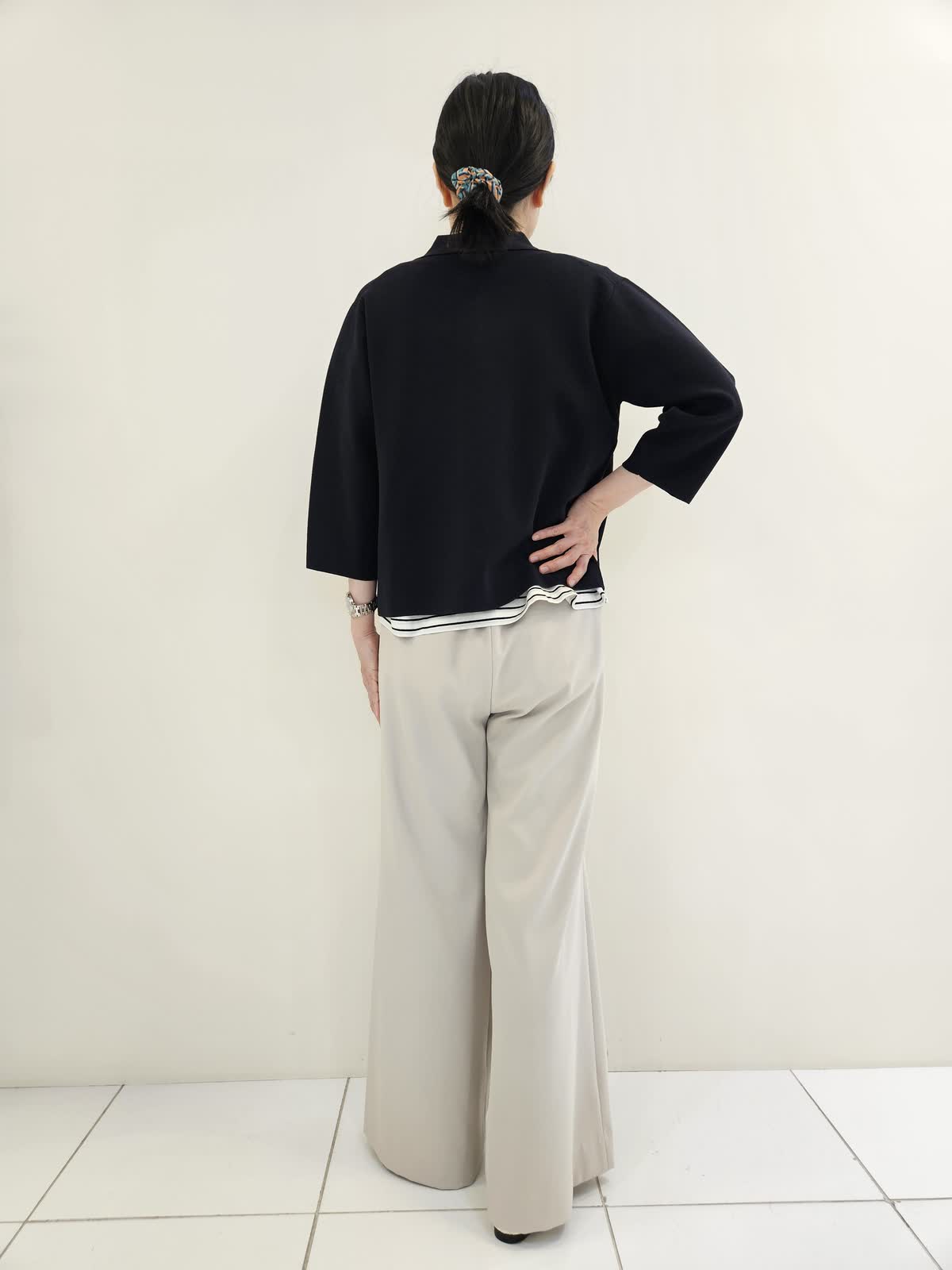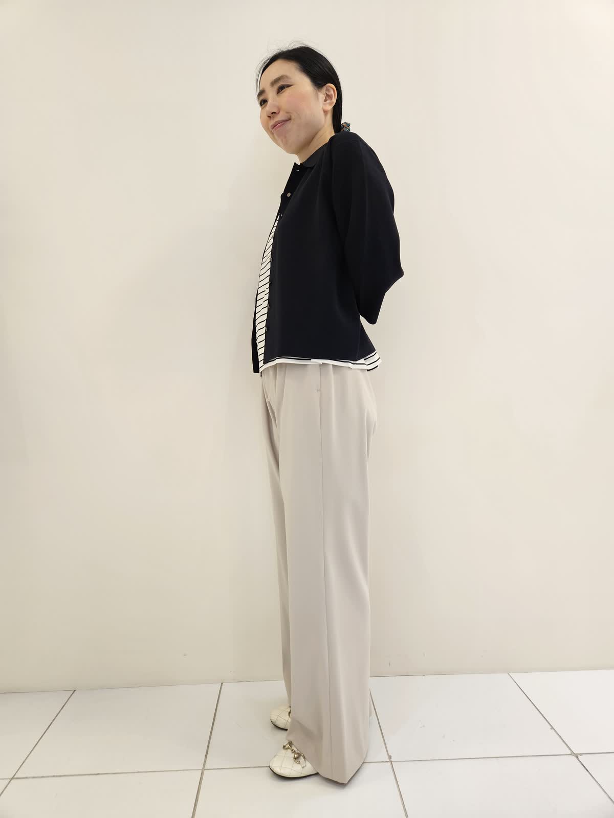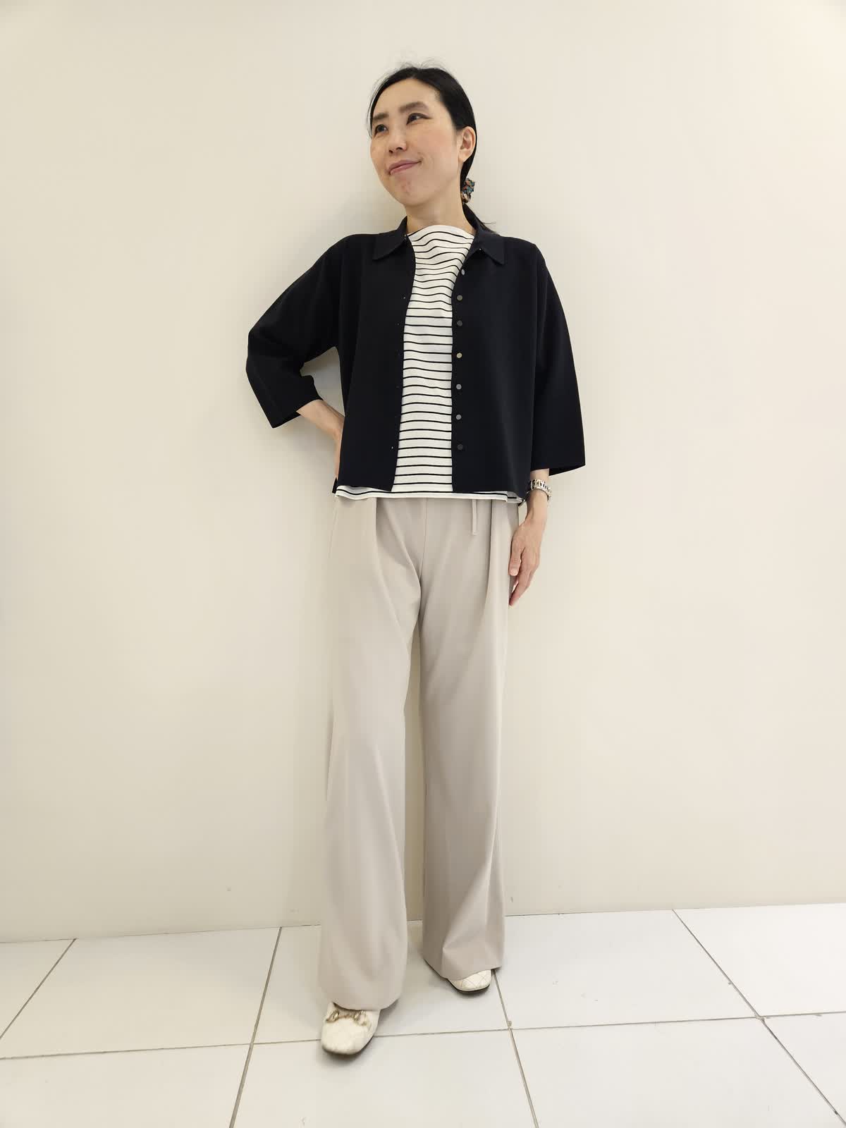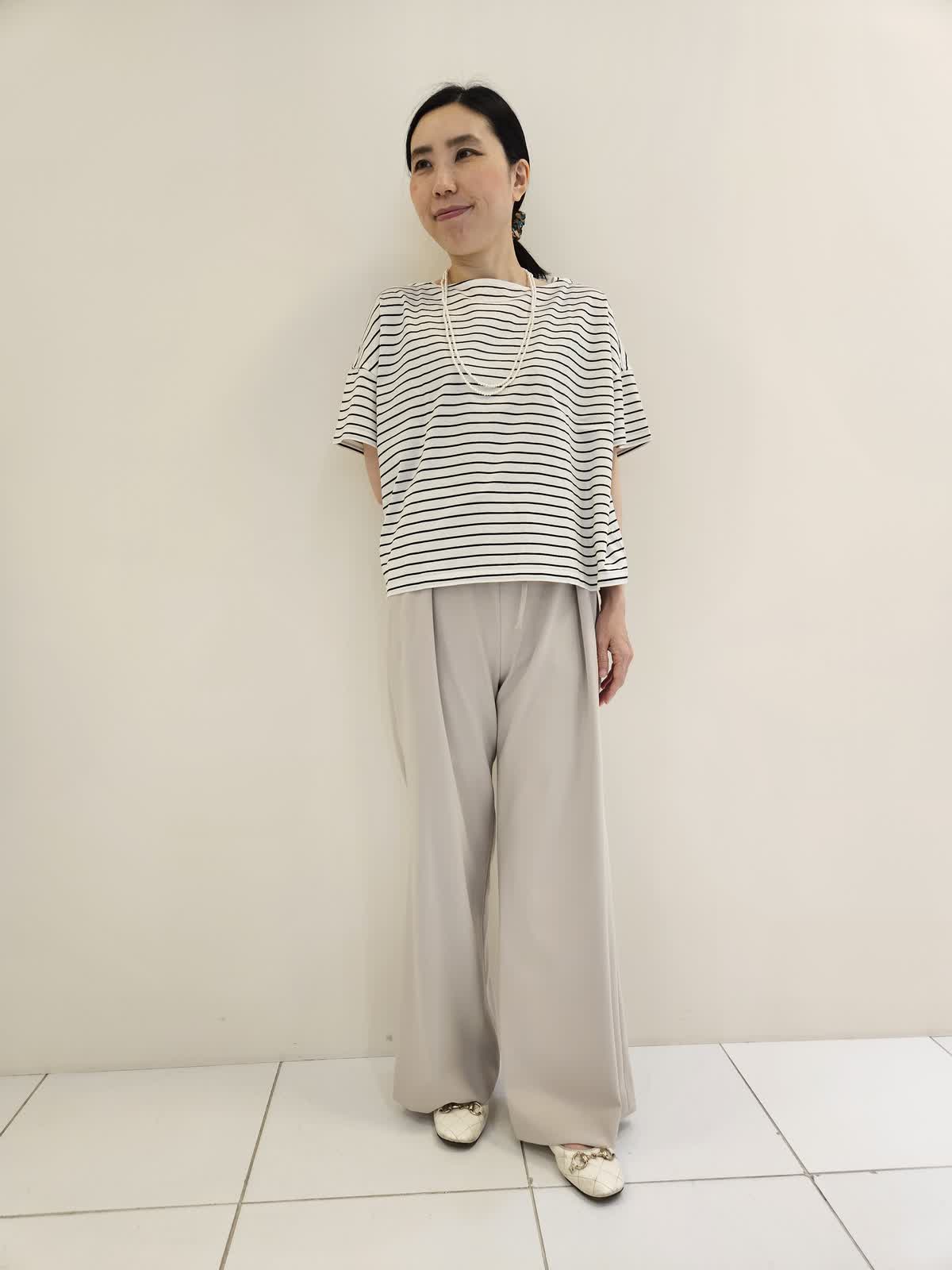 【着用サイズ・カラー】ニット:ネイビー9号・カットソー:オフホワイト フリー・パンツ:ベージュ9号 ニットは一枚で着てもサマになりますが、羽織りとして着るのもお勧めです。ボーダーは袖があるので暑い日に一枚でも◎ パンツはウエストがゴムで調節ができるので便利です。