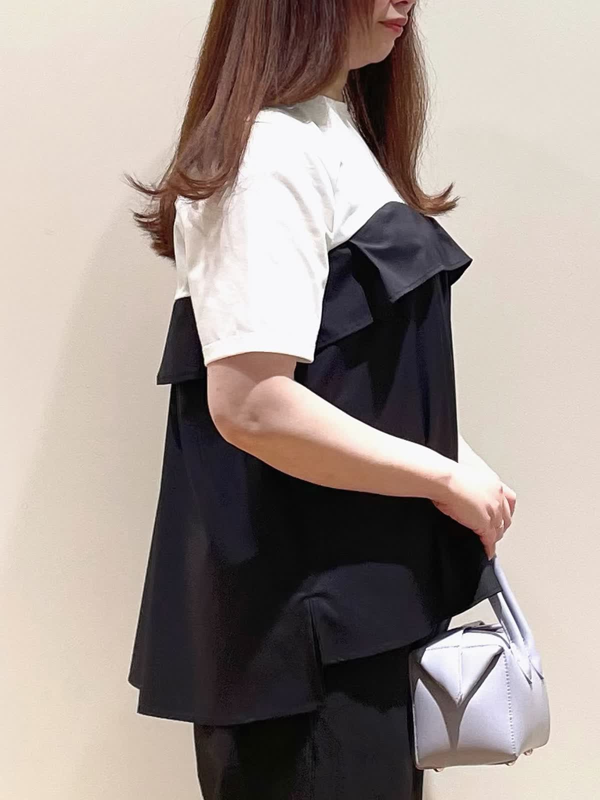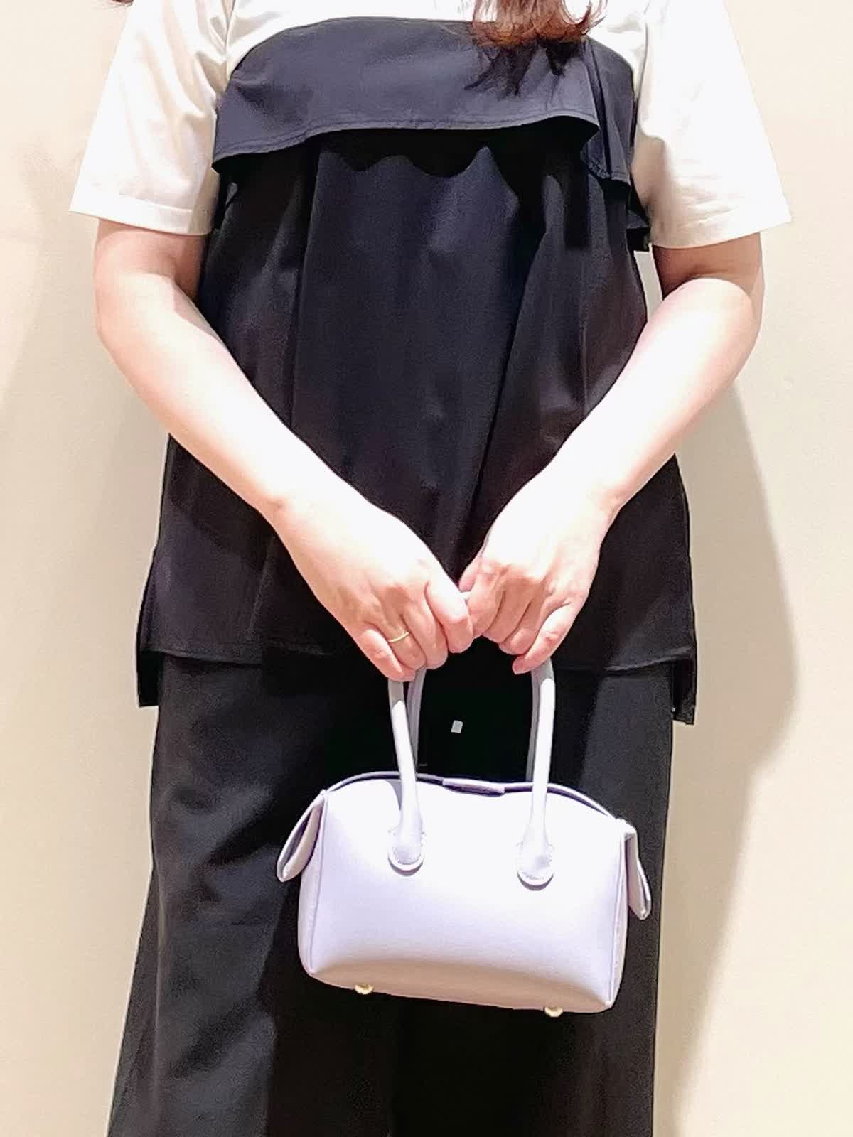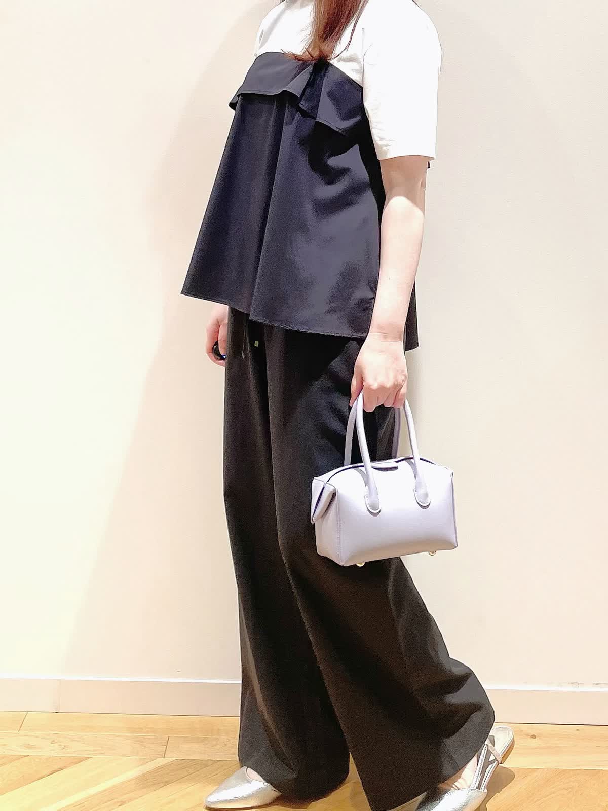 【着用サイズ】全て9号【着用カラー】カットソー:ホワイト パンツ:ブラック バック:ラベンダー ビスチェ風のデザインカットソーは手軽にオシャレを楽しめるアイテム。張りのある素材なので甘すぎず大人っぽく着ていただけます。セミワイドのイージーパンツでスッキリとしたモノトーンコーデにしました。ウエストゴム仕様でリラックス感がありながらきちんと見えも叶うパンツです。