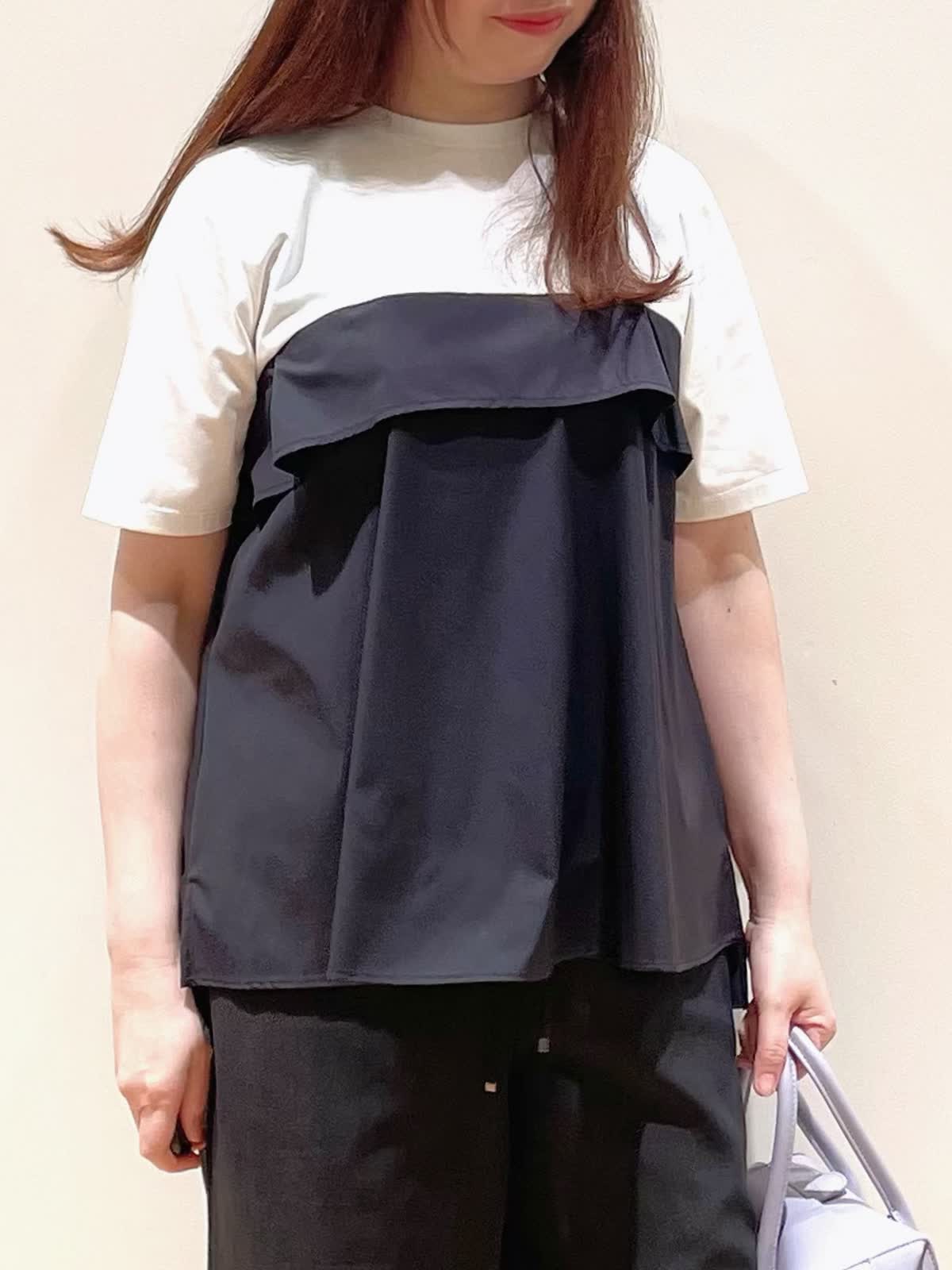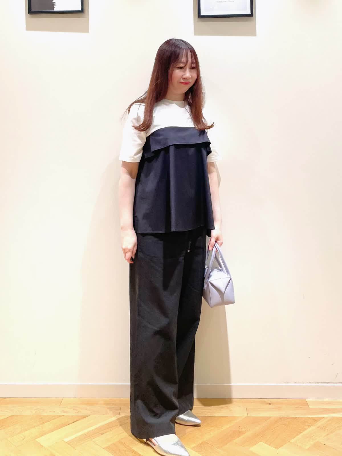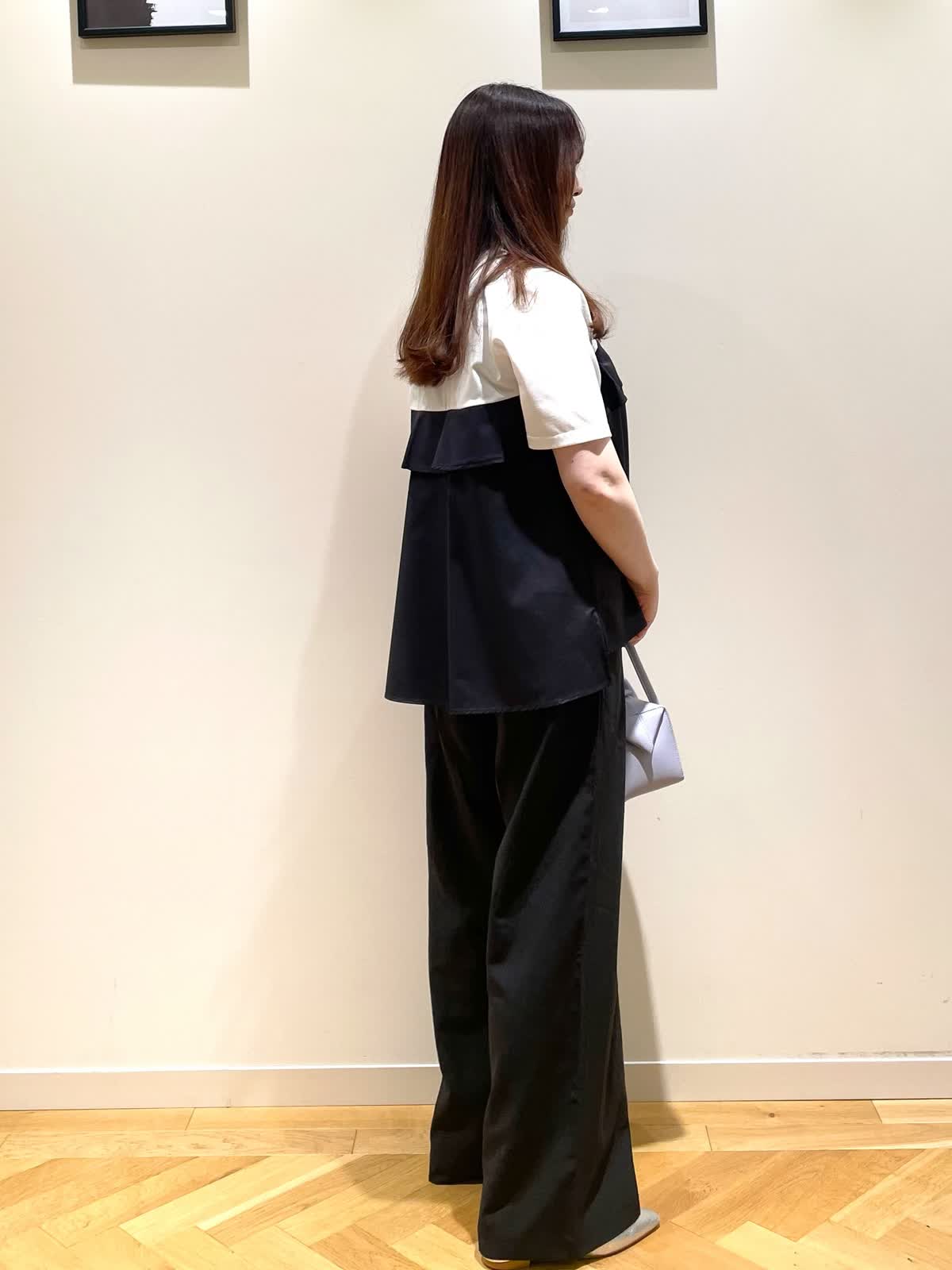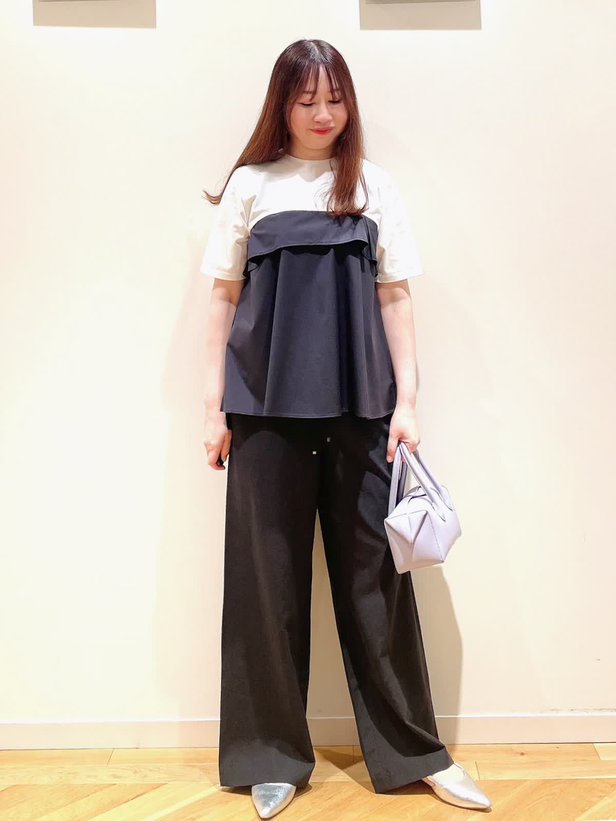 【着用サイズ】全て9号【着用カラー】カットソー:ホワイト パンツ:ブラック バック:ラベンダー ビスチェ風のデザインカットソーは手軽にオシャレを楽しめるアイテム。張りのある素材なので甘すぎず大人っぽく着ていただけます。セミワイドのイージーパンツでスッキリとしたモノトーンコーデにしました。ウエストゴム仕様でリラックス感がありながらきちんと見えも叶うパンツです。