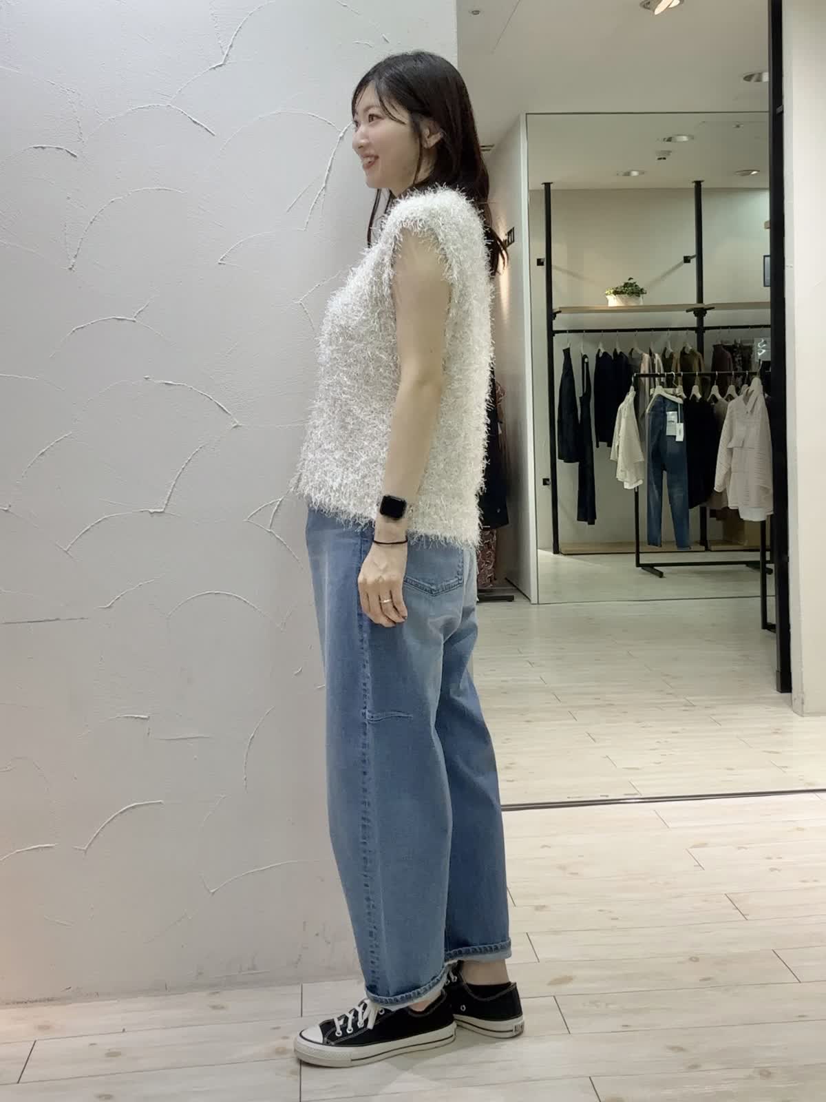 【着用サイズ】ニット:フリー パンツ:11号 【着用カラー】ニット:グレーベージュ パンツ:ブルー 秋まで着れるジレを使ったカジュアルコーデ。1枚着てもこなれ感のでるシルエットで、さりげなくラメが入っているので華やかな印象です。カジュアルにバレル風デニムと合わせてみました。どちらも着回し抜群でおすすめのコーディネートです。