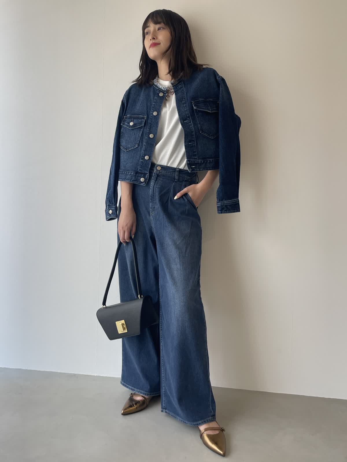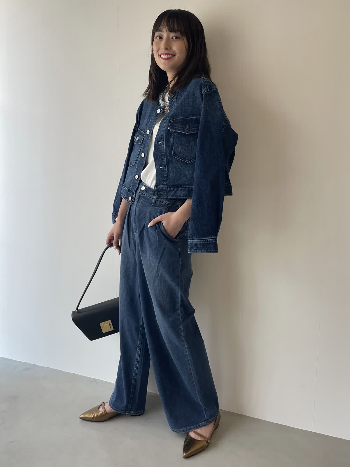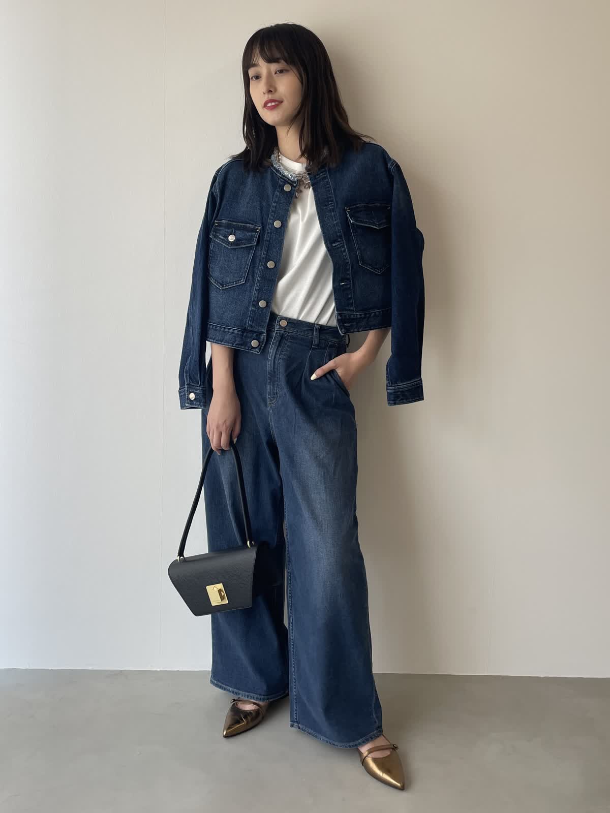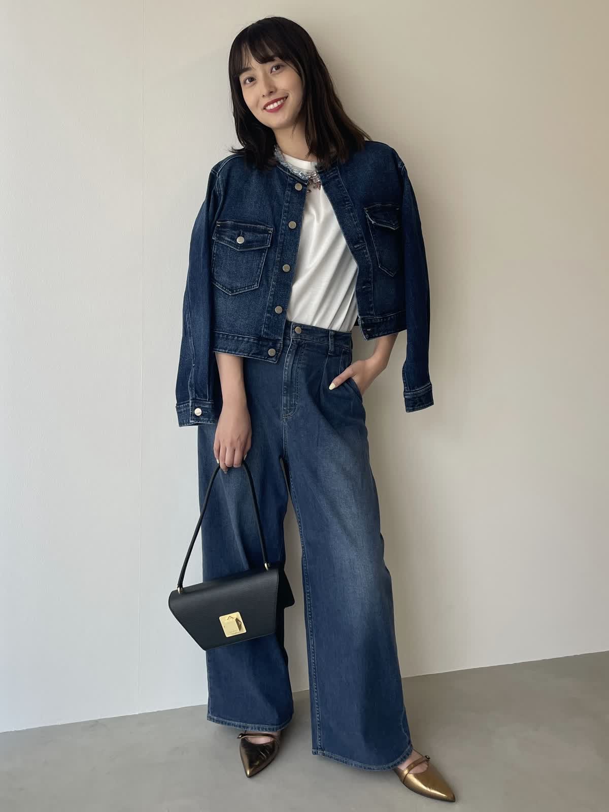 【着用カラー】ブルゾン:インディゴ、カットソー:ホワイト、パンツ:インディゴ 【着用サイズ】ブルゾン:9号、カットソー:9号、パンツ:9号 テーマは初秋のお出かけコーデです。デニムのセットアップはそれぞれでも一緒でも使うことができるので、一年中大活躍すること間違いなし。肩にかけたブルゾンのおかげでエアコンの効いた室内や、少し気温の下がる夜でも快適に過ごすことができるのも好ポイントです。パンツはワイドシルエットながら、タックが入っているので足をスラっと見せてくれるのが嬉しい。落ち着いた色味で、カジュアルにも綺麗めコーデにもばっちり合わせることができます。中に着たフレンチスリーブトップスはちょうどいい袖の長さで、腕が華奢見えできるアイテム。インナーとしても、暑い日には一枚でも着用することができます。靴とバッグ、アクセサリーは綺麗めなものを合わせて、お出かけにピッタリなコーデに仕上げました。