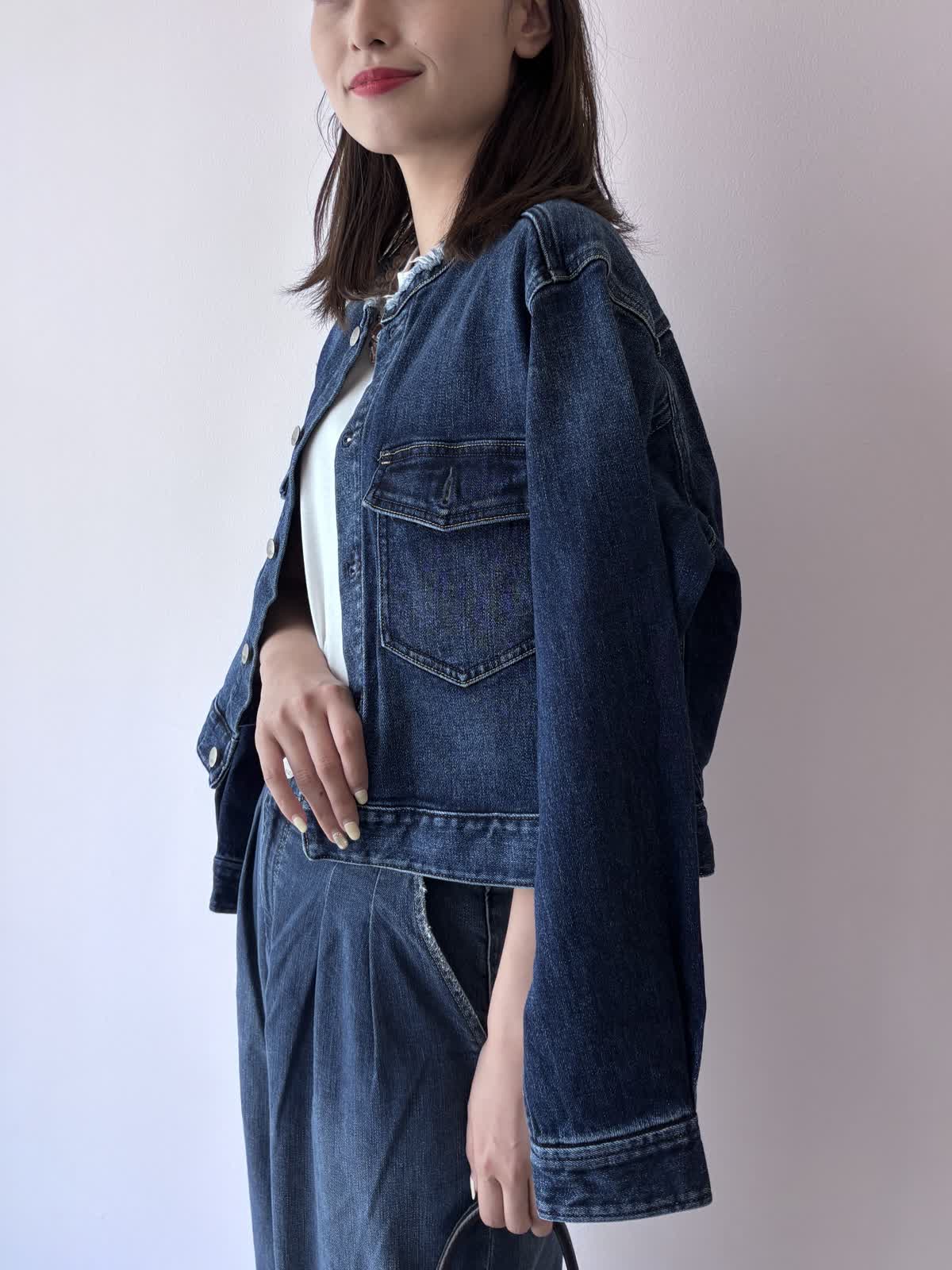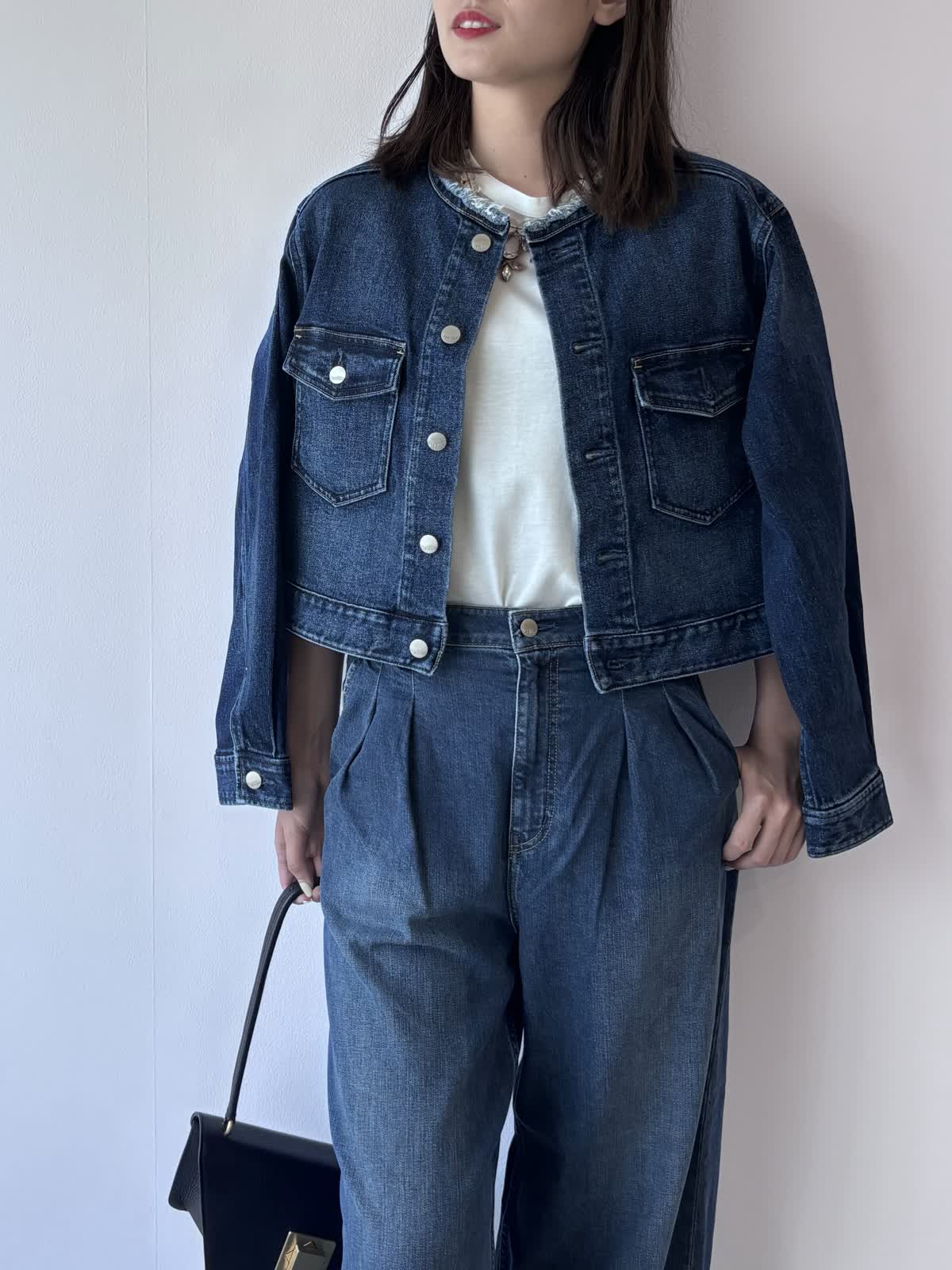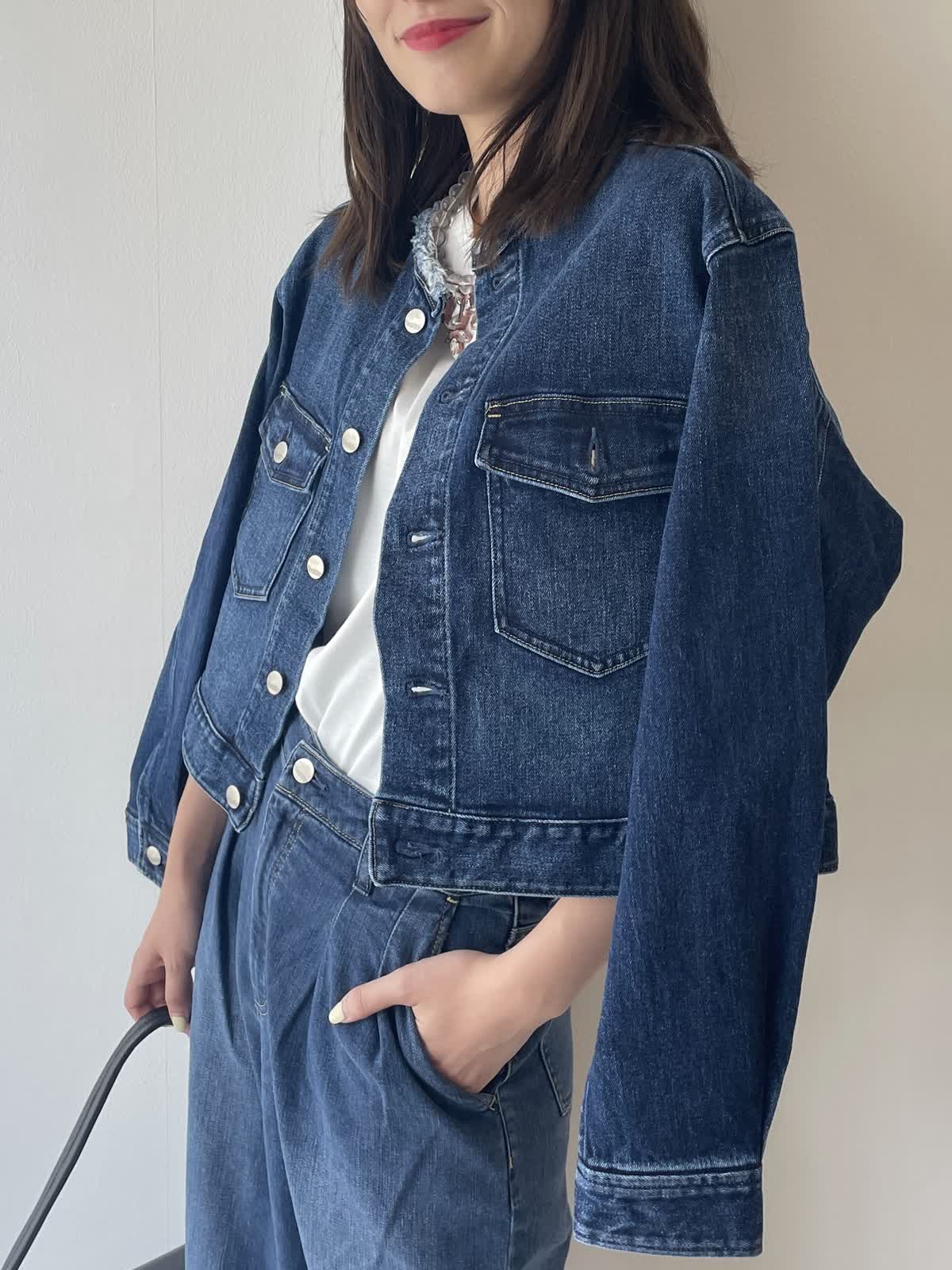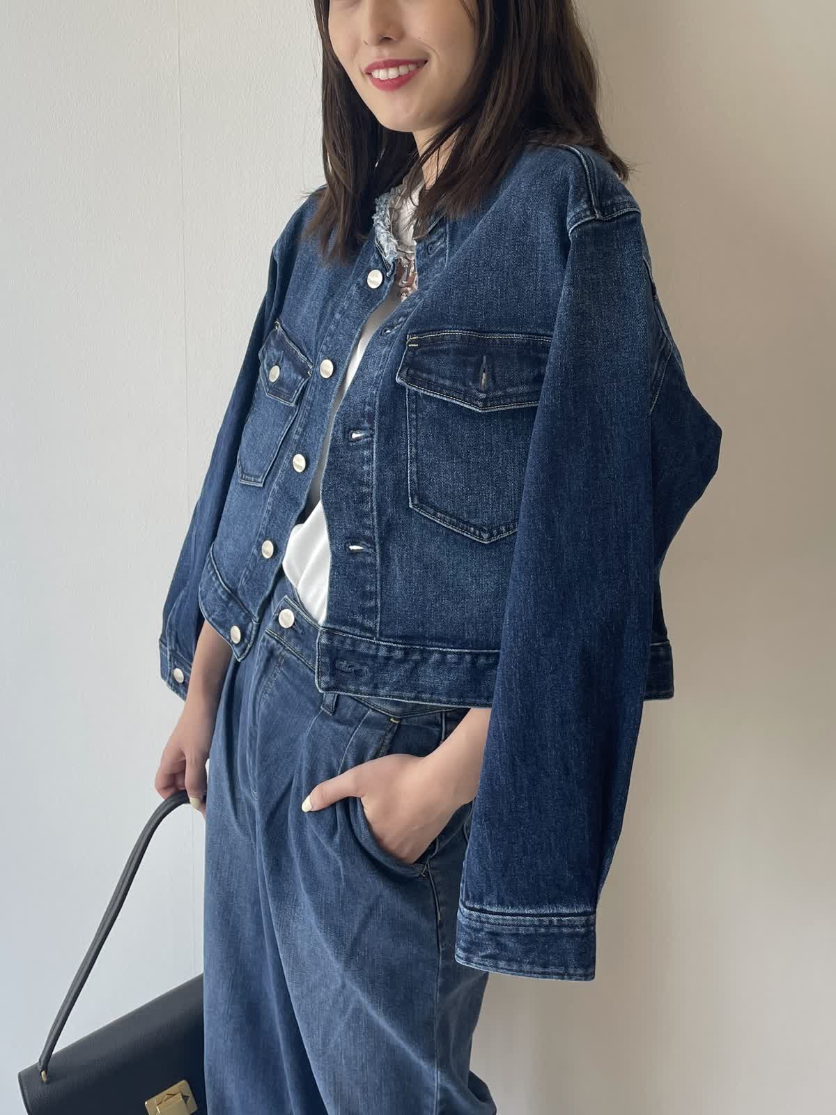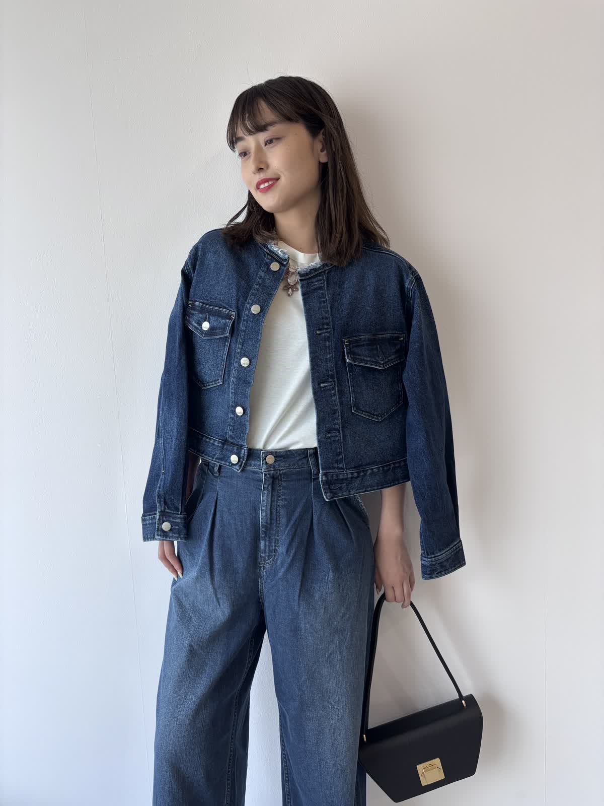 【着用カラー】ブルゾン:インディゴ、カットソー:ホワイト、パンツ:インディゴ 【着用サイズ】ブルゾン:9号、カットソー:9号、パンツ:9号 テーマは初秋のお出かけコーデです。デニムのセットアップはそれぞれでも一緒でも使うことができるので、一年中大活躍すること間違いなし。肩にかけたブルゾンのおかげでエアコンの効いた室内や、少し気温の下がる夜でも快適に過ごすことができるのも好ポイントです。パンツはワイドシルエットながら、タックが入っているので足をスラっと見せてくれるのが嬉しい。落ち着いた色味で、カジュアルにも綺麗めコーデにもばっちり合わせることができます。中に着たフレンチスリーブトップスはちょうどいい袖の長さで、腕が華奢見えできるアイテム。インナーとしても、暑い日には一枚でも着用することができます。靴とバッグ、アクセサリーは綺麗めなものを合わせて、お出かけにピッタリなコーデに仕上げました。