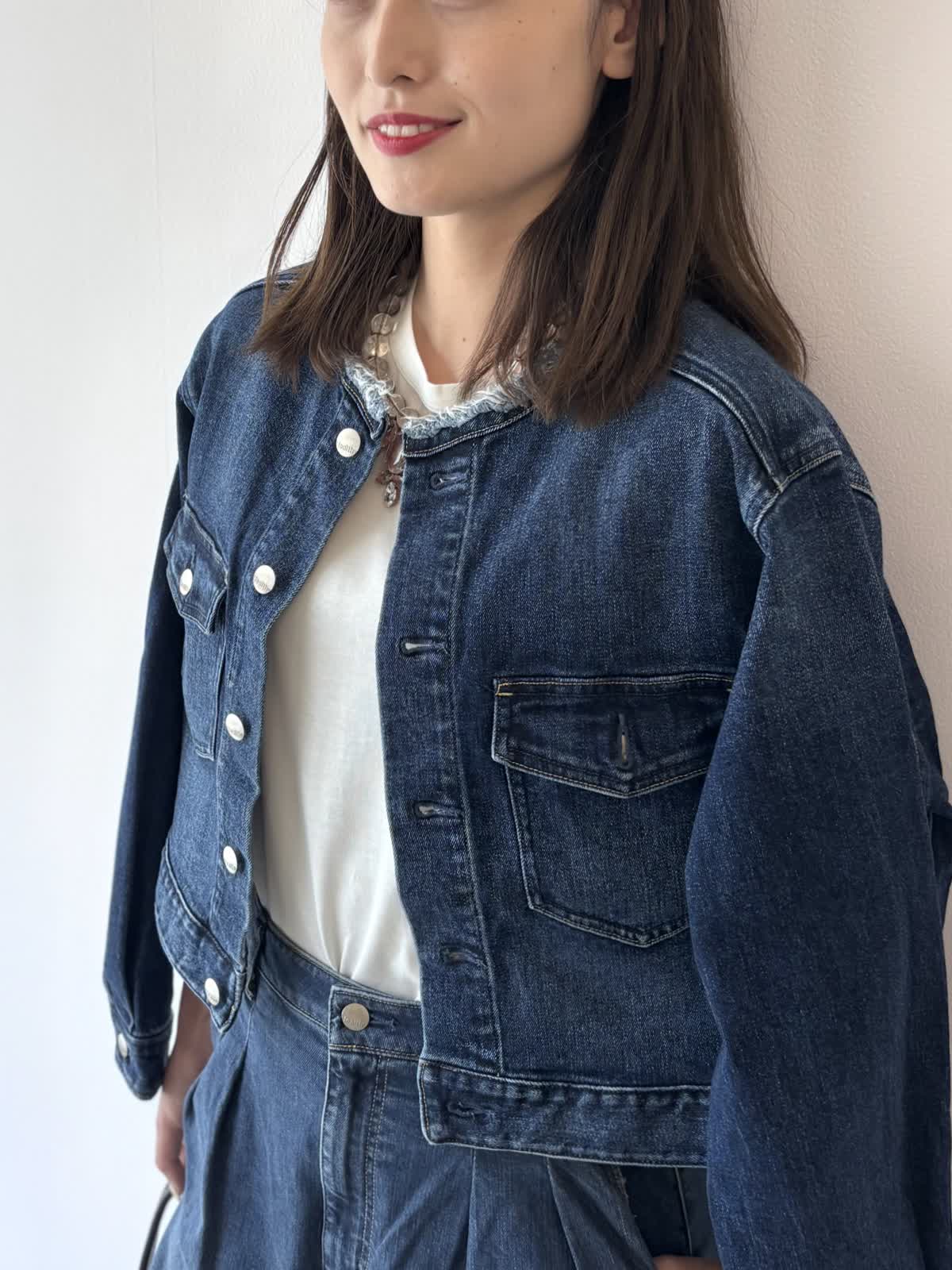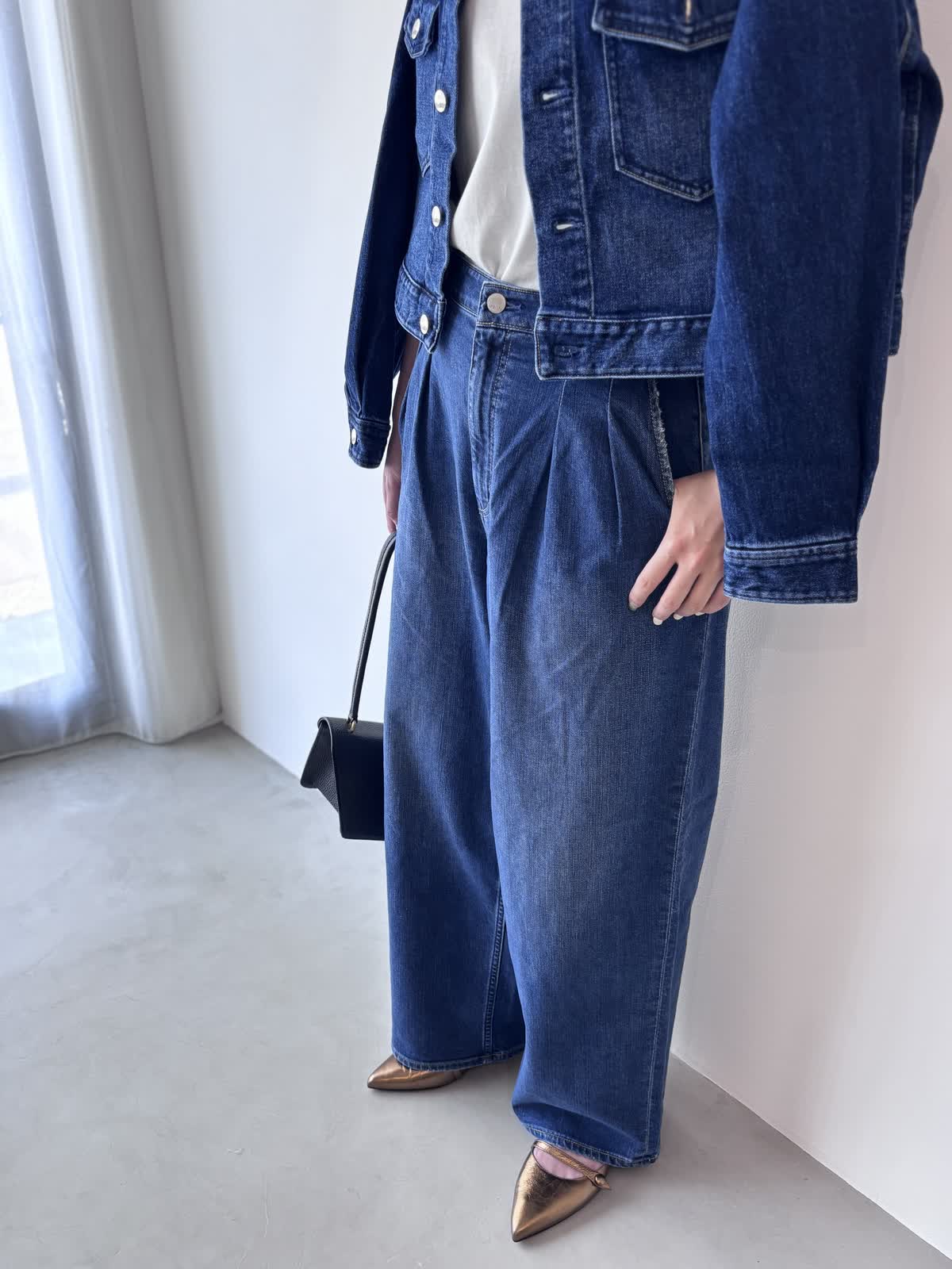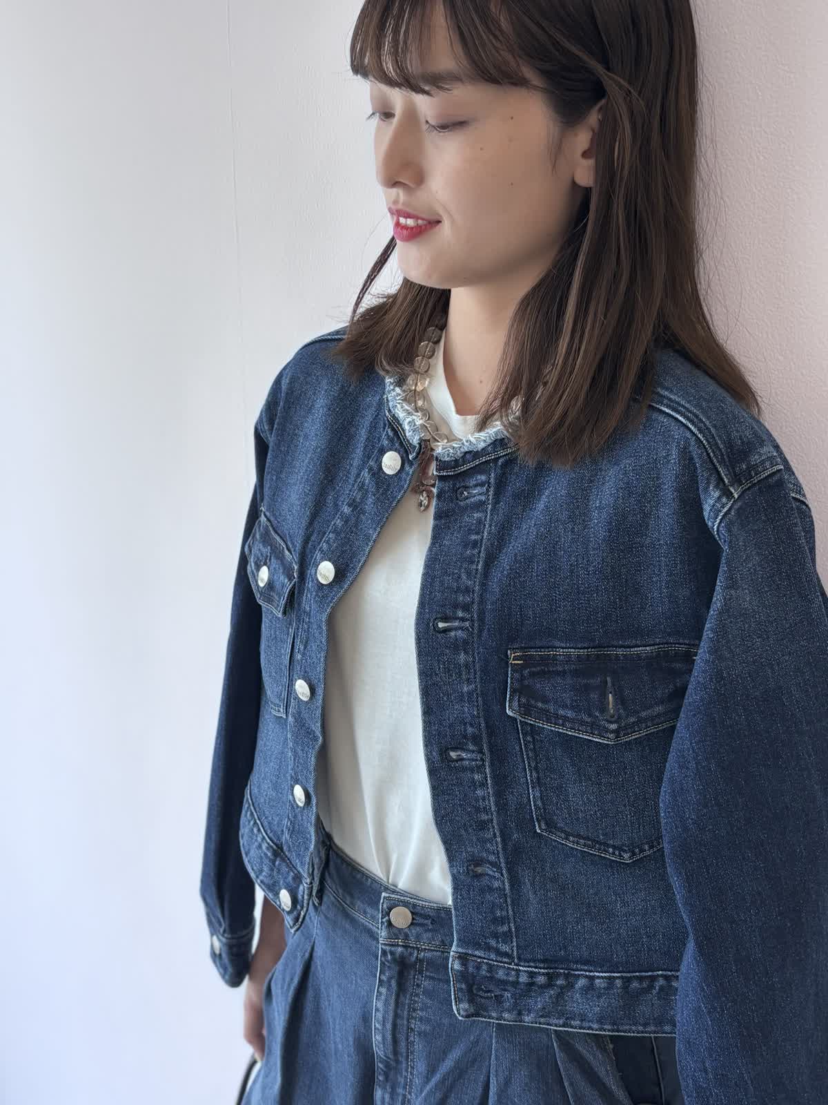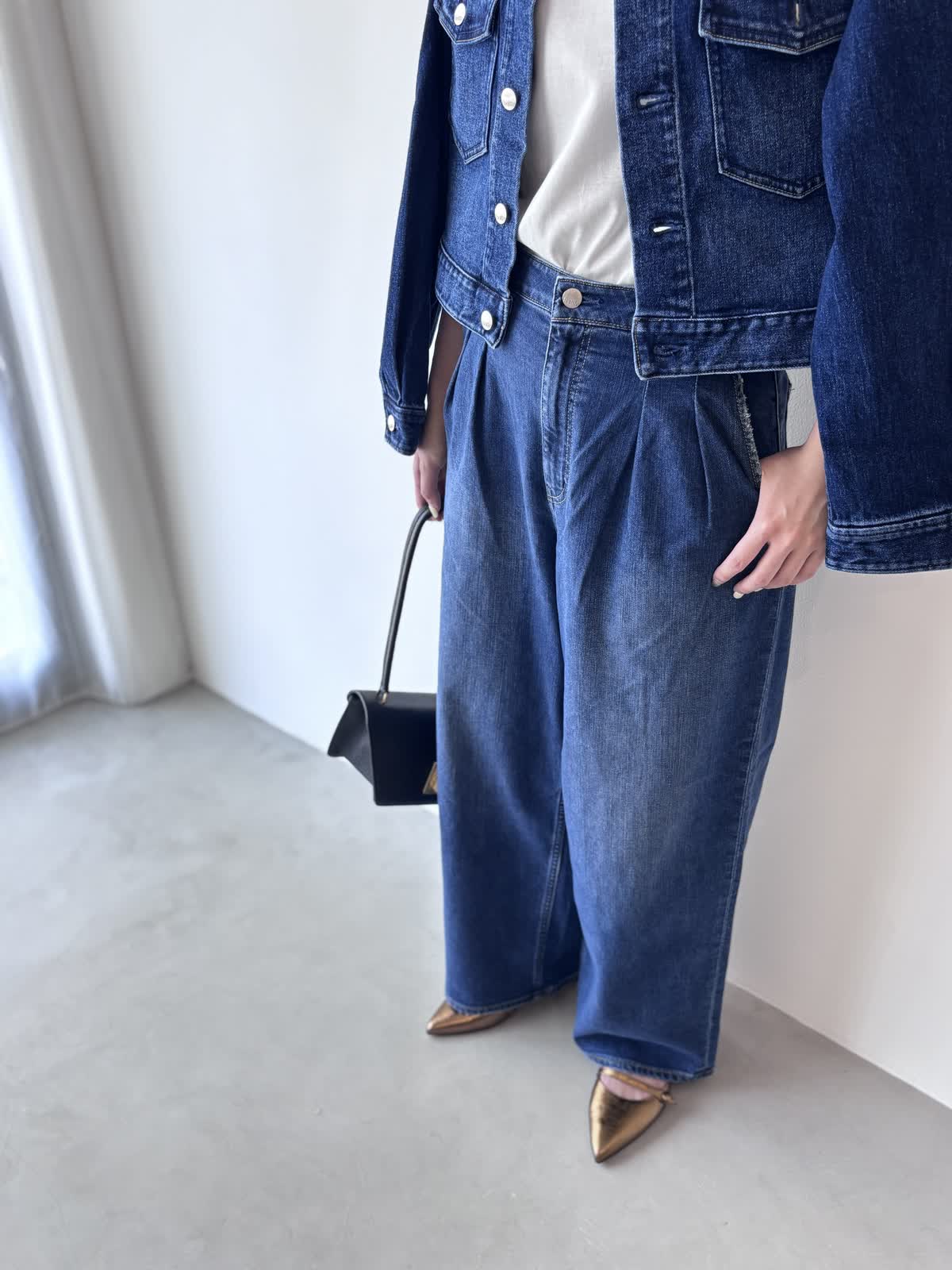 【着用カラー】ブルゾン:インディゴ、カットソー:ホワイト、パンツ:インディゴ 【着用サイズ】ブルゾン:9号、カットソー:9号、パンツ:9号 テーマは初秋のお出かけコーデです。デニムのセットアップはそれぞれでも一緒でも使うことができるので、一年中大活躍すること間違いなし。肩にかけたブルゾンのおかげでエアコンの効いた室内や、少し気温の下がる夜でも快適に過ごすことができるのも好ポイントです。パンツはワイドシルエットながら、タックが入っているので足をスラっと見せてくれるのが嬉しい。落ち着いた色味で、カジュアルにも綺麗めコーデにもばっちり合わせることができます。中に着たフレンチスリーブトップスはちょうどいい袖の長さで、腕が華奢見えできるアイテム。インナーとしても、暑い日には一枚でも着用することができます。靴とバッグ、アクセサリーは綺麗めなものを合わせて、お出かけにピッタリなコーデに仕上げました。