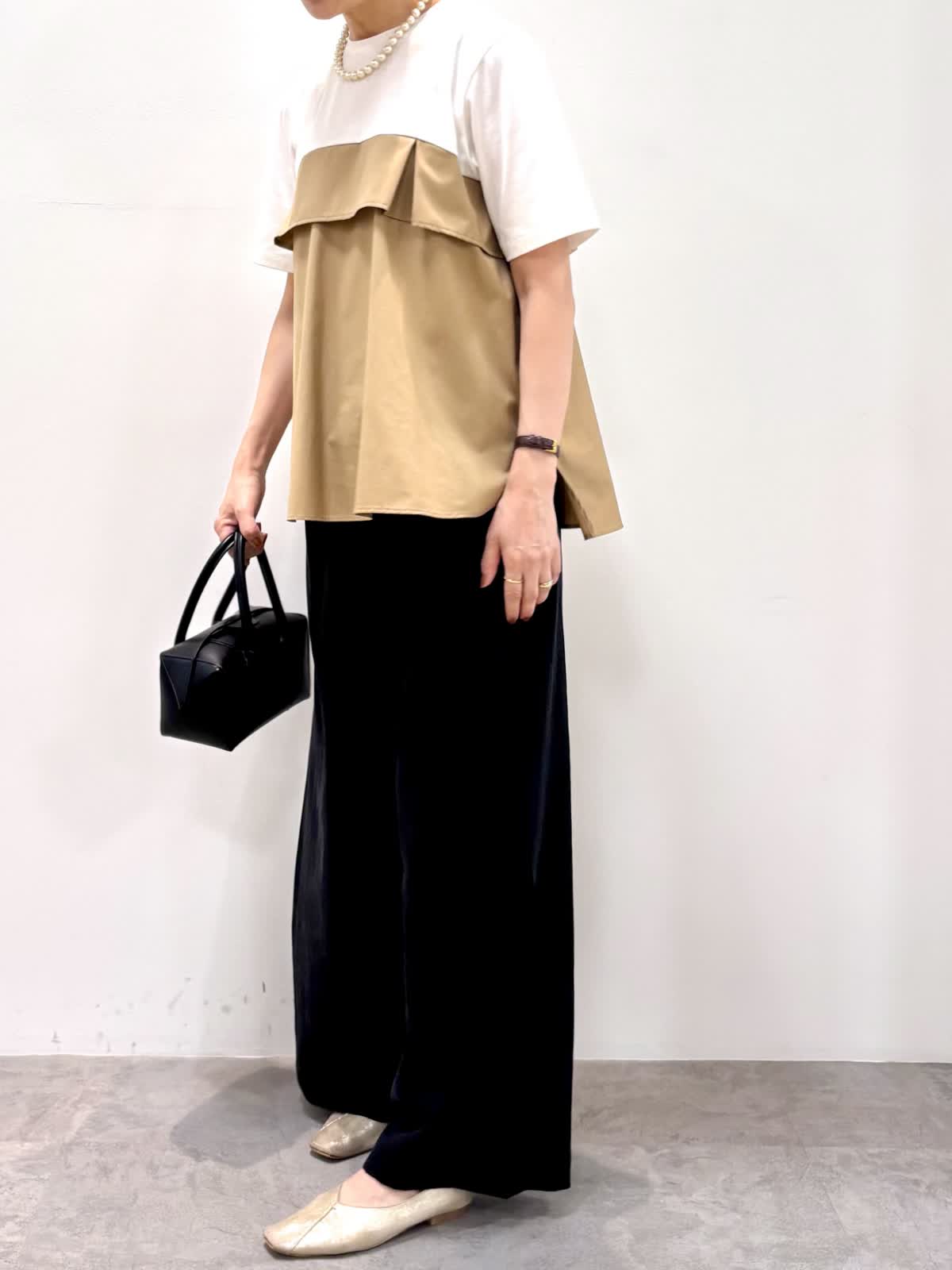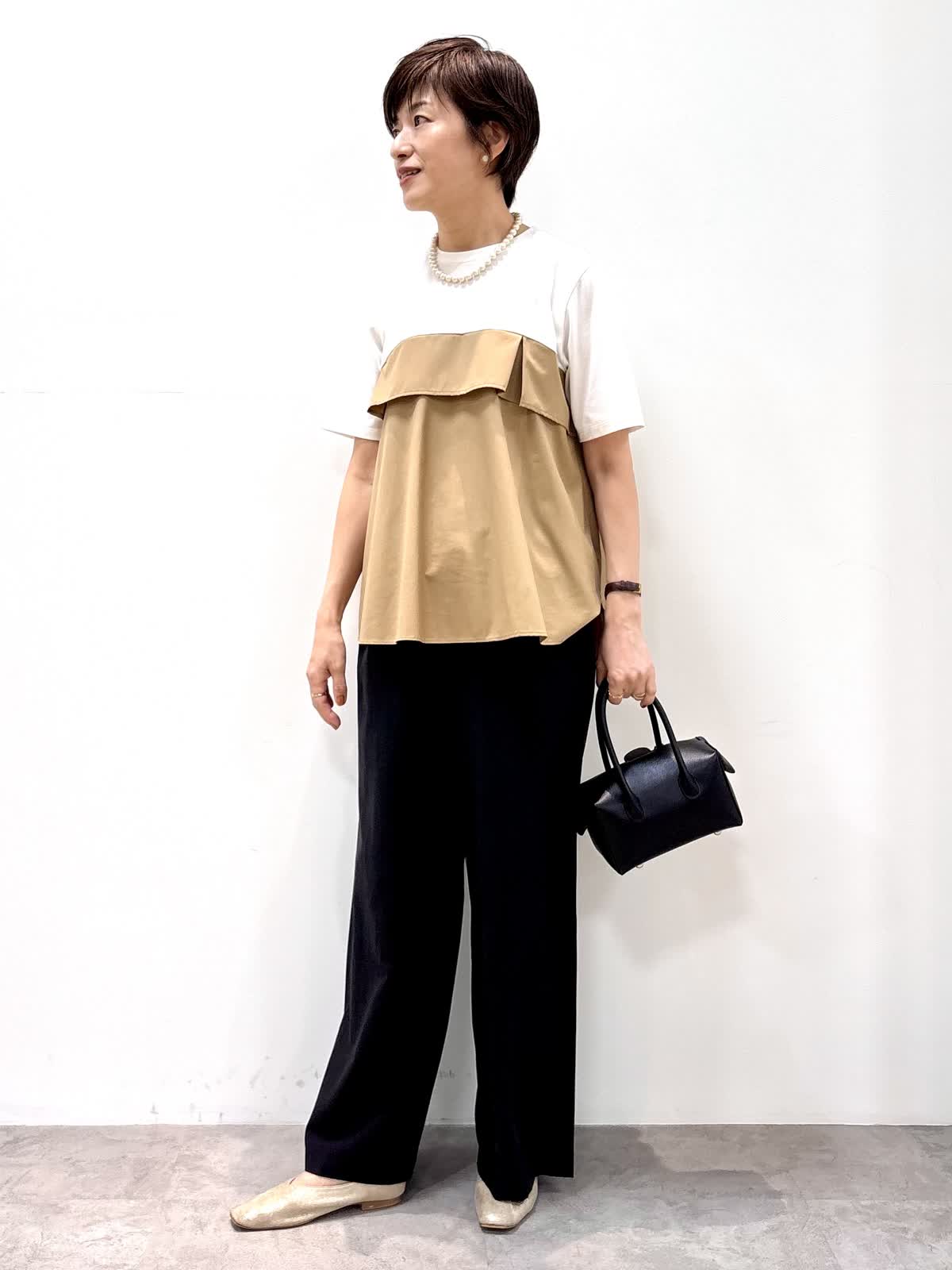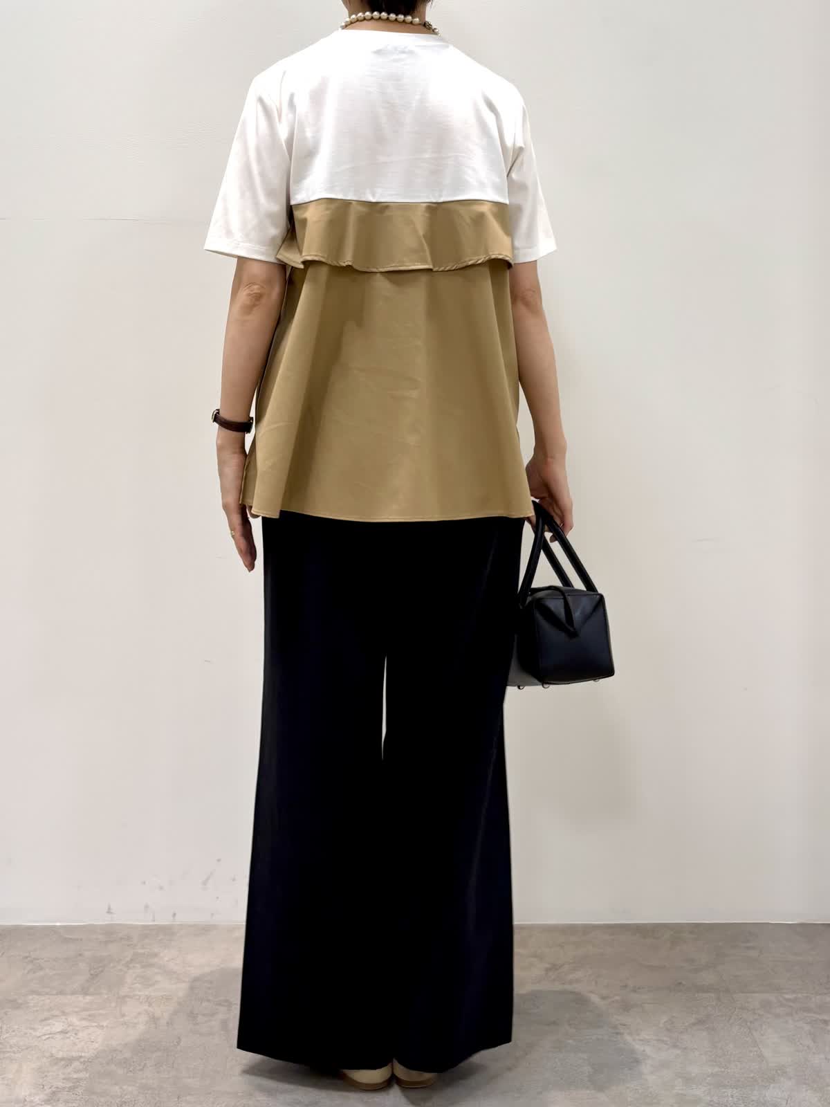 [着用サイズ]カットソー:9号 パンツ:9号 [着用カラー]カットソー:ベージュ パンツ:ブラック 1枚で着映えするビスチェ風カットソーはハリのあるカット素材でエレガントな雰囲気です。上半身に目が行くのでスタイルアップして見えます。ゆとりのあるワイドパンツはウエストゴム使用で楽チンです。 涼しい素材で残暑が厳しい秋もノンストレスで着ていただけます。