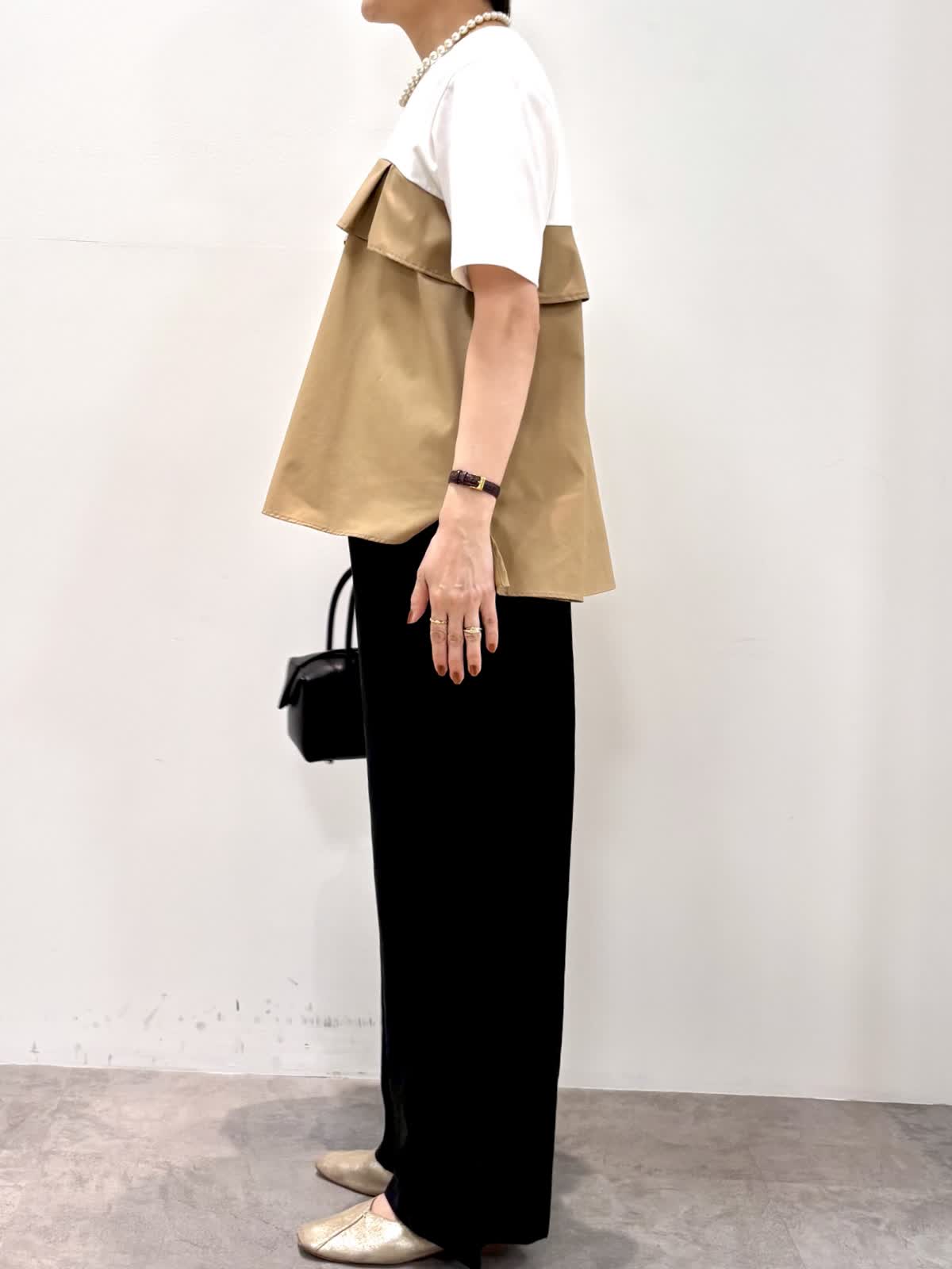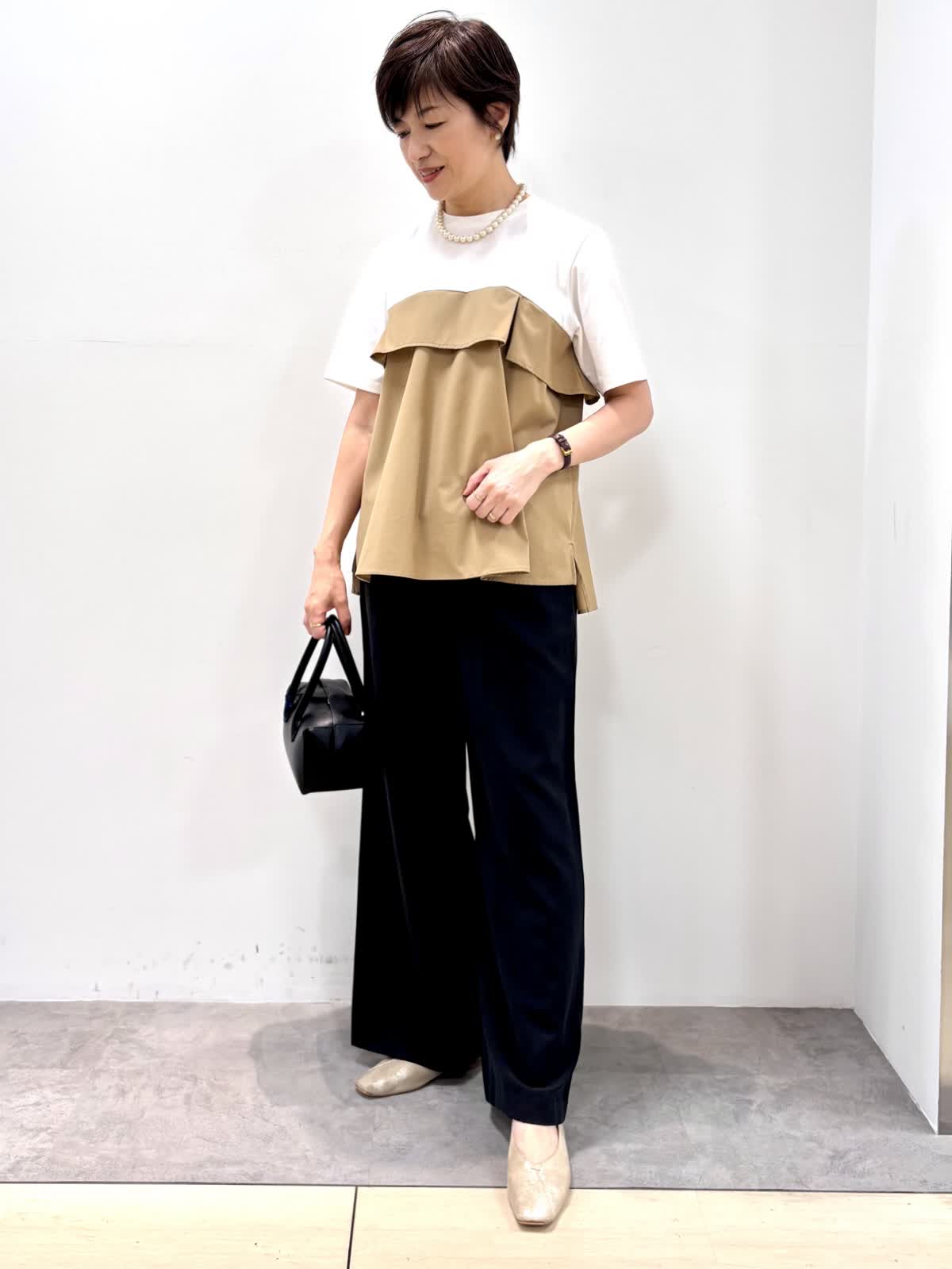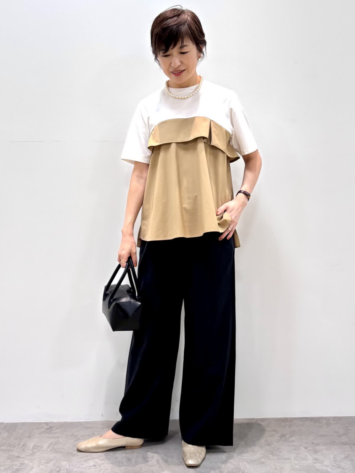[着用サイズ]カットソー:9号 パンツ:9号 [着用カラー]カットソー:ベージュ パンツ:ブラック 1枚で着映えするビスチェ風カットソーはハリのあるカット素材でエレガントな雰囲気です。上半身に目が行くのでスタイルアップして見えます。ゆとりのあるワイドパンツはウエストゴム使用で楽チンです。 涼しい素材で残暑が厳しい秋もノンストレスで着ていただけます。