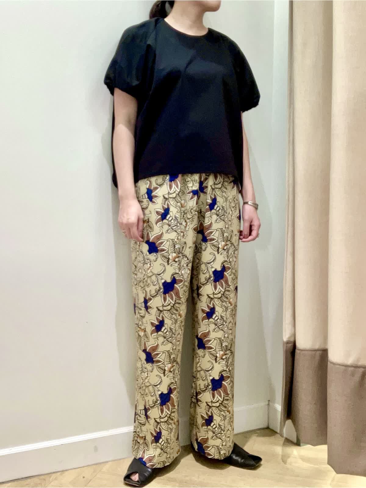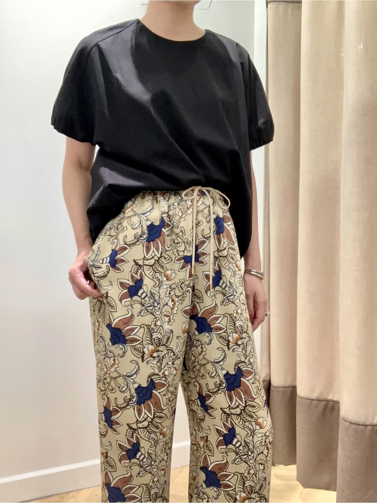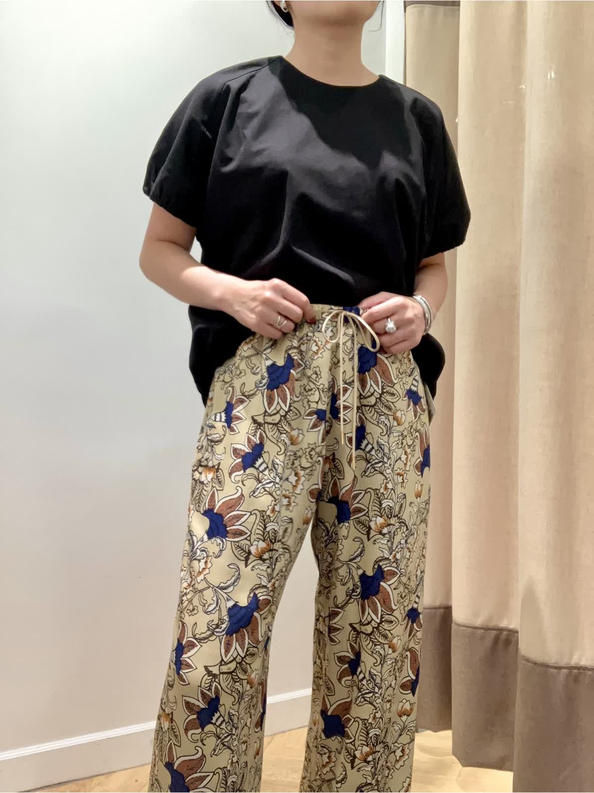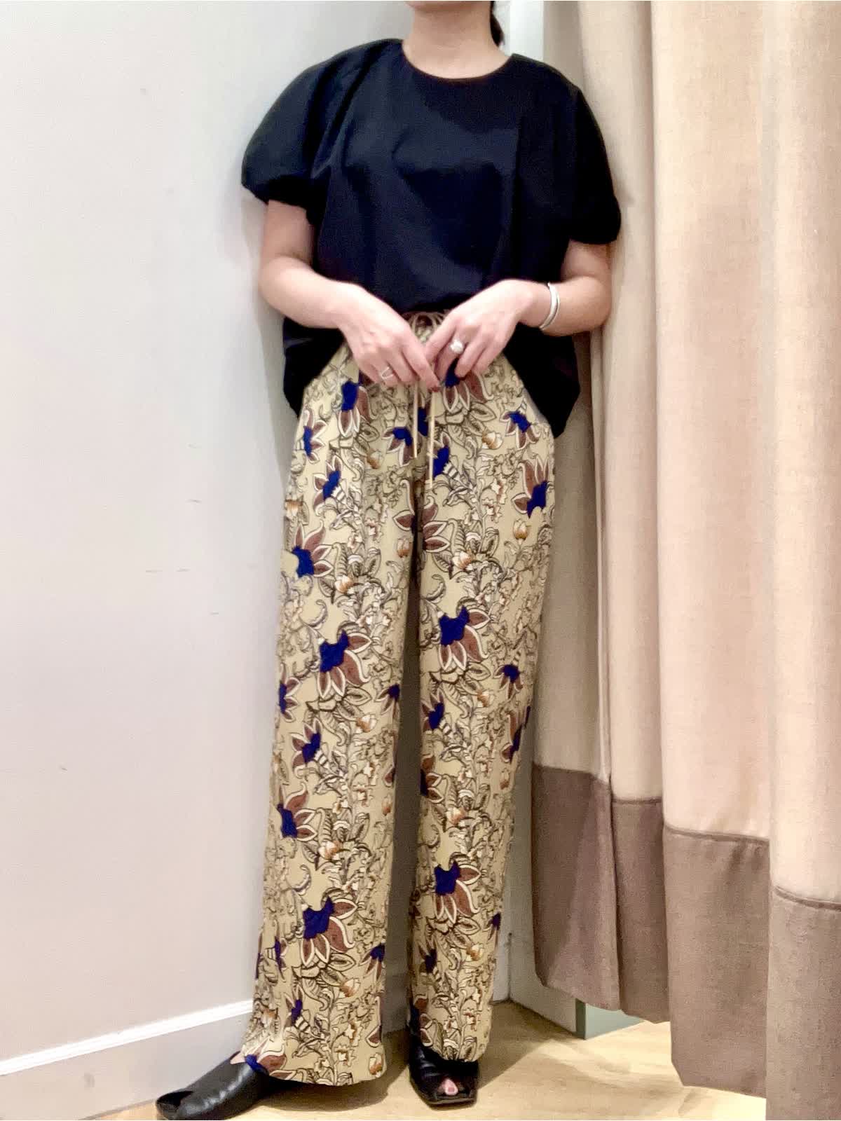 【着用サイズ】カットソー:フリー パンツ:9号【着用カラー】カットソー:ブラック パンツ:ベージュ 秋の始まりにすぐに使える、旅行やお買い物シーンにおすすめのコーデ。プリントパンツは落ち着いたカラーで取り入れるだけで季節感が上がる 1着です。シワになりにくいので長時間座る日も安心。肌当たりも良くストレスフリーです。