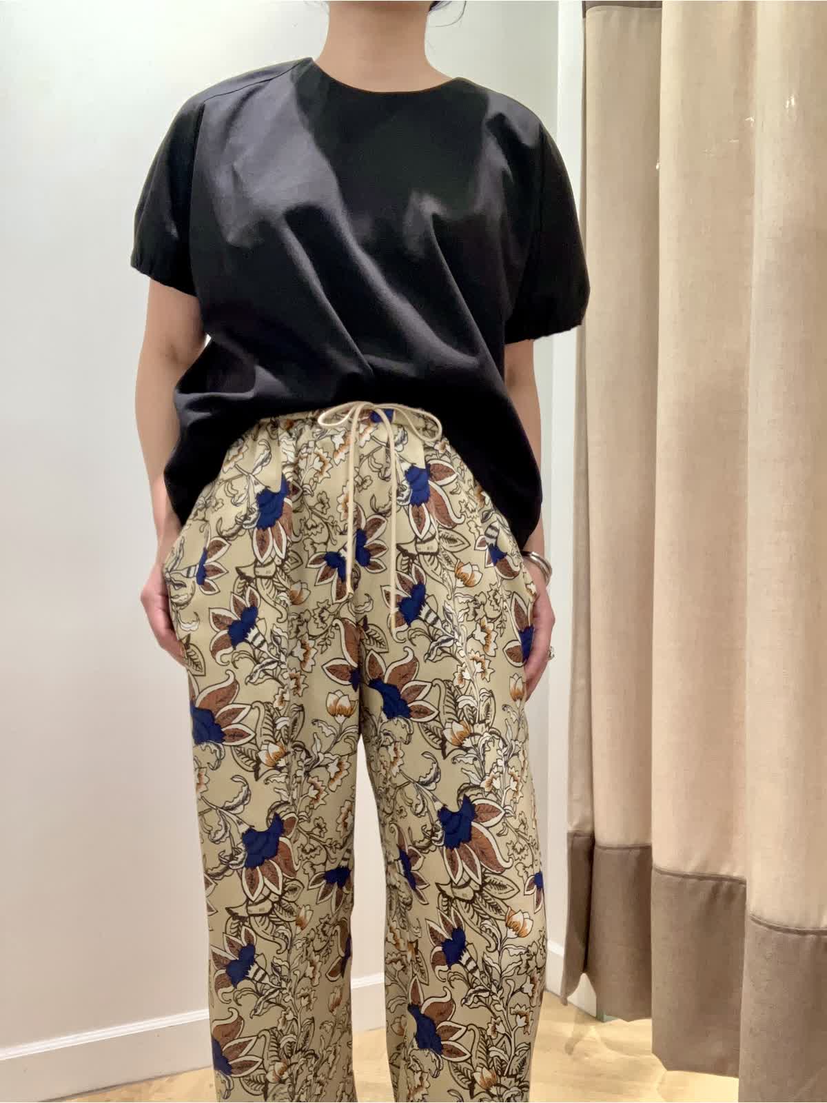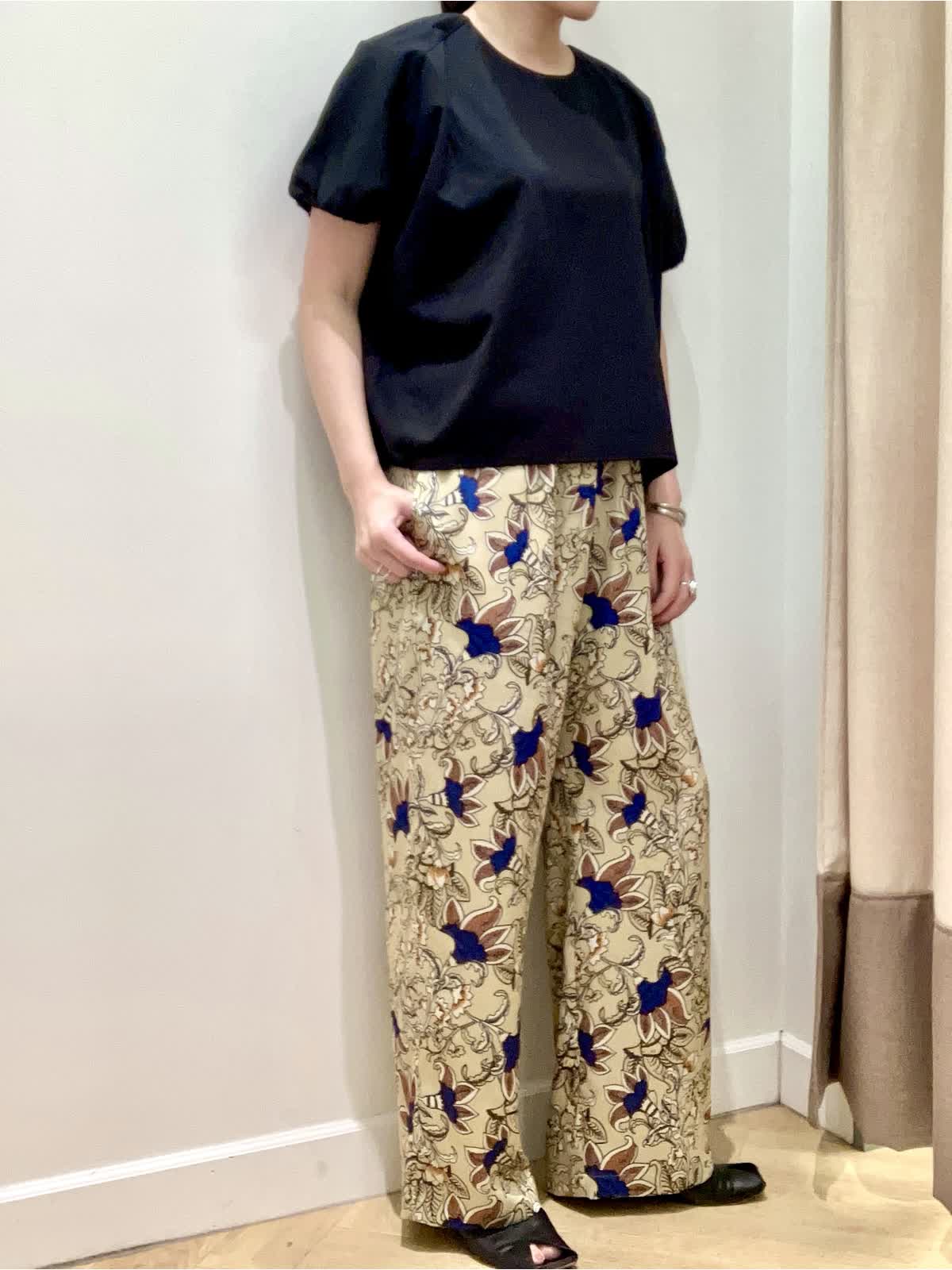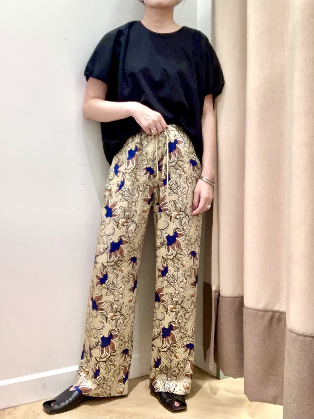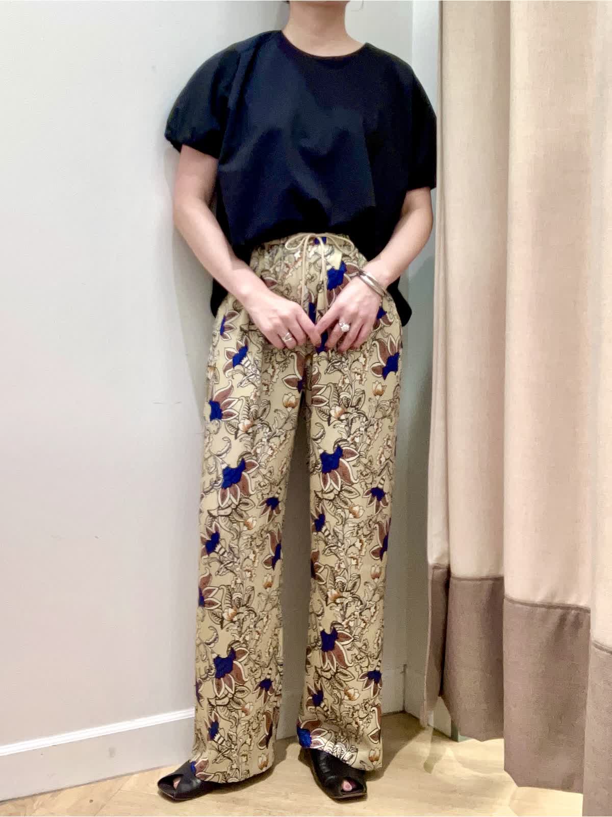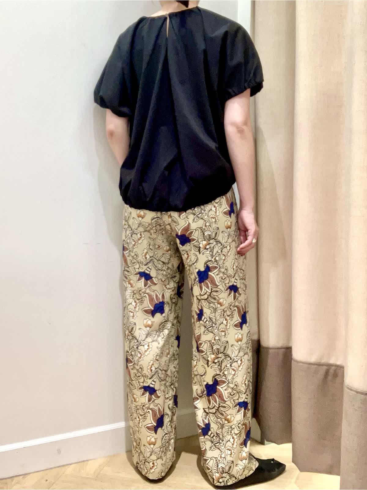 【着用サイズ】カットソー:フリー パンツ:9号【着用カラー】カットソー:ブラック パンツ:ベージュ 秋の始まりにすぐに使える、旅行やお買い物シーンにおすすめのコーデ。プリントパンツは落ち着いたカラーで取り入れるだけで季節感が上がる 1着です。シワになりにくいので長時間座る日も安心。肌当たりも良くストレスフリーです。