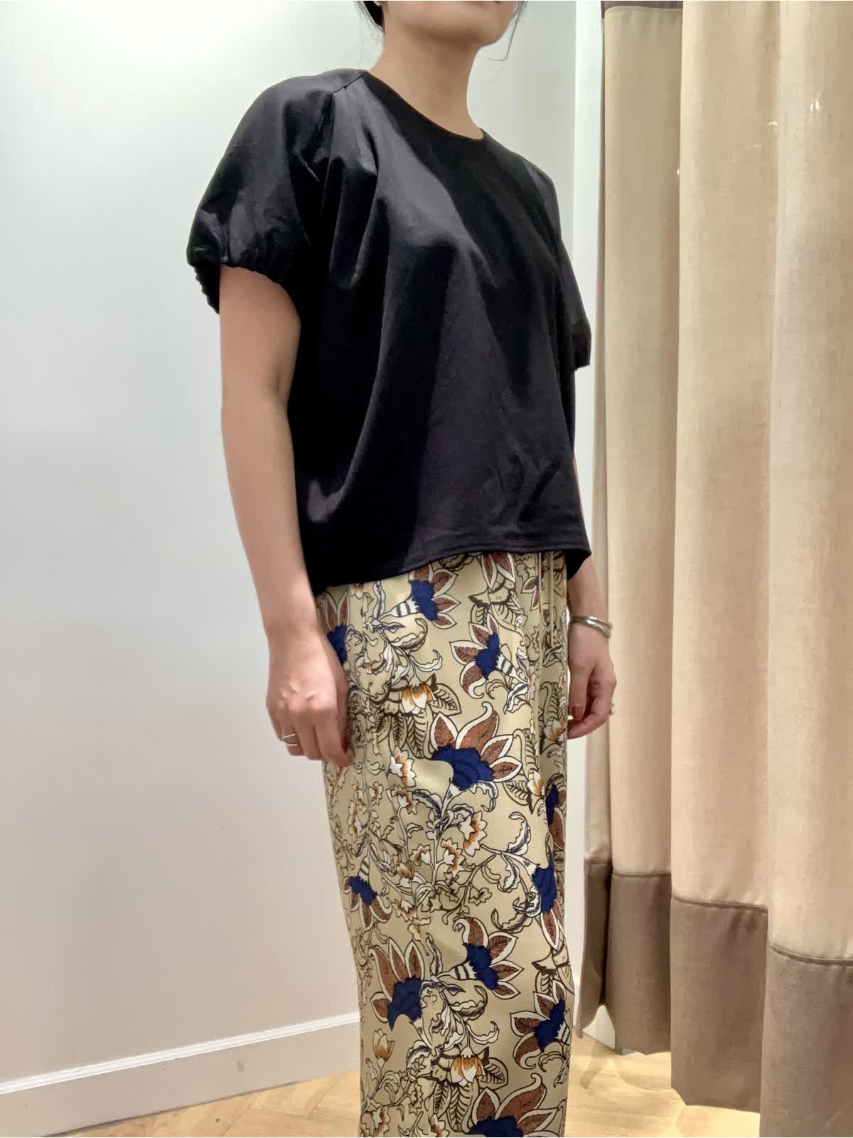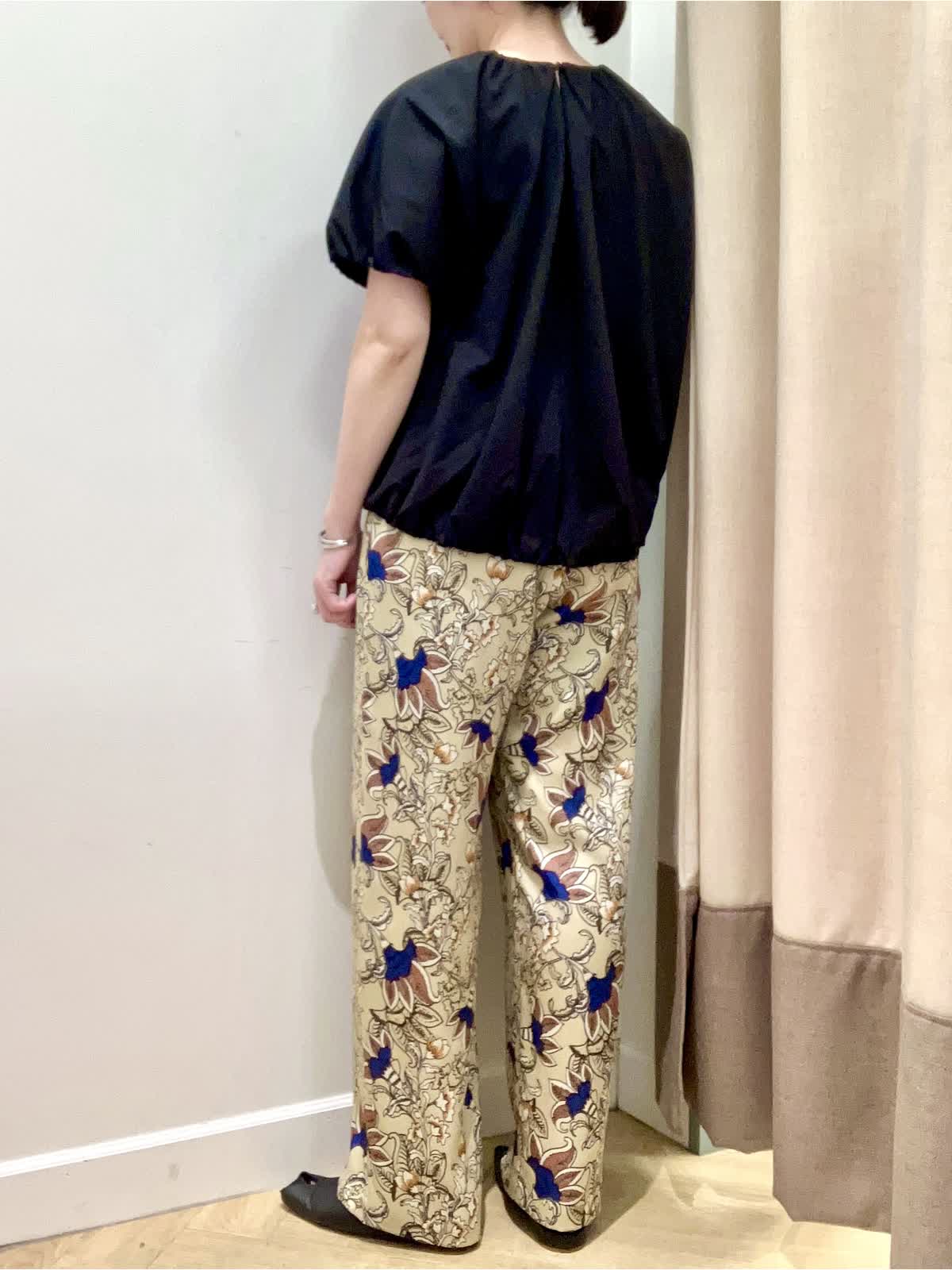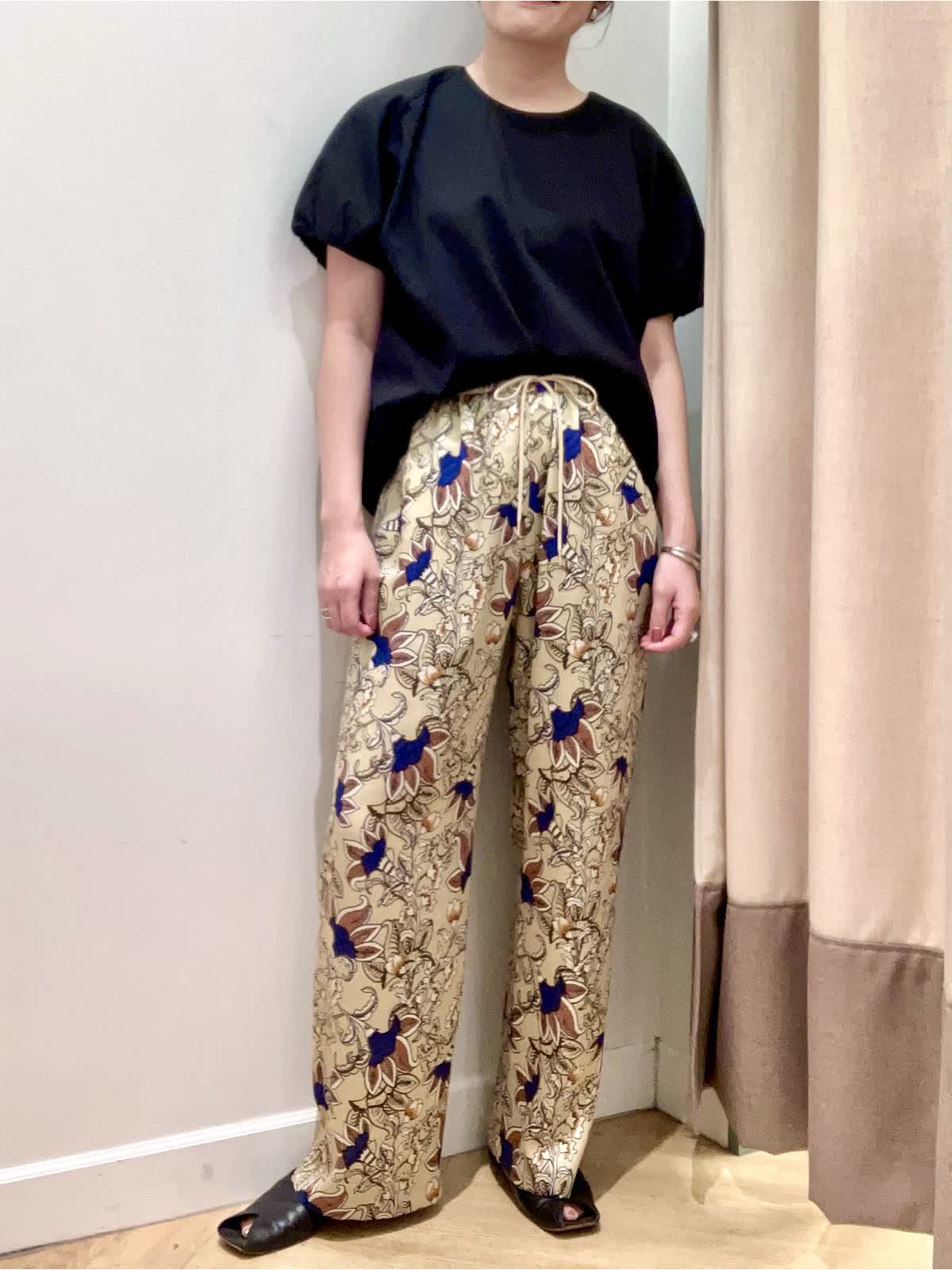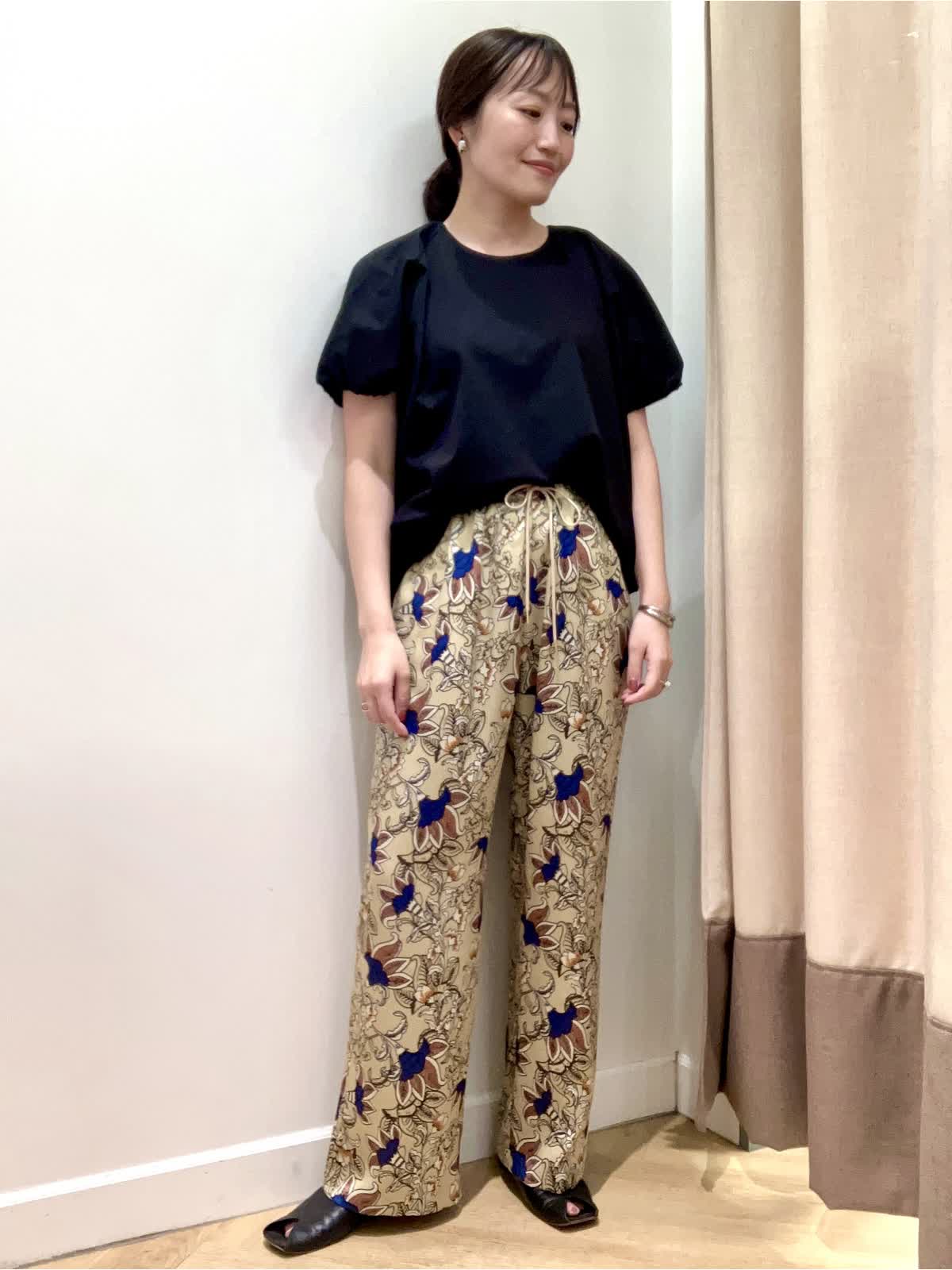 【着用サイズ】カットソー:フリー パンツ:9号【着用カラー】カットソー:ブラック パンツ:ベージュ 秋の始まりにすぐに使える、旅行やお買い物シーンにおすすめのコーデ。プリントパンツは落ち着いたカラーで取り入れるだけで季節感が上がる 1着です。シワになりにくいので長時間座る日も安心。肌当たりも良くストレスフリーです。