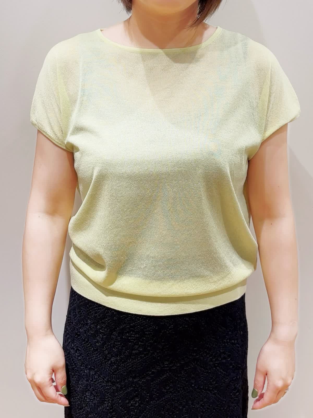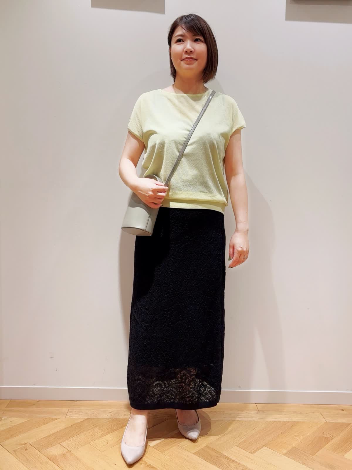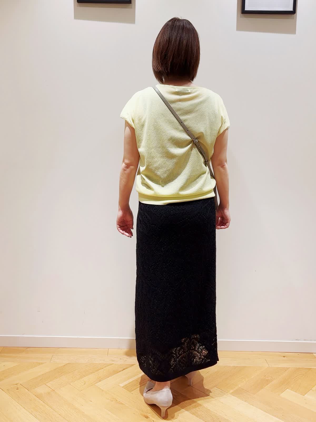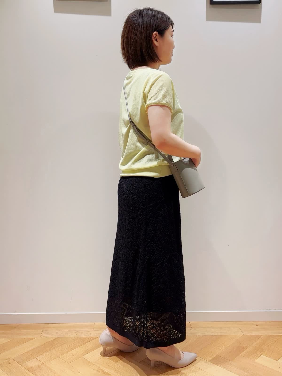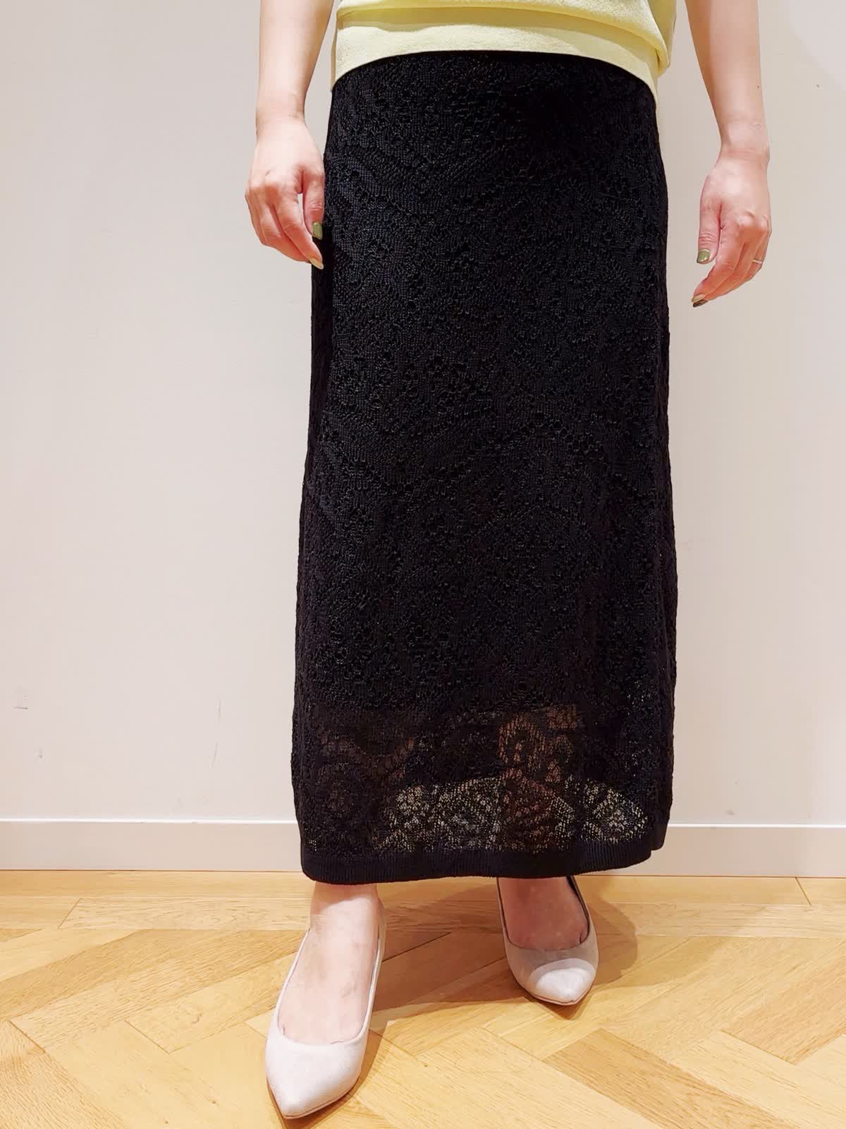 【着用サイズ】ニット:9号スカート:9号 【着用カラー】ニット:イエロー スカート:ブラック お出掛けスタイリング。適度なシアー感のあるニットは今すぐ着れるおしゃれアイテムです。極細の糸で編み立てられているので着心地抜群です。シンプルなデザインなので一枚着やインナーなど幅広くコーディネートができます。スカートはレース柄が上品なでニット素材の為、伸縮性がよくウエストはゴム仕様で動きやすいです。