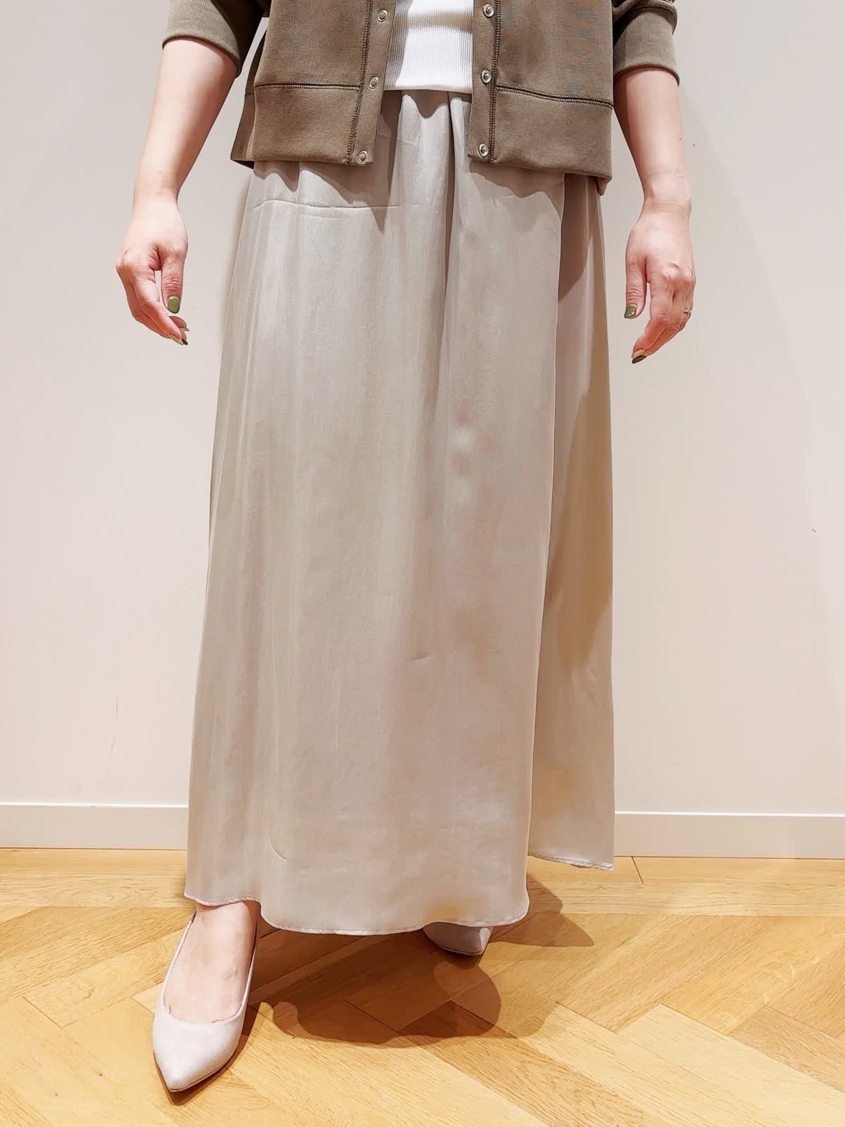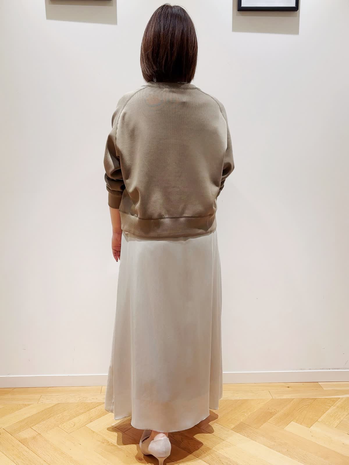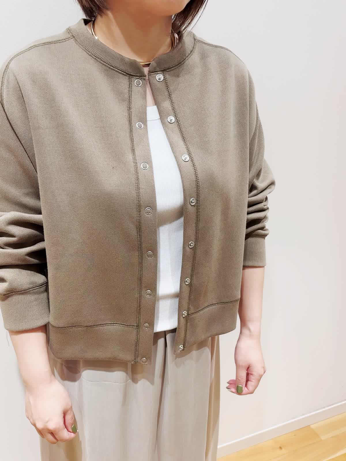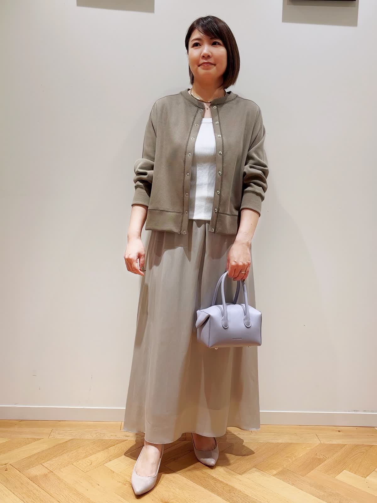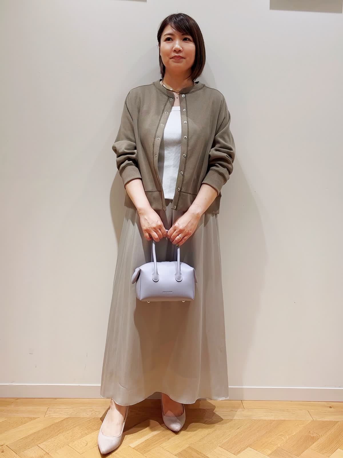 【着用サイズ】カーディガン:9号 カットソー:9号 スカート:9号 【着用カラー】カーディガン:カーキ カットソー:オフホワイト スカート:グレーベージュ バック:ラベンダー カーディガンはハリ感のあるダンボール素材なので立体的なシルエットがポイントです。程よい厚みと柔らかさがあり羽織りやすいです。晩夏から秋にかけて長く着用して頂けます。何にでも合わせやすく万能カーディガンです。キュプラでサラッと快適な履き心地のスカートはウエストがドロストで調整できます。腰回りをすっきりみせてくれるので、トップスを選ばず着回せます。