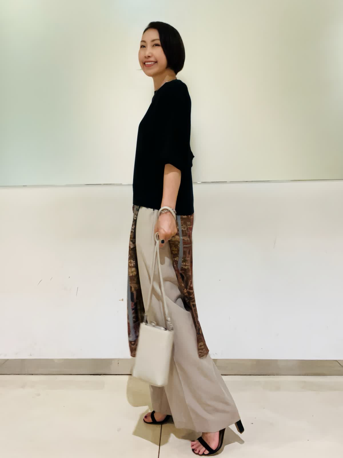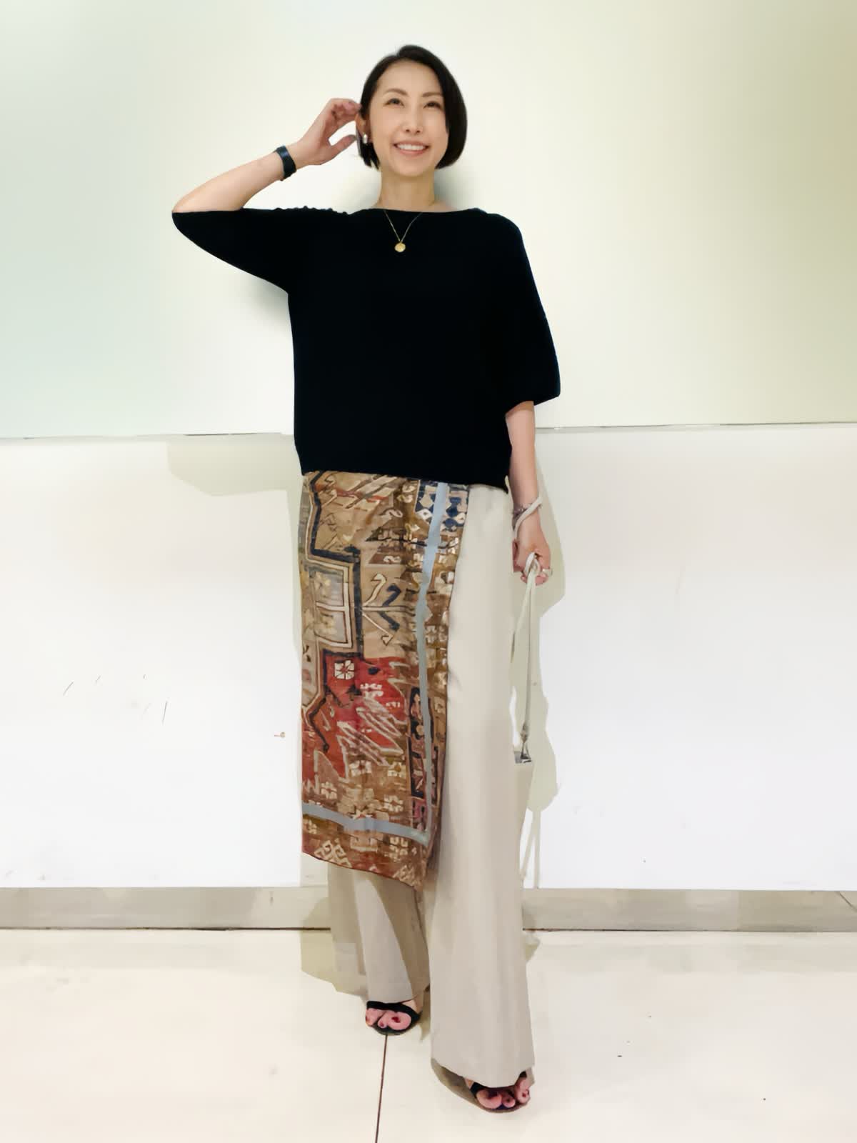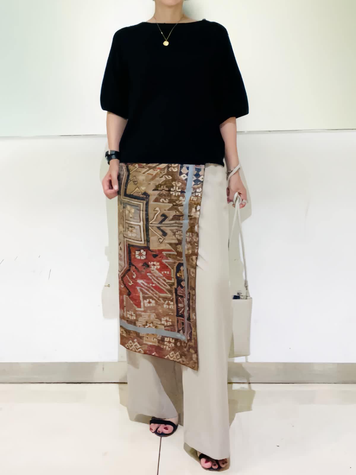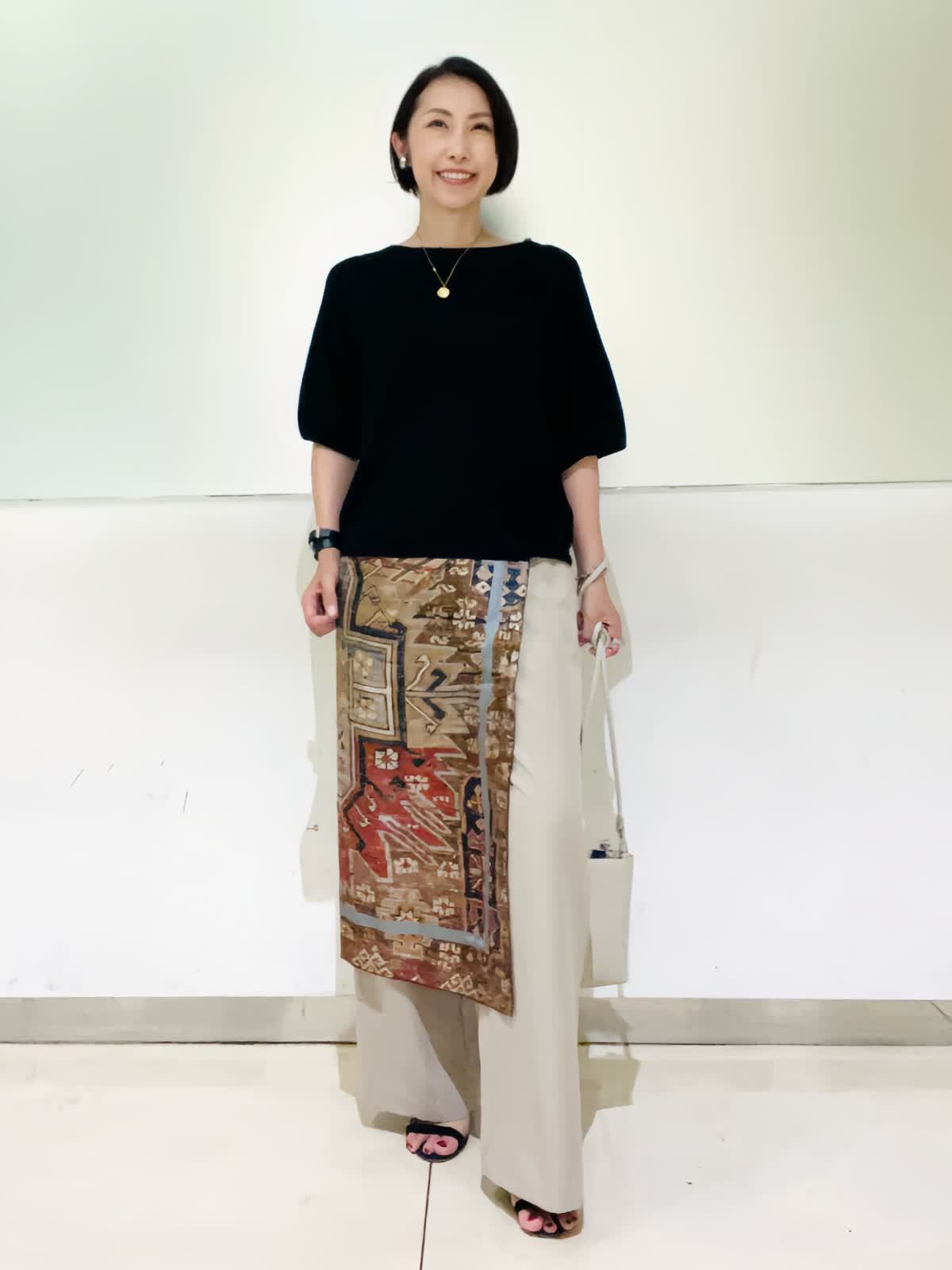 【着用アイテム】すべて9号 【着用カラー】ニット:ブラック パンツ:ベージュ 晩夏の時期まで着られる秋カラーコーディネート。ニットはキュプラ混でさらっとした着心地なので、汗ばむ時期も快適です。二の腕が隠れる五部袖が嬉しいポイント。パンツはウエストゴムでストレスフリーの履き心地。秋色の大判スカーフを腰巻きしてアクセントにしました。