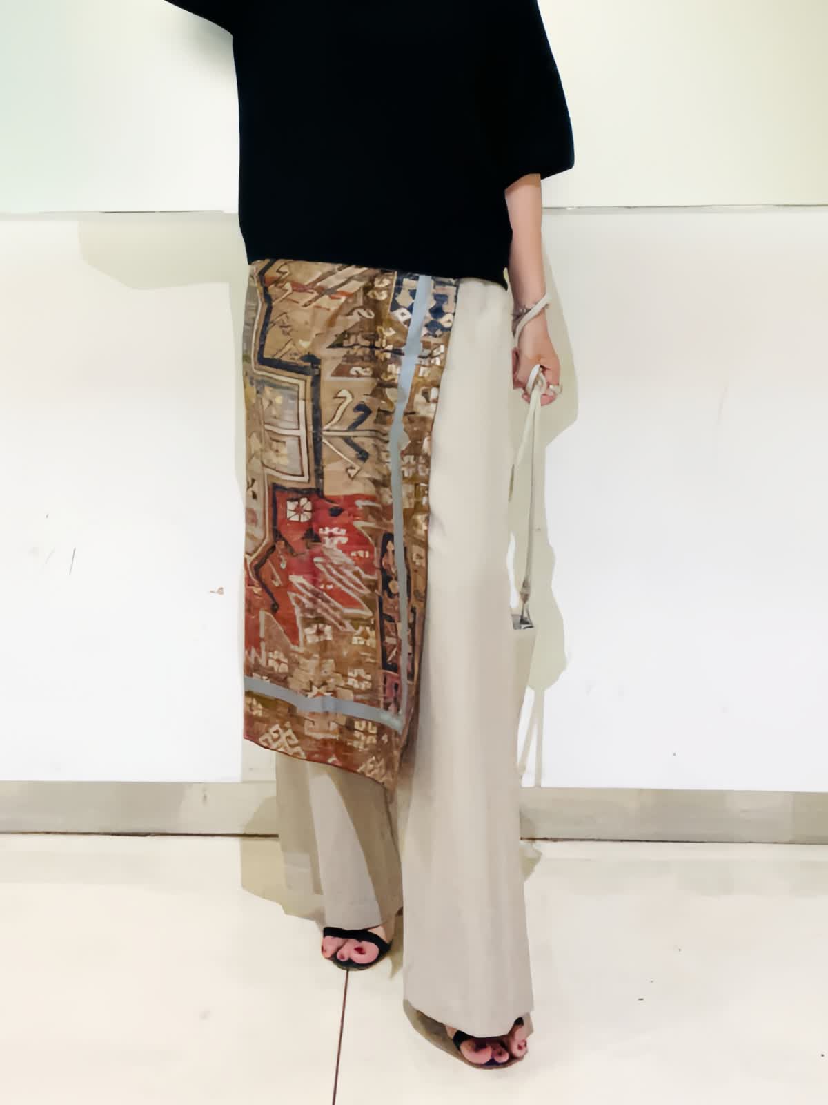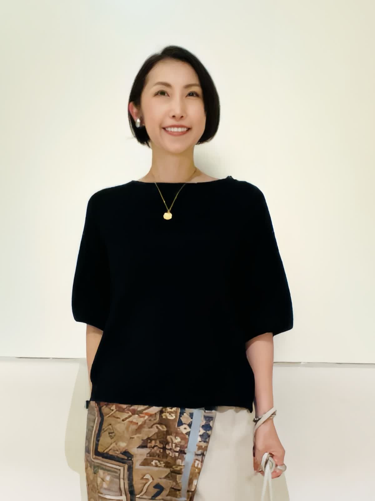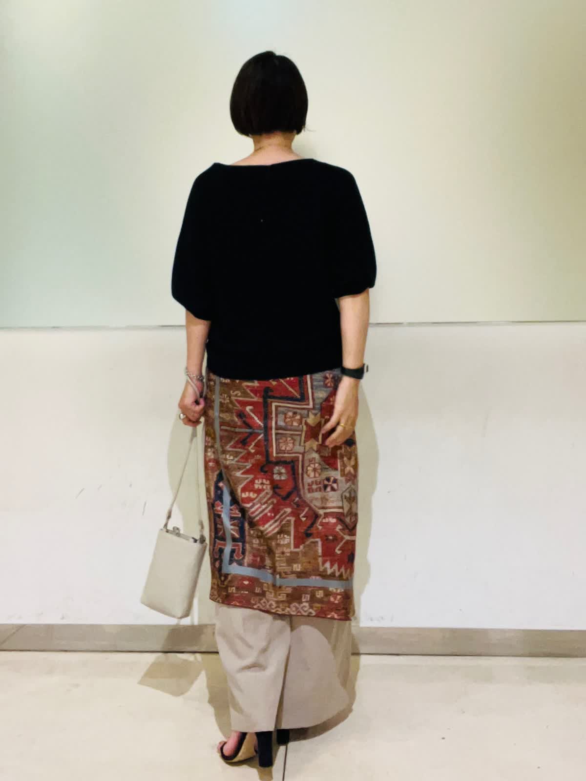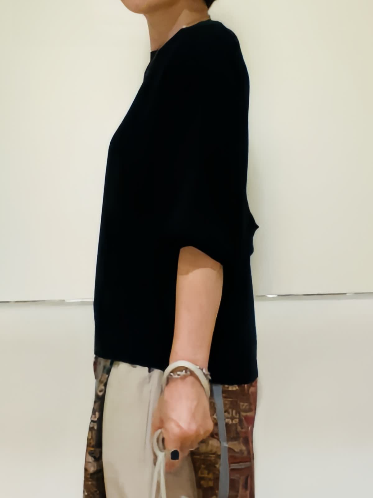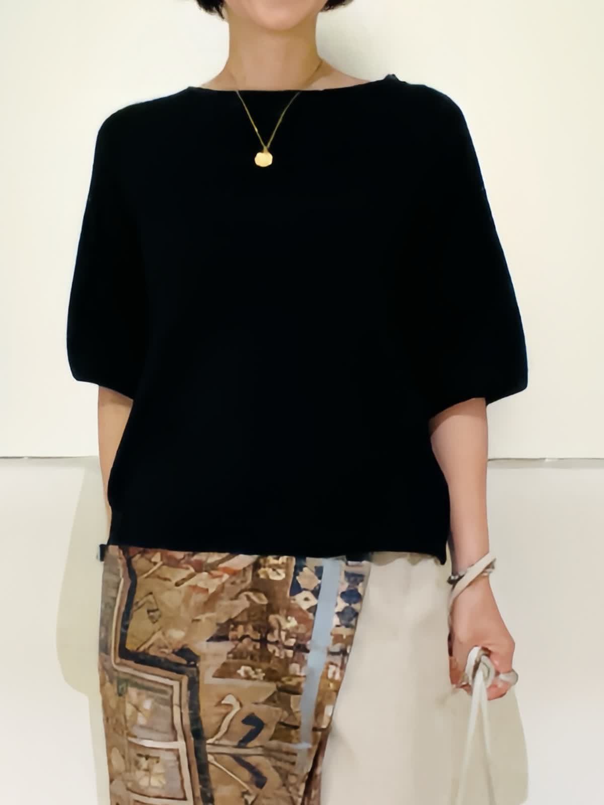 【着用アイテム】すべて9号 【着用カラー】ニット:ブラック パンツ:ベージュ 晩夏の時期まで着られる秋カラーコーディネート。ニットはキュプラ混でさらっとした着心地なので、汗ばむ時期も快適です。二の腕が隠れる五部袖が嬉しいポイント。パンツはウエストゴムでストレスフリーの履き心地。秋色の大判スカーフを腰巻きしてアクセントにしました。