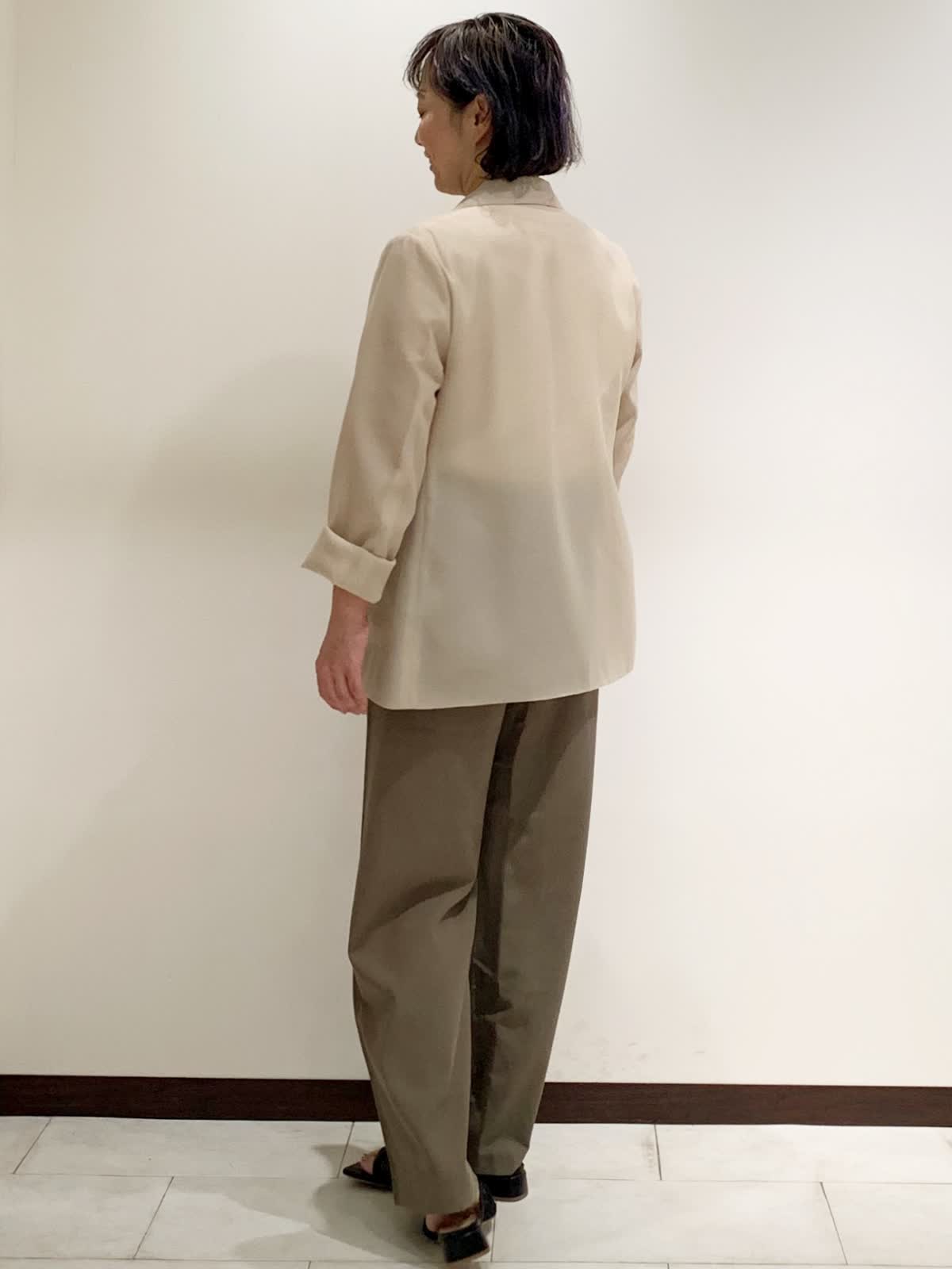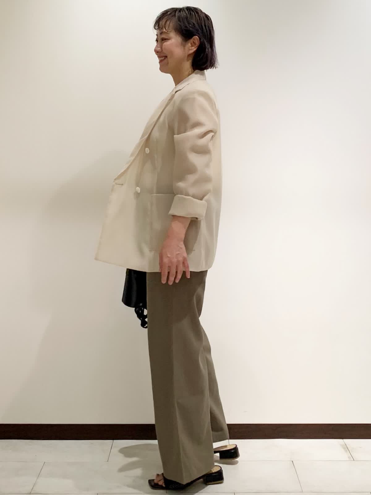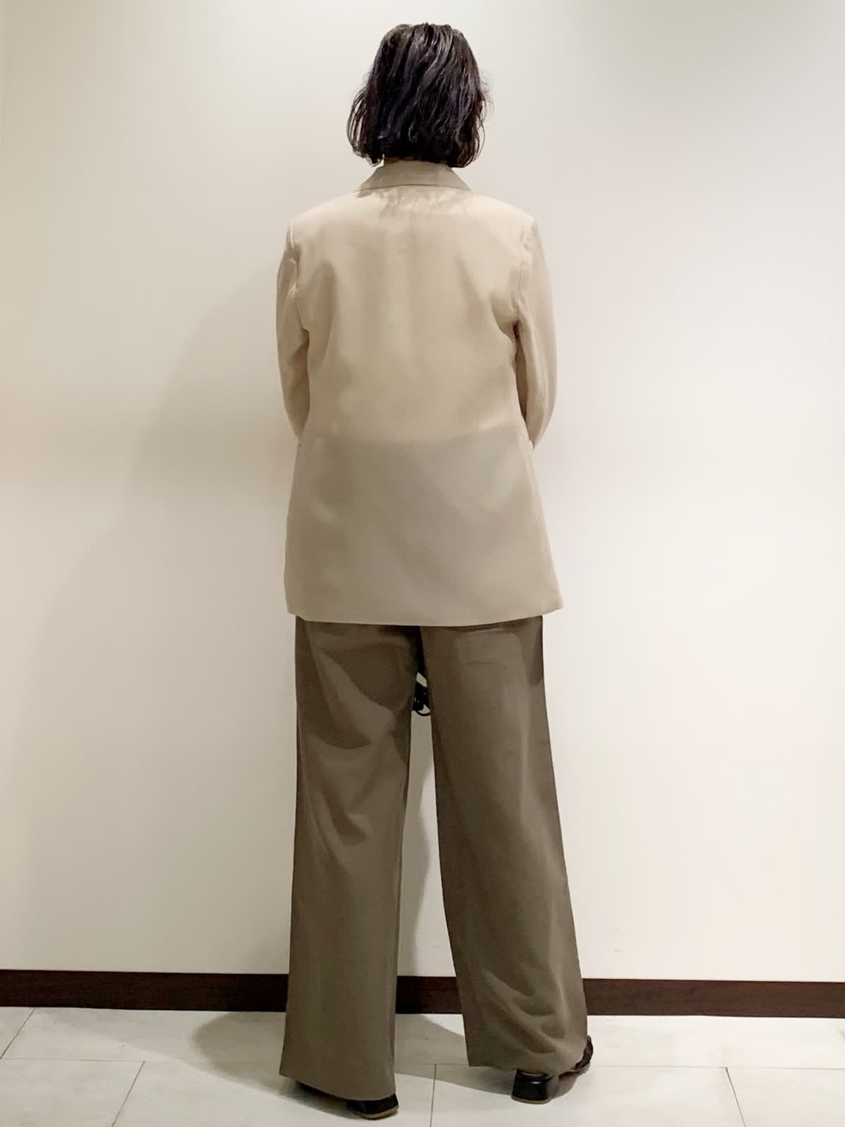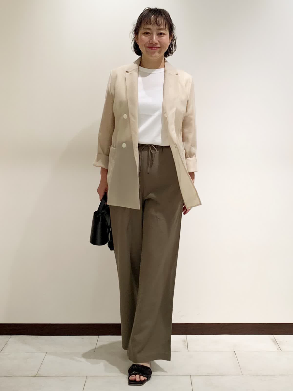 【着用サイズ】ジャケット・トップス:9号 パンツ:7号 【着用カラー】ジャケット:ベージュ トップス:ホワイト パンツ:カーキ バッグ:ブラック パンツは太すぎないスッキリシルエット。ウエストがゴムなのでリラックスして着られます。 この時期の羽織りにオススメのシアージャケットを合わせたスタイリング。