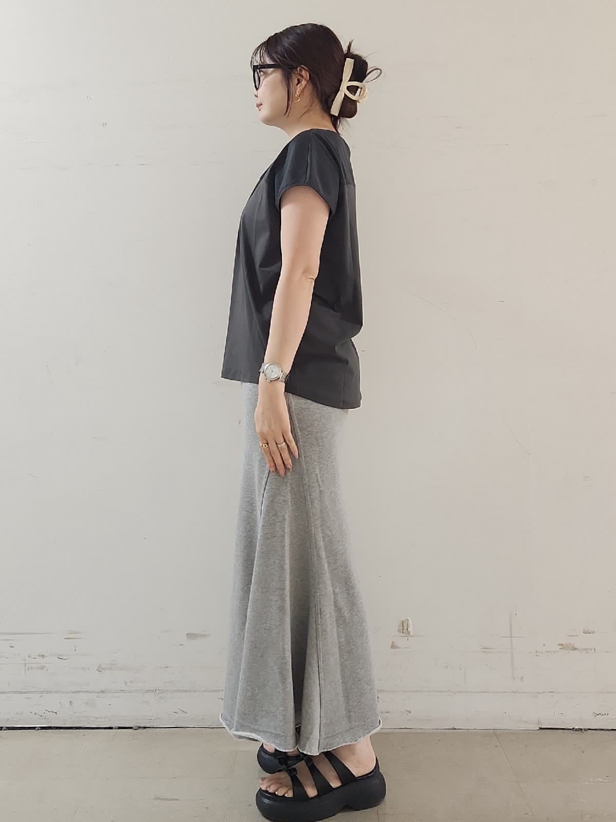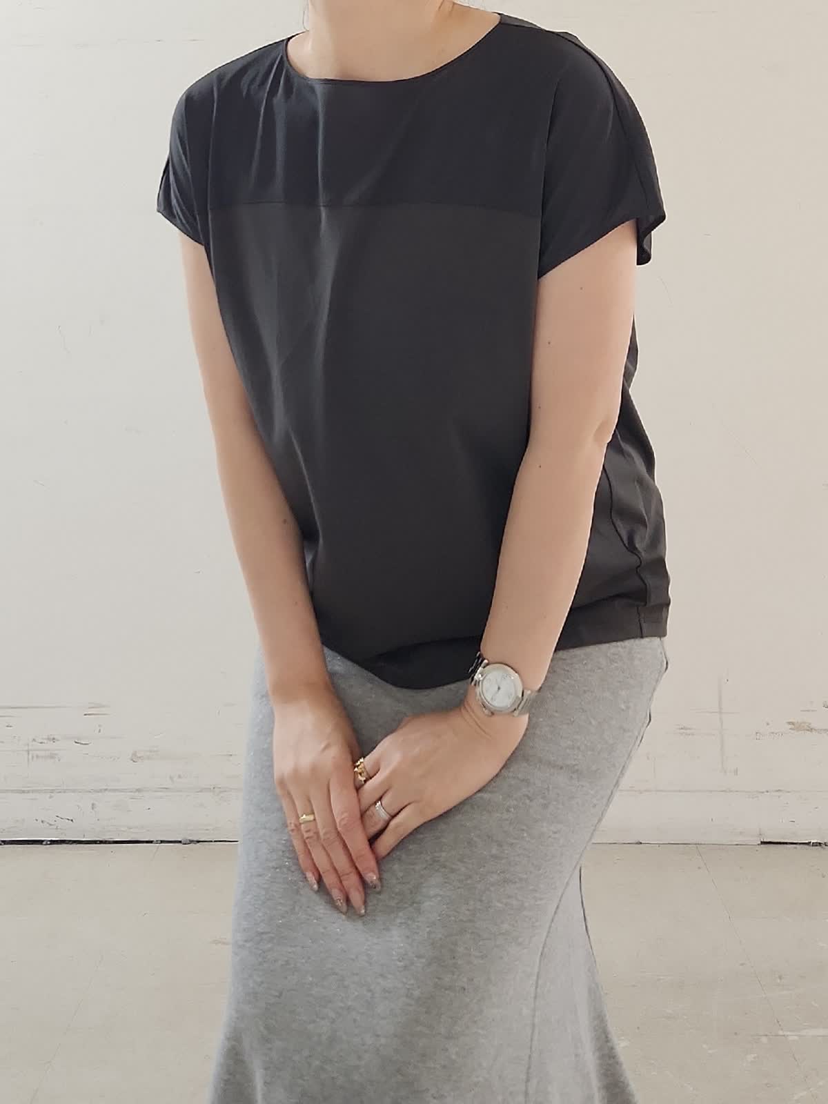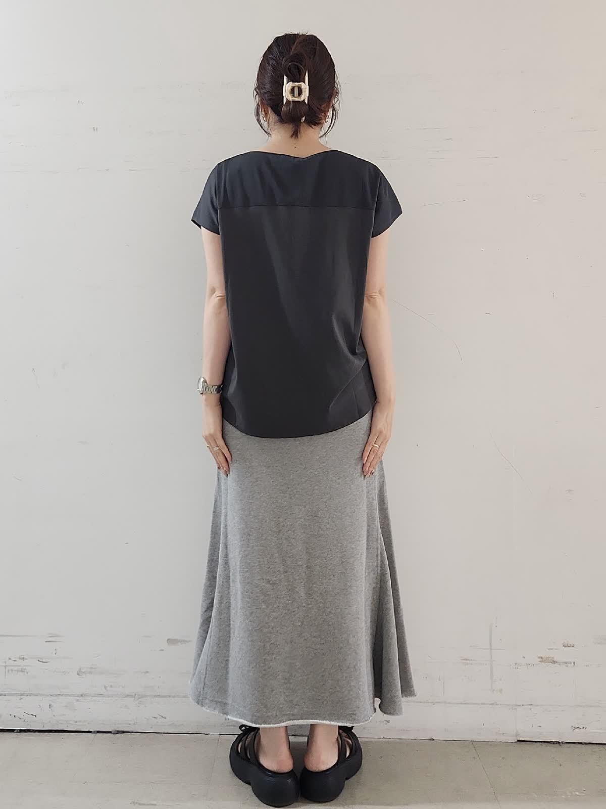 【着用サイズ】カットソー:9号/チャコールグレー スカート:9号/グレー 休日の楽ちんコーデ。ドッキングのカットソーは顔周りだけシアー素材で一枚でもサマになります。スカートは薄手の裏毛素材で柔らかく伸び感があります。ヒップ周りはタイトなので少しポケットが浮きやすいです。ウエストはゴムと紐でサイズ調整もできるのでサイズ選びはヒップで選ぶのがおすすめです。
