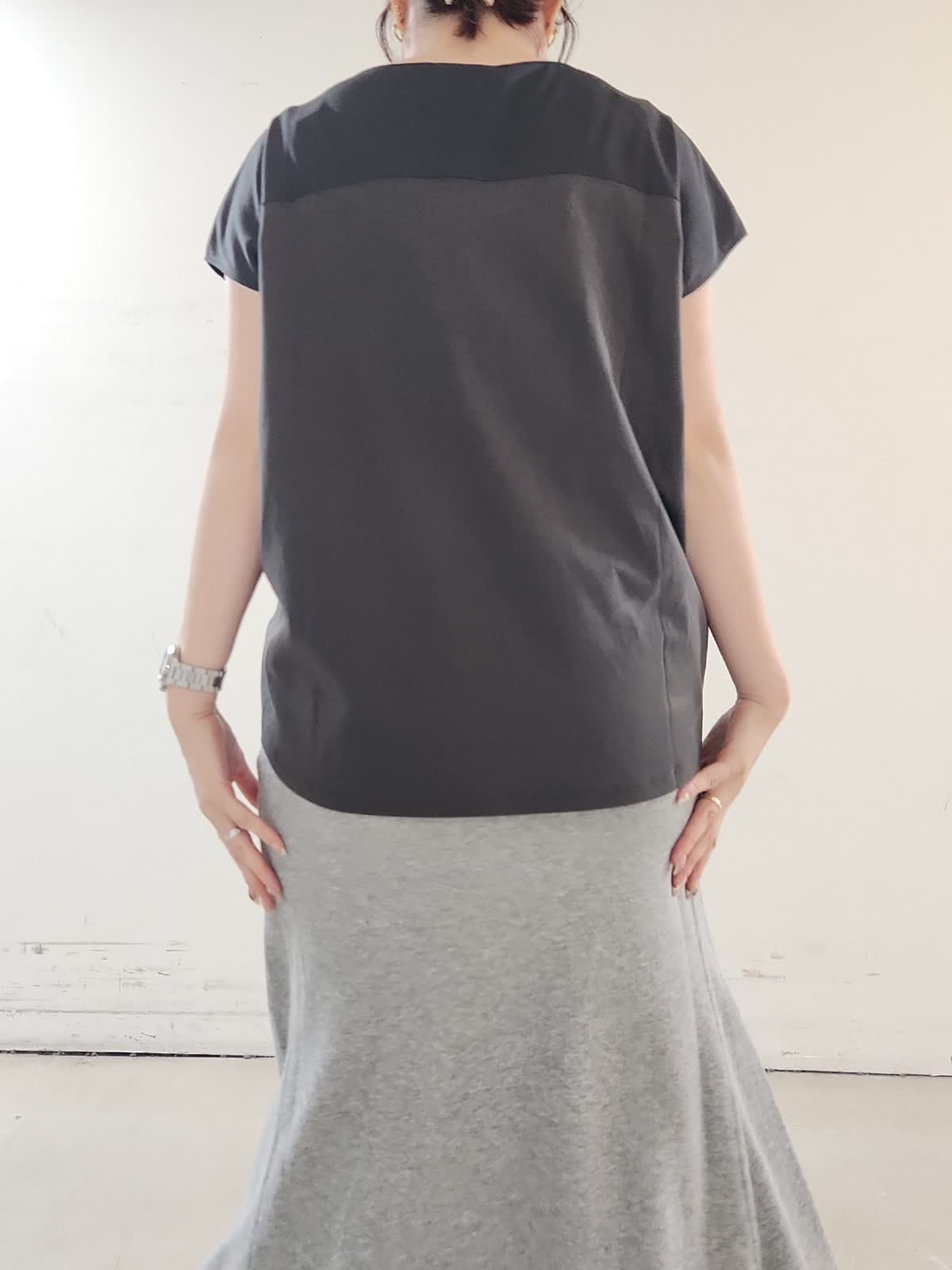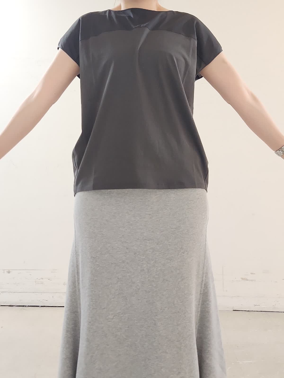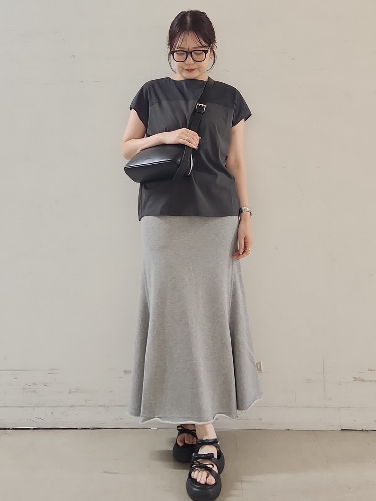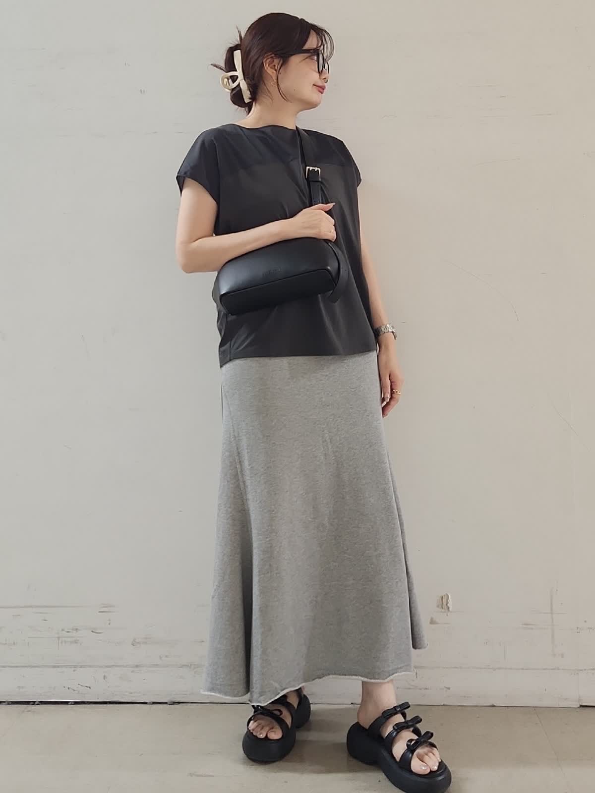 【着用サイズ】カットソー:9号/チャコールグレー スカート:9号/グレー 休日の楽ちんコーデ。ドッキングのカットソーは顔周りだけシアー素材で一枚でもサマになります。スカートは薄手の裏毛素材で柔らかく伸び感があります。ヒップ周りはタイトなので少しポケットが浮きやすいです。ウエストはゴムと紐でサイズ調整もできるのでサイズ選びはヒップで選ぶのがおすすめです。