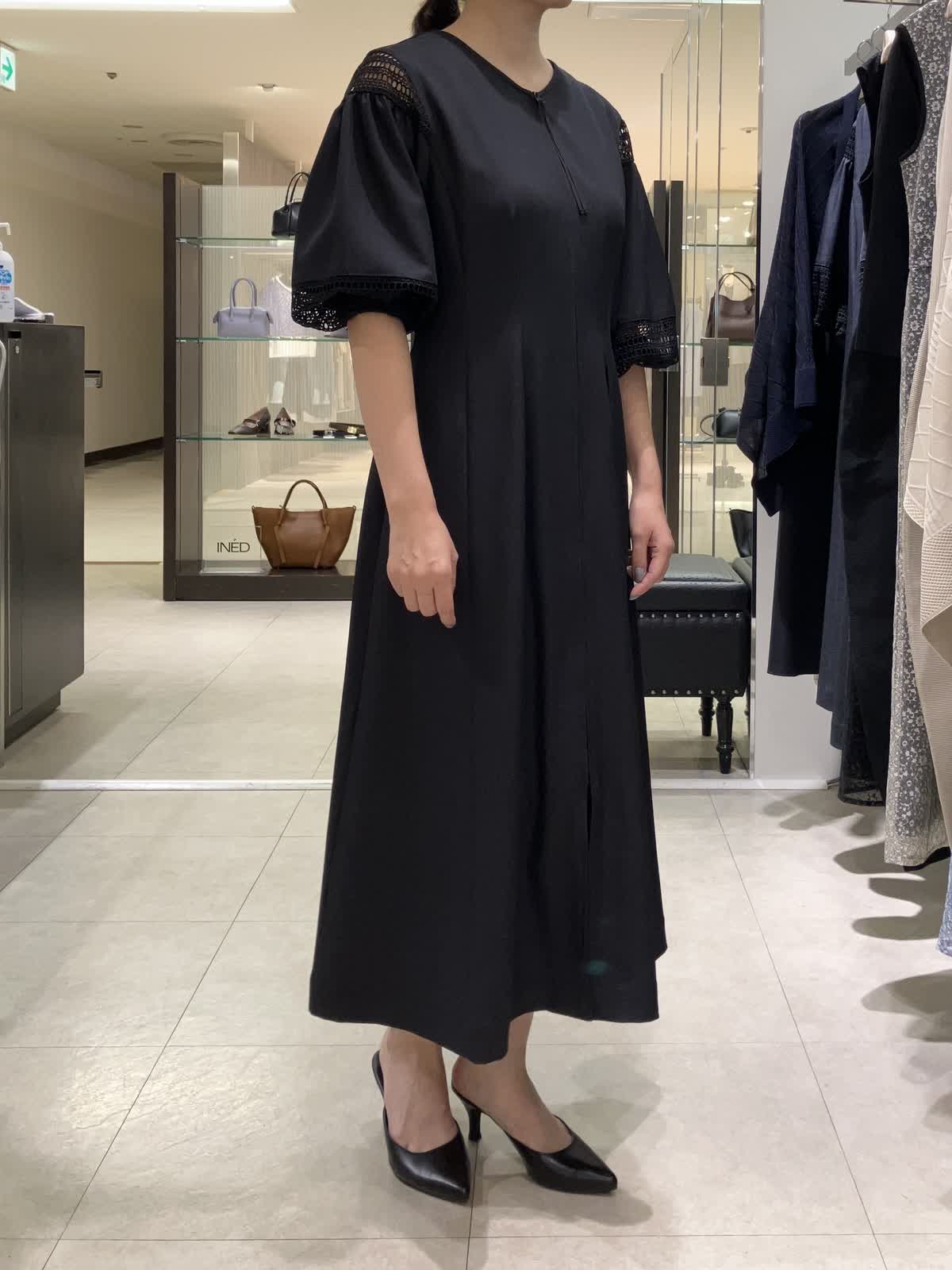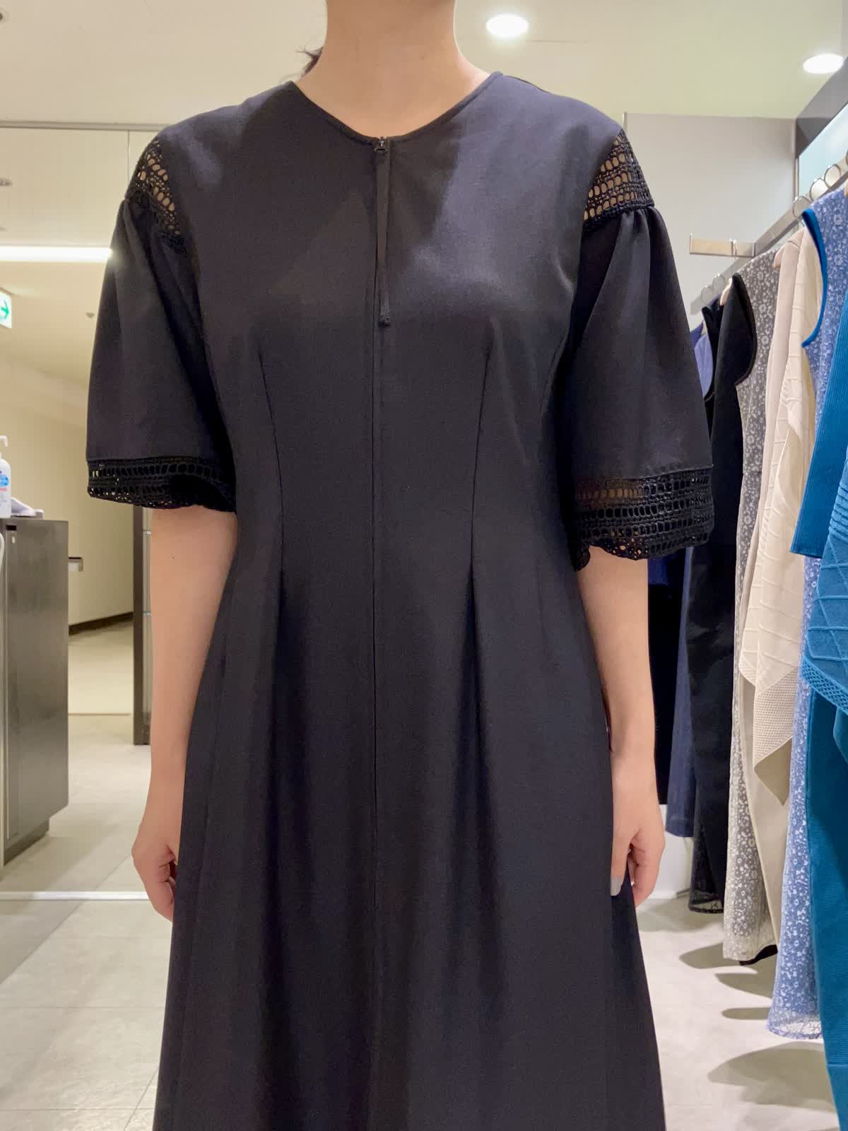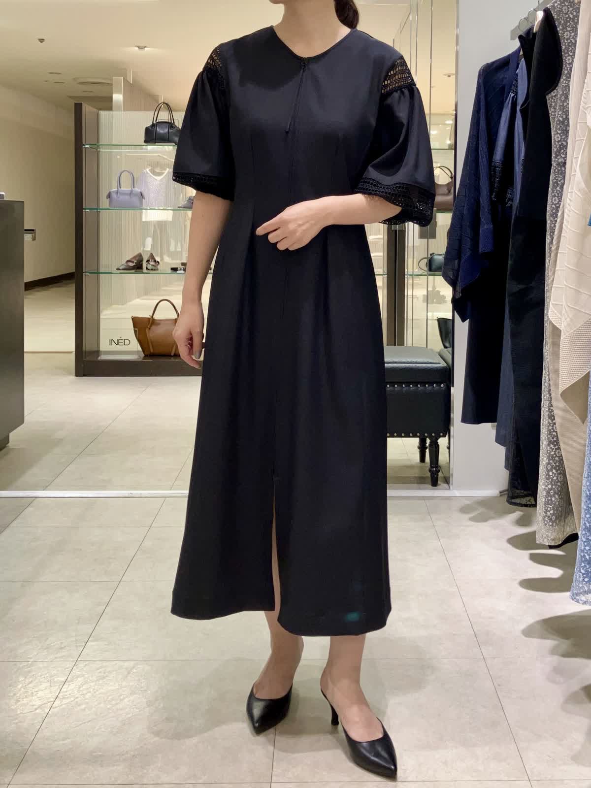 【着用サイズ】ワンピース:9号【着用カラー】ワンピース:ブラック きちんと感がありながら、フォーマル過ぎず、カジュアルなお食事シーンやおでかけシーンに使えるワンピース。ウエストに切り替えがあり、身体のラインを美しく魅せてくれます。フロントはジップ仕様のため着脱もラクチン。シワになりにくくて洗えるので長時間座る日も安心です。