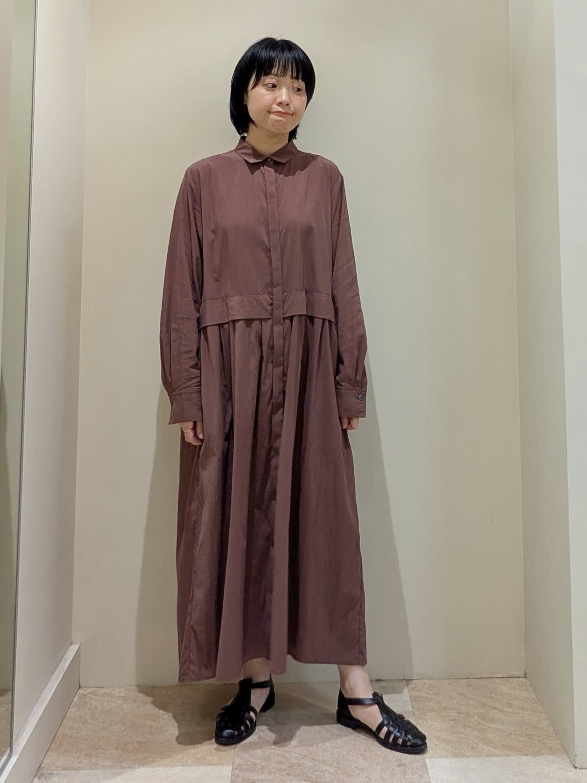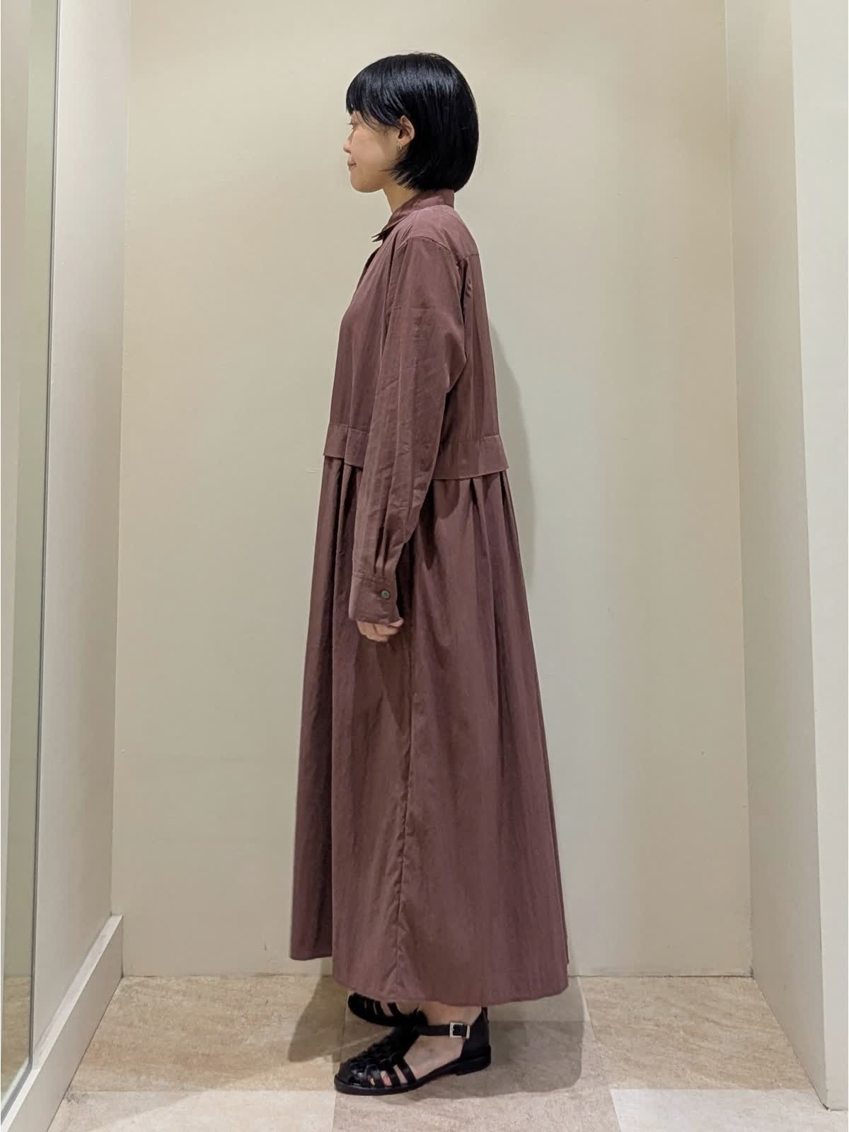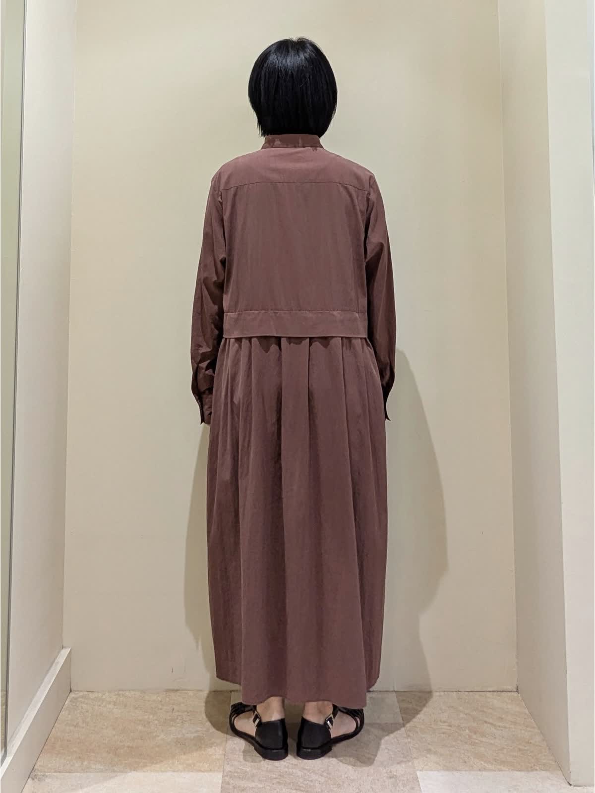 【着用サイズ】ワンピース/9号 【着用カラー】ワンピース/ボルドー 『秋のおすすめワンピーススタイル』 華奢な襟と比翼仕立てがノーブルな印象。タック&ギャザーがポイントながら、甘すぎない大人のワンピース。ビンテージ感が特徴の生地はシワになりにくく、洗える優れもの。前開きなので、羽織りとしても活躍間違い無し!