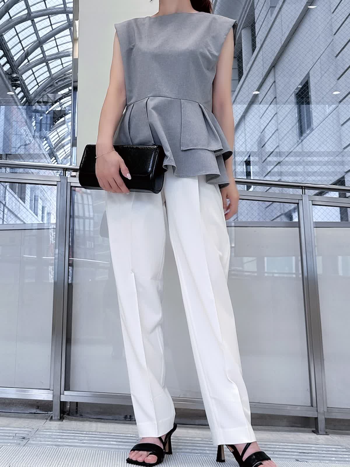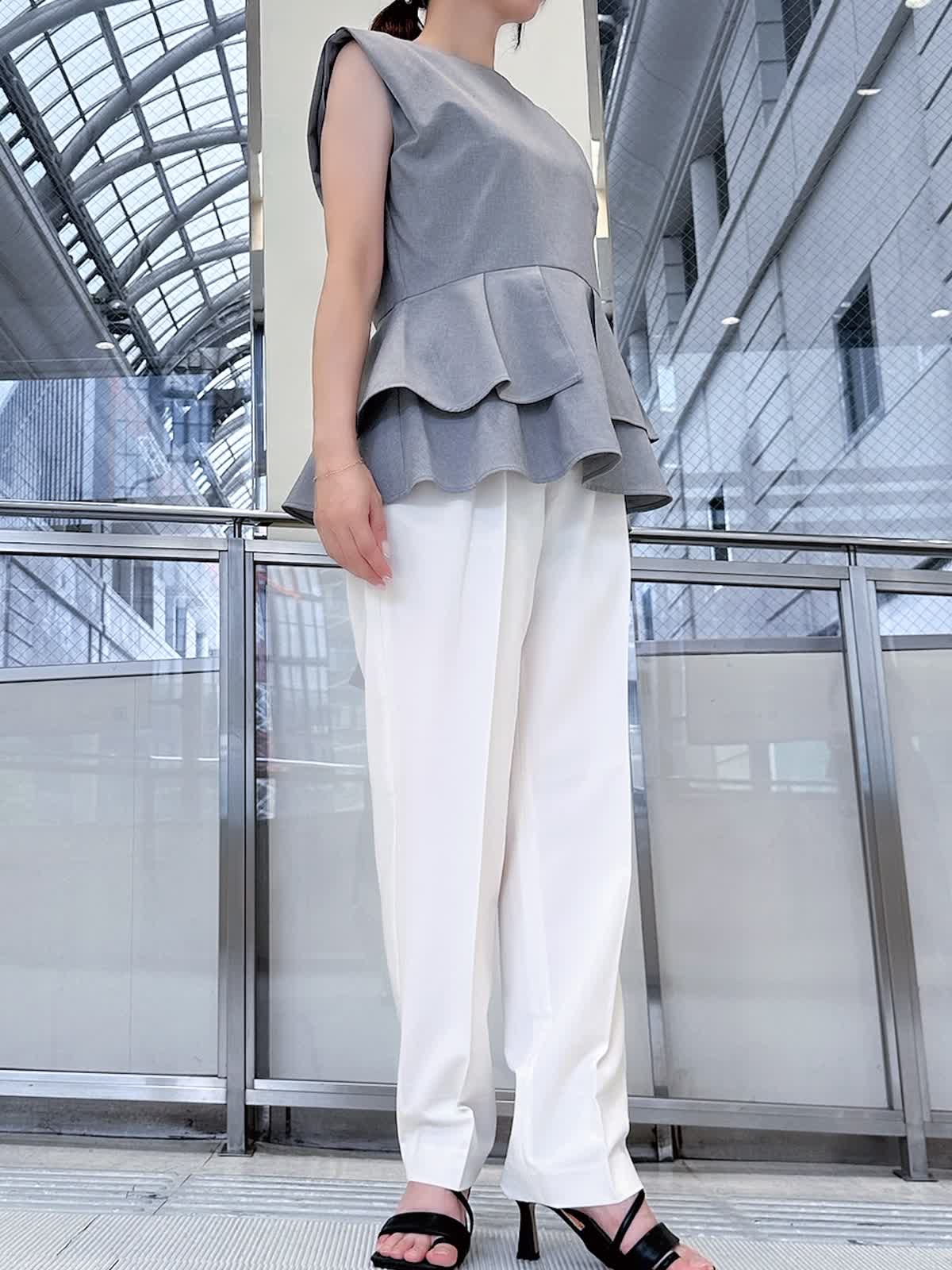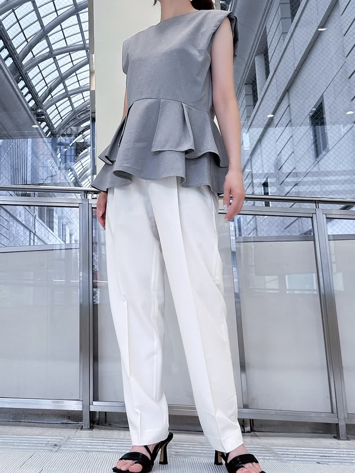【 着用サイズ/カラー】 ブラウス:フリー/グレー パンツ:7号/オフホワイト 1枚で着映えるペプラムデザインのブラウスは自然なくびれが演出でき、センタープレスのテーパードパンツと合わせる事でスラッと感を強調。フリルデザインで大人が気になるパーツをしっかりカバーしてくれます。 パンツは裏地つきなのでオフホワイトでも透け感気にせず履いて頂けます。
