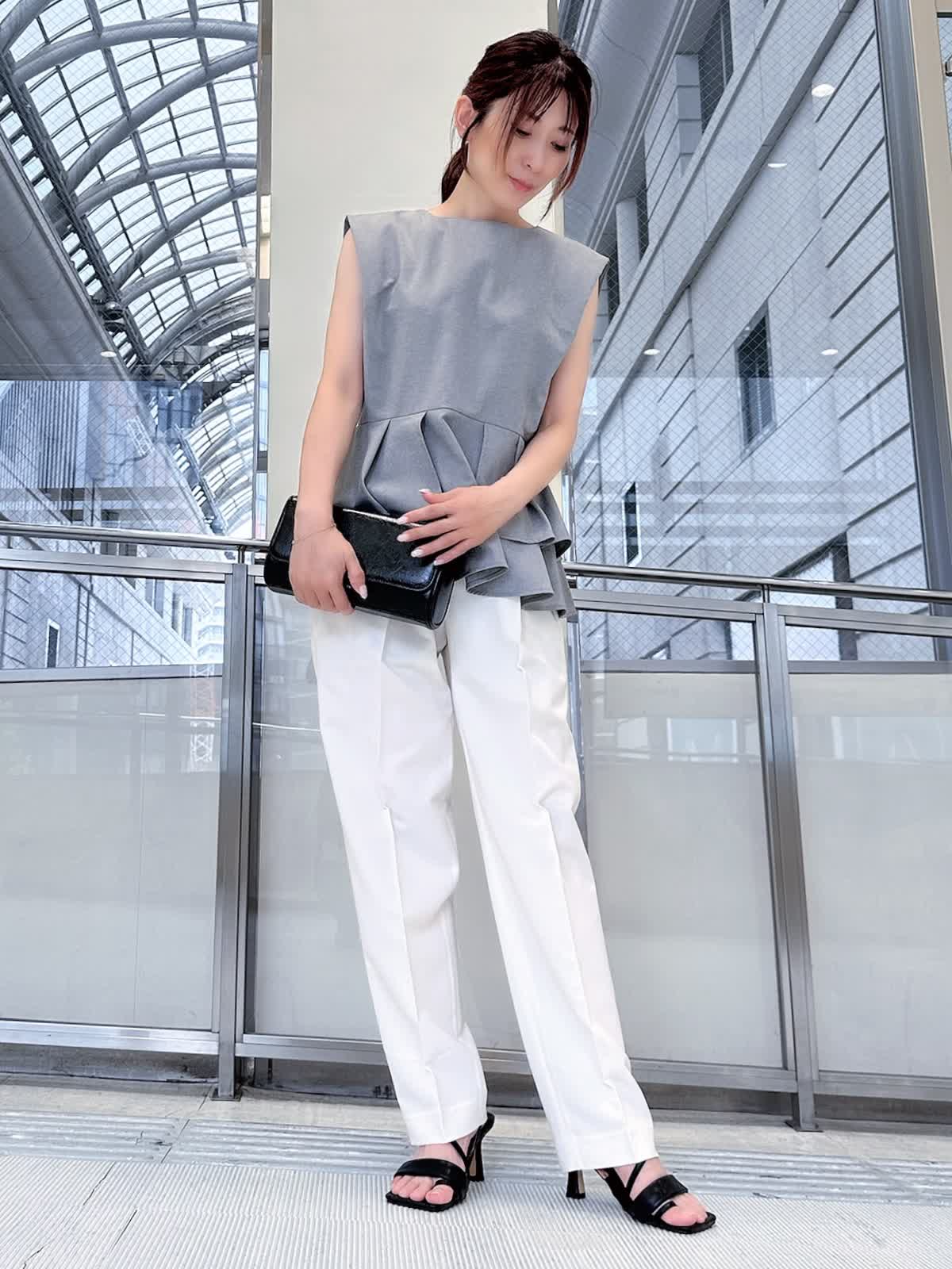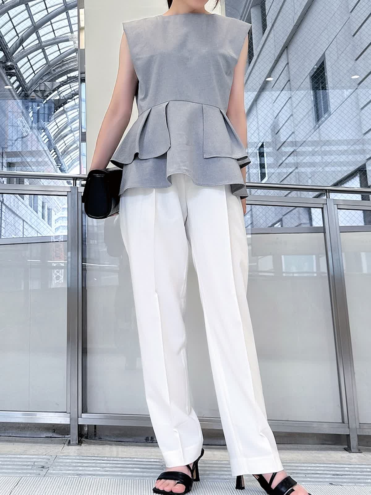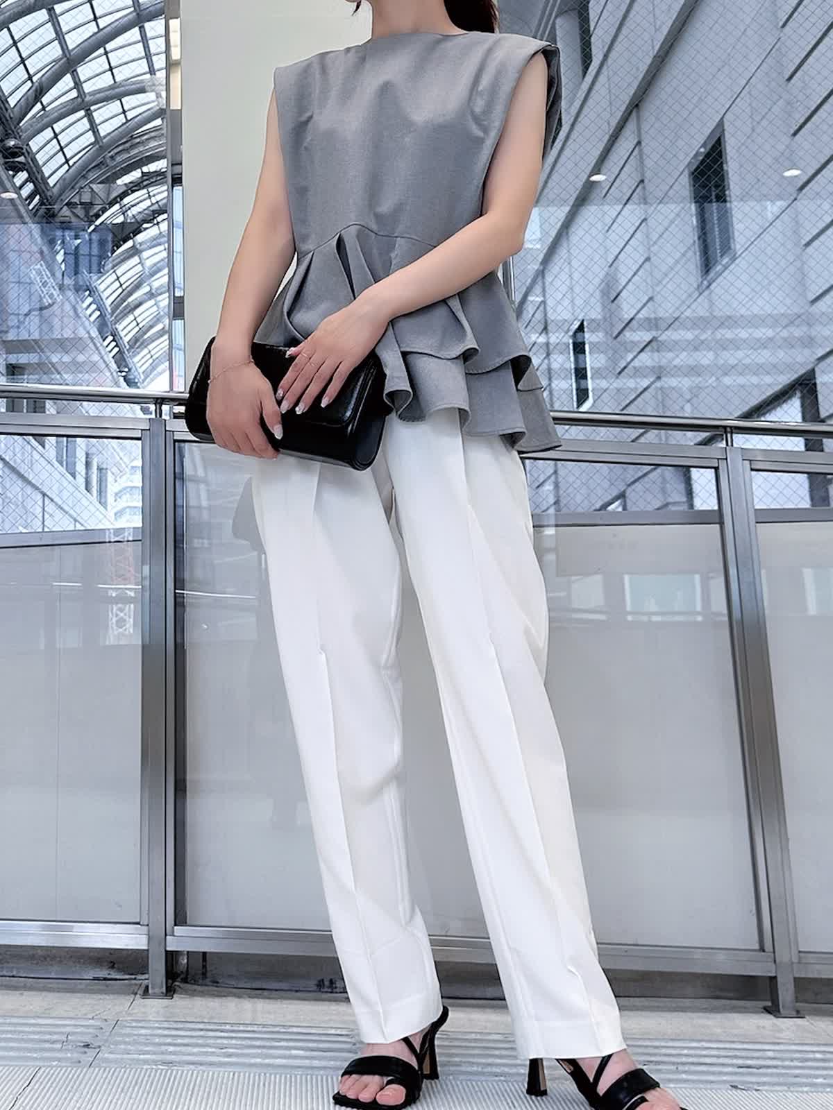 【 着用サイズ/カラー】 ブラウス:フリー/グレー パンツ:7号/オフホワイト 1枚で着映えるペプラムデザインのブラウスは自然なくびれが演出でき、センタープレスのテーパードパンツと合わせる事でスラッと感を強調。フリルデザインで大人が気になるパーツをしっかりカバーしてくれます。 パンツは裏地つきなのでオフホワイトでも透け感気にせず履いて頂けます。