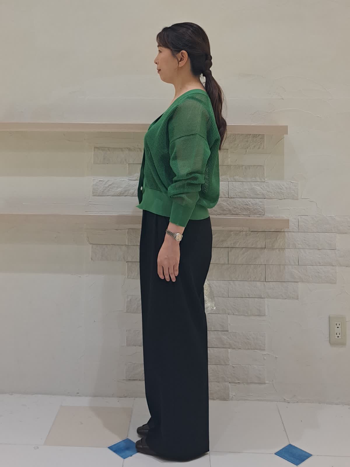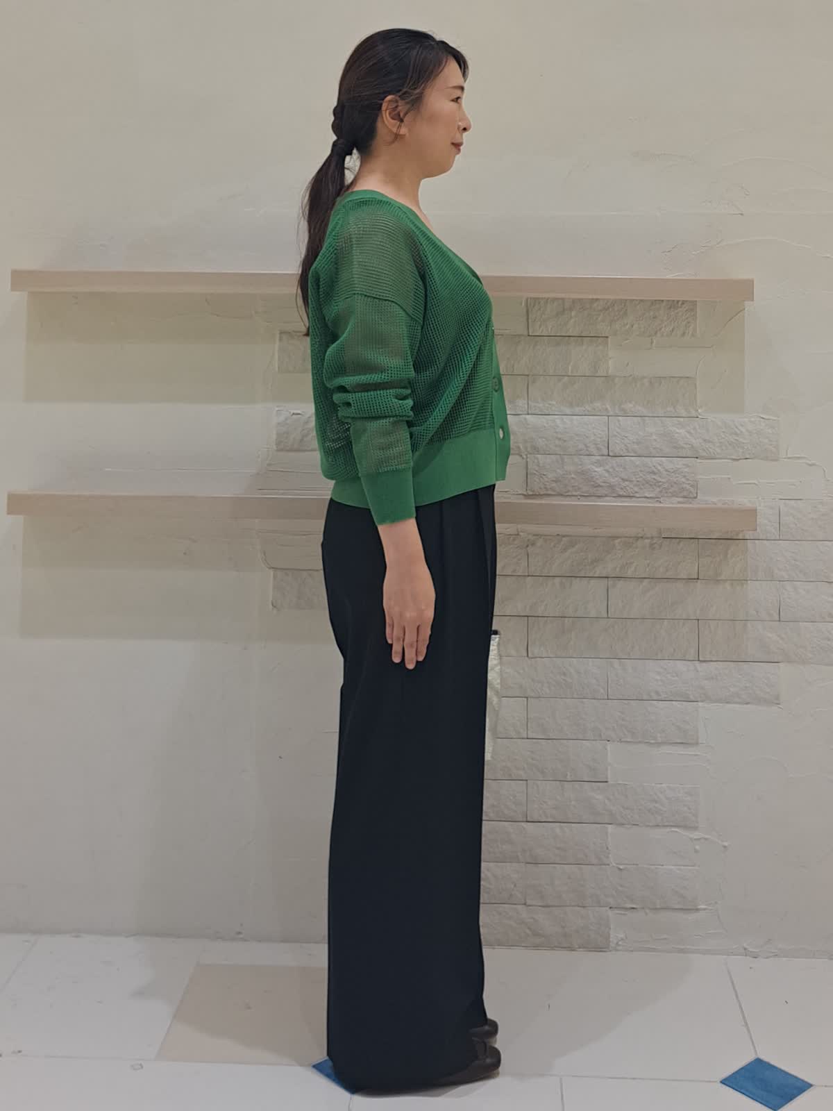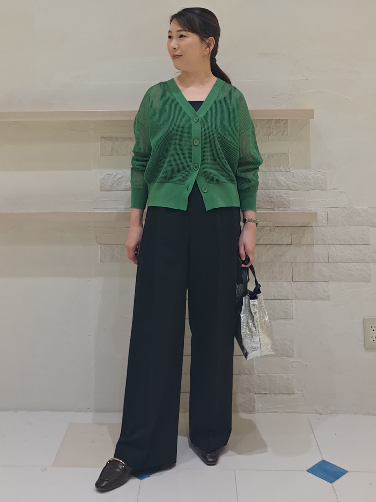 【着用サイズ】カーディガン:フリー インナー:9号 パンツ:9号 【着用カラー】カーディガン:グリーン インナー:ブラック パンツ:ブラック お仕事着からプライベートまで着回し抜群コーディネート ゆったりしたシルエットで、落ち着きカラーの差し色に便利なカーディガン。透かし柄でまだ暑い季節にも涼しく着て頂けます。 パンツはシワを気にせず着用でき、小柄な方でもスタイルアップして見えるデザインになっております。