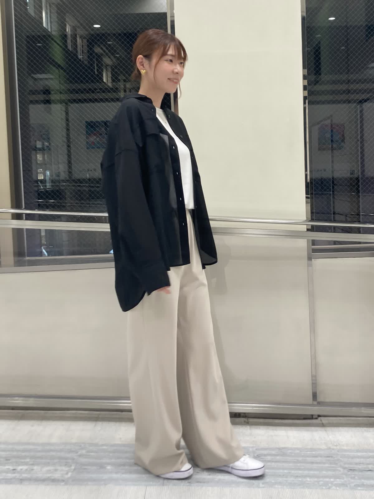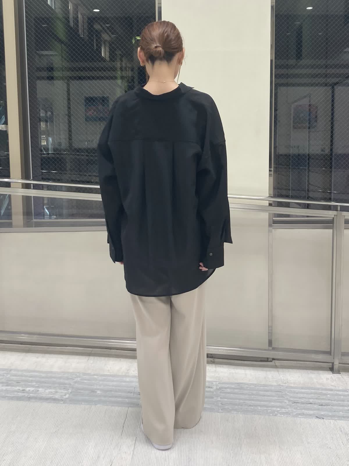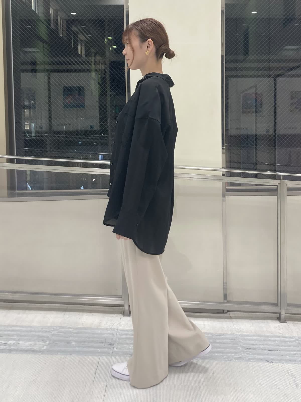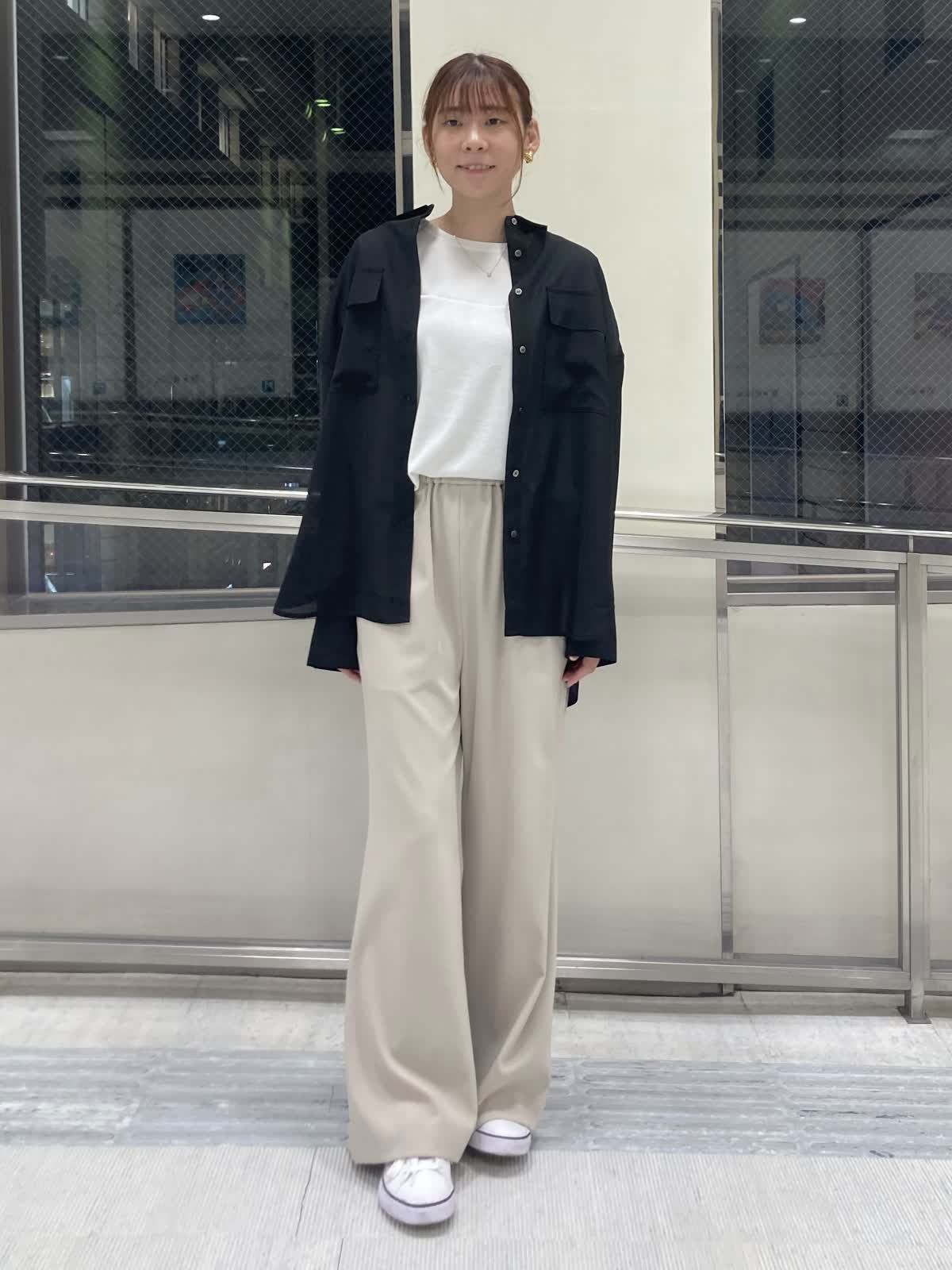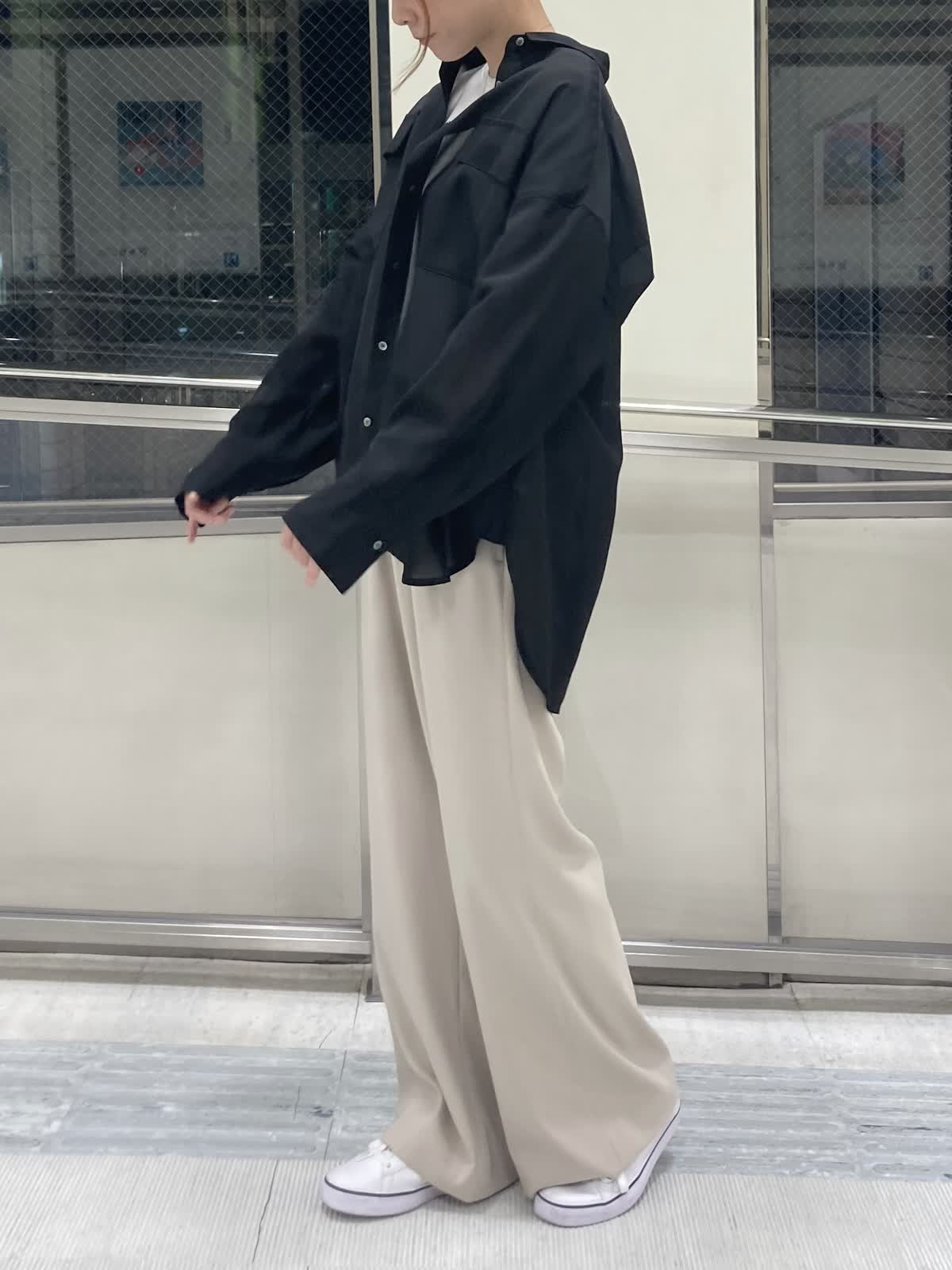【着用サイズ】ブラウス : 9号 インナー : フリー パンツ : 9号 【着用カラー】ブラウス:ブラック インナー : ホワイト パンツ : ベージュ 黒のシアーシャツをメインに大人カジュアルコーデにしました。オーバーサイズのシアーシャツは腕や腰回りなど気になる所をカバーしてくれます。お袖の釦が2個付いていて、お袖を捲りたい時は幅を狭めにするとお袖がより落ちにくくなるのでオススメです。 パンツはシルエットに拘っていて脚を綺麗に見せてくれます。ウエストゴムで程よいストレッチ感もあるのでとても履き心地が良いです。
