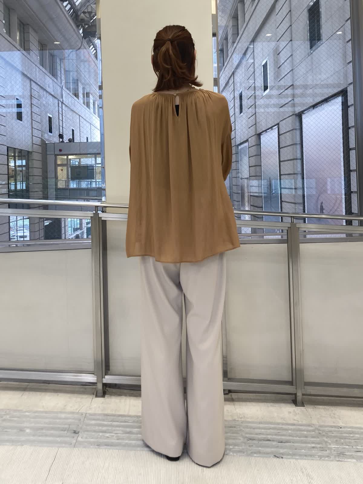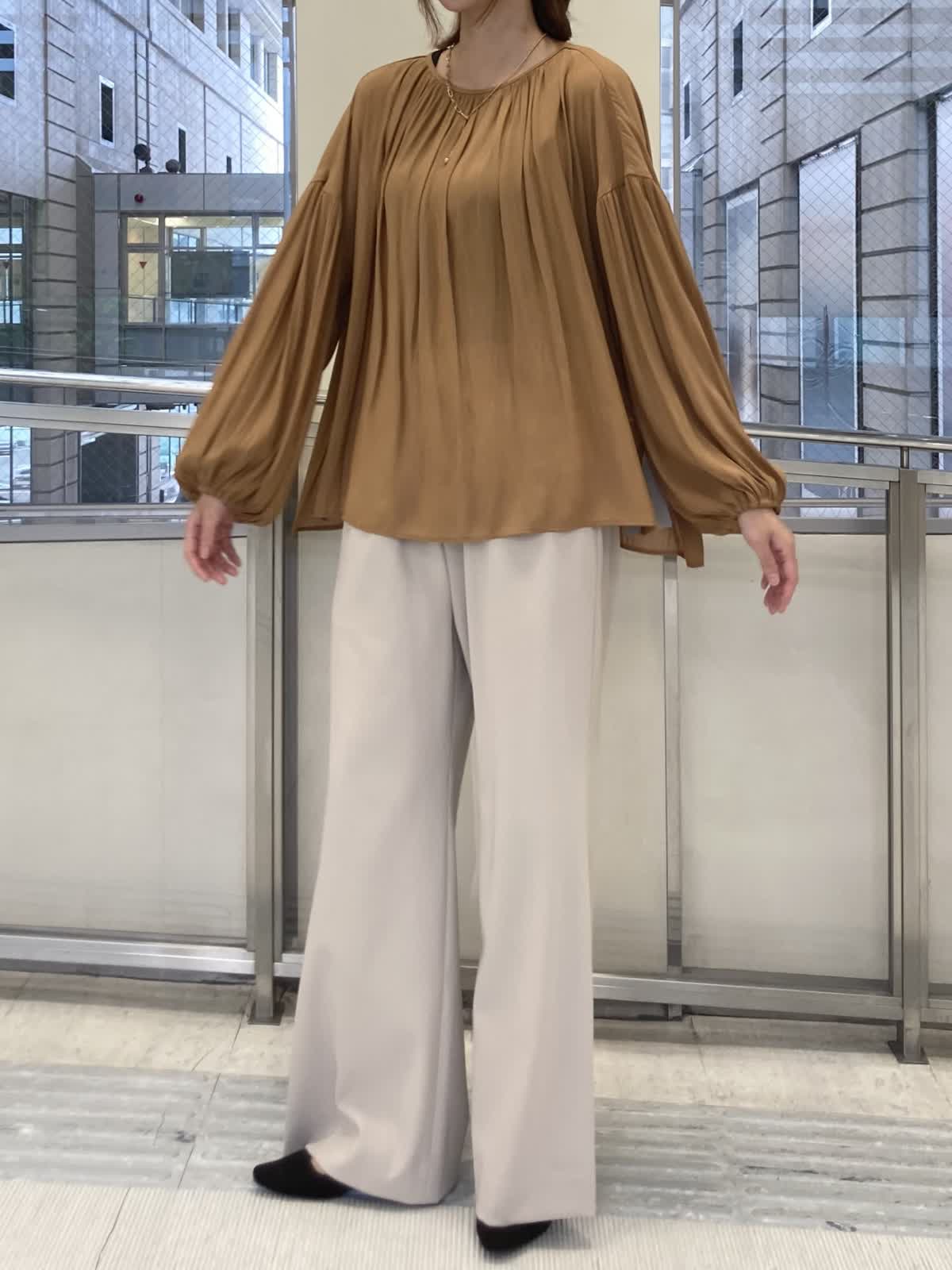 【着用サイズ】ブラウス : フリー パンツ : 9号 【着用カラー】ブラウス: オレンジ パンツ : ベージュ たっぷりのギャザーがポイントのブラウスに綺麗めパンツを合わせました。落ち着いたオレンジなので、普段カラーものを着ない方でも、挑戦しやすいお色です。シルエットが綺麗なパンツは脚を長く綺麗に見せてくれます。裏地がないのでオールシーズン快適に履けます。