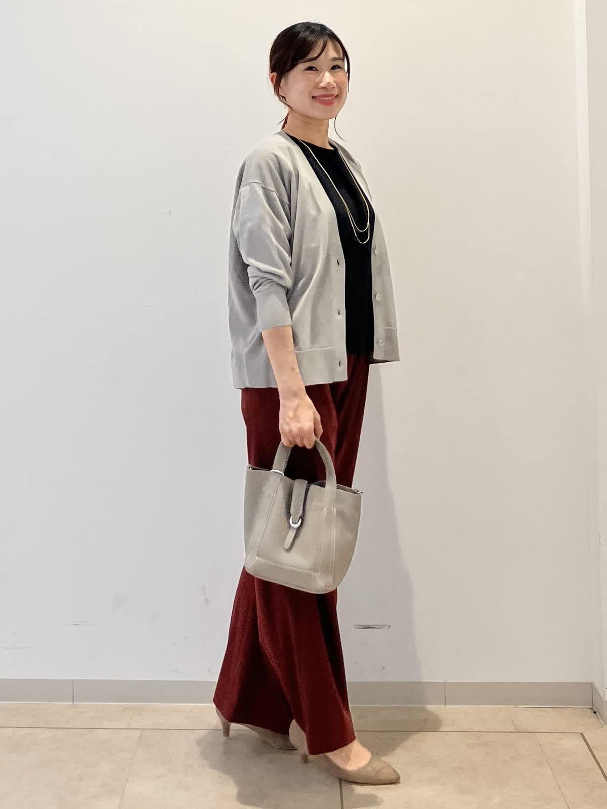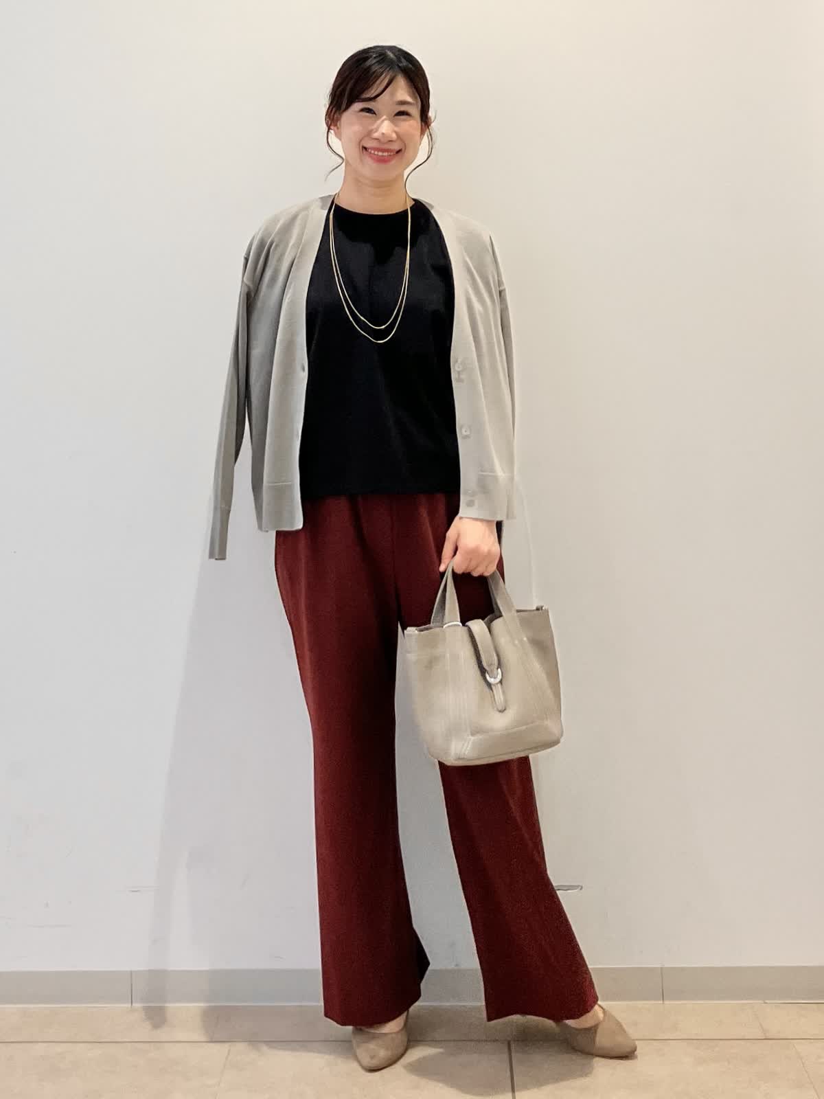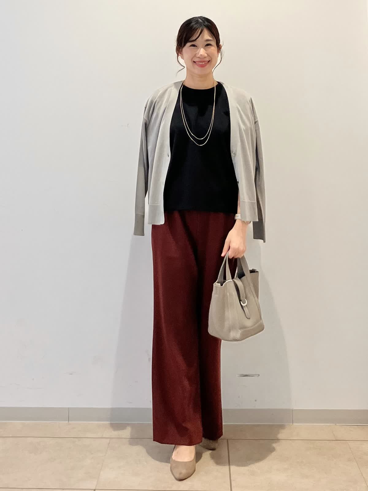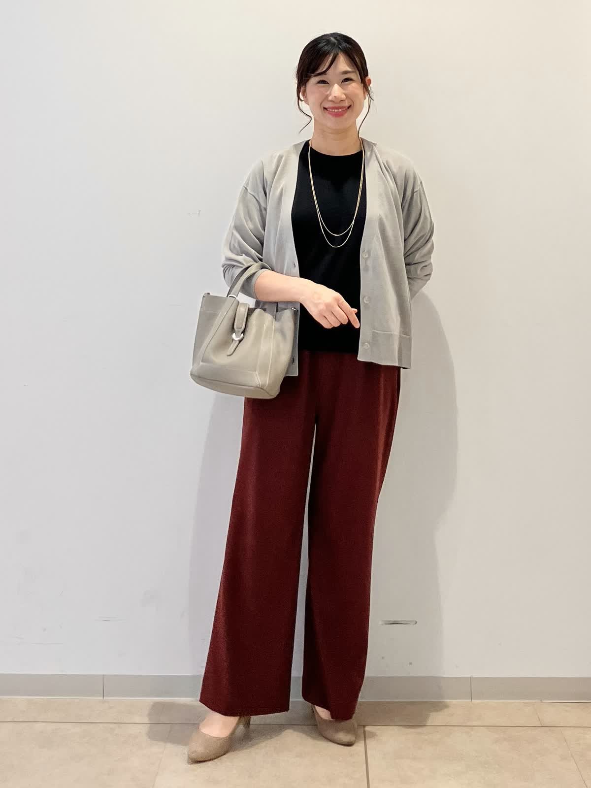 【着用サイズ】カーディガン:フリー カットソー:フリー パンツ:9号 「上品オフィスコーデ」 秋の始まりといえば、ブラック×ボルドーは相性抜群です! グレーのカーディガンで柔らかな印象に。冷房対策など、ほぼ閉まっておくことのないくらい、肌心地が良い万能カーディガンです。インナーはまだ暑いので、長めの半袖で!艶のある生地で上品さと清潔さときちんと感を自然に演出できます♪