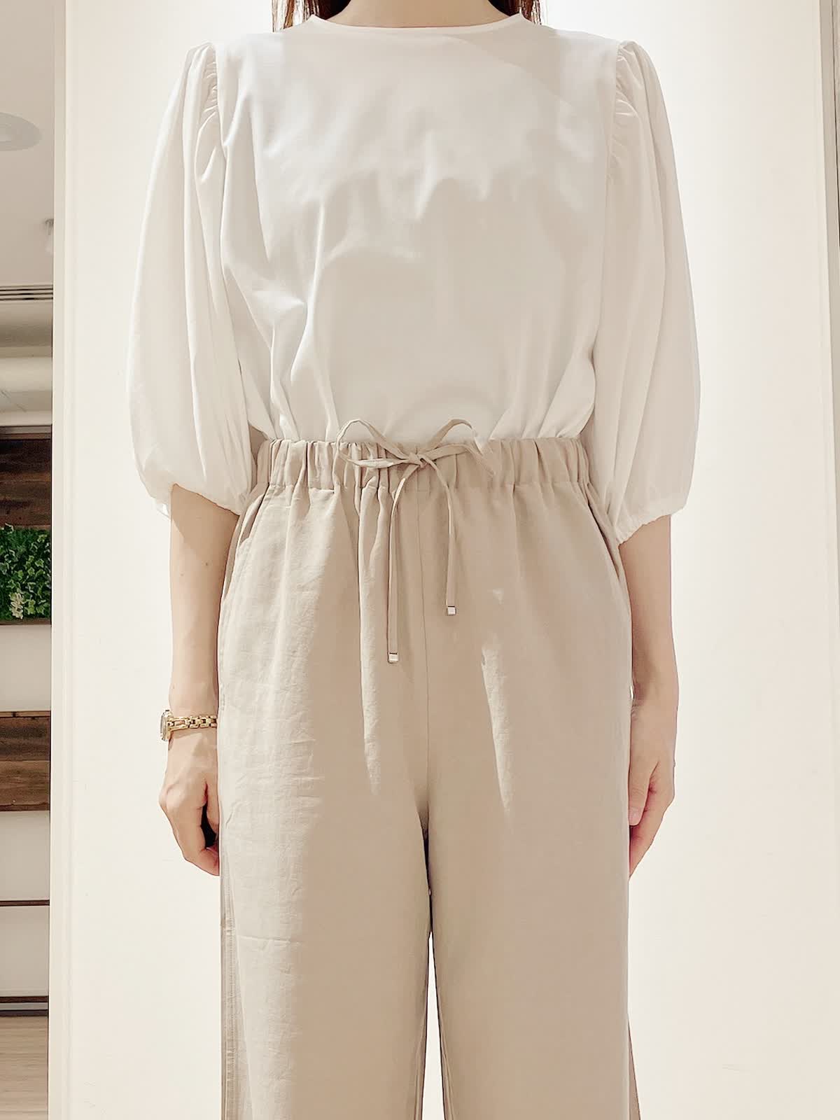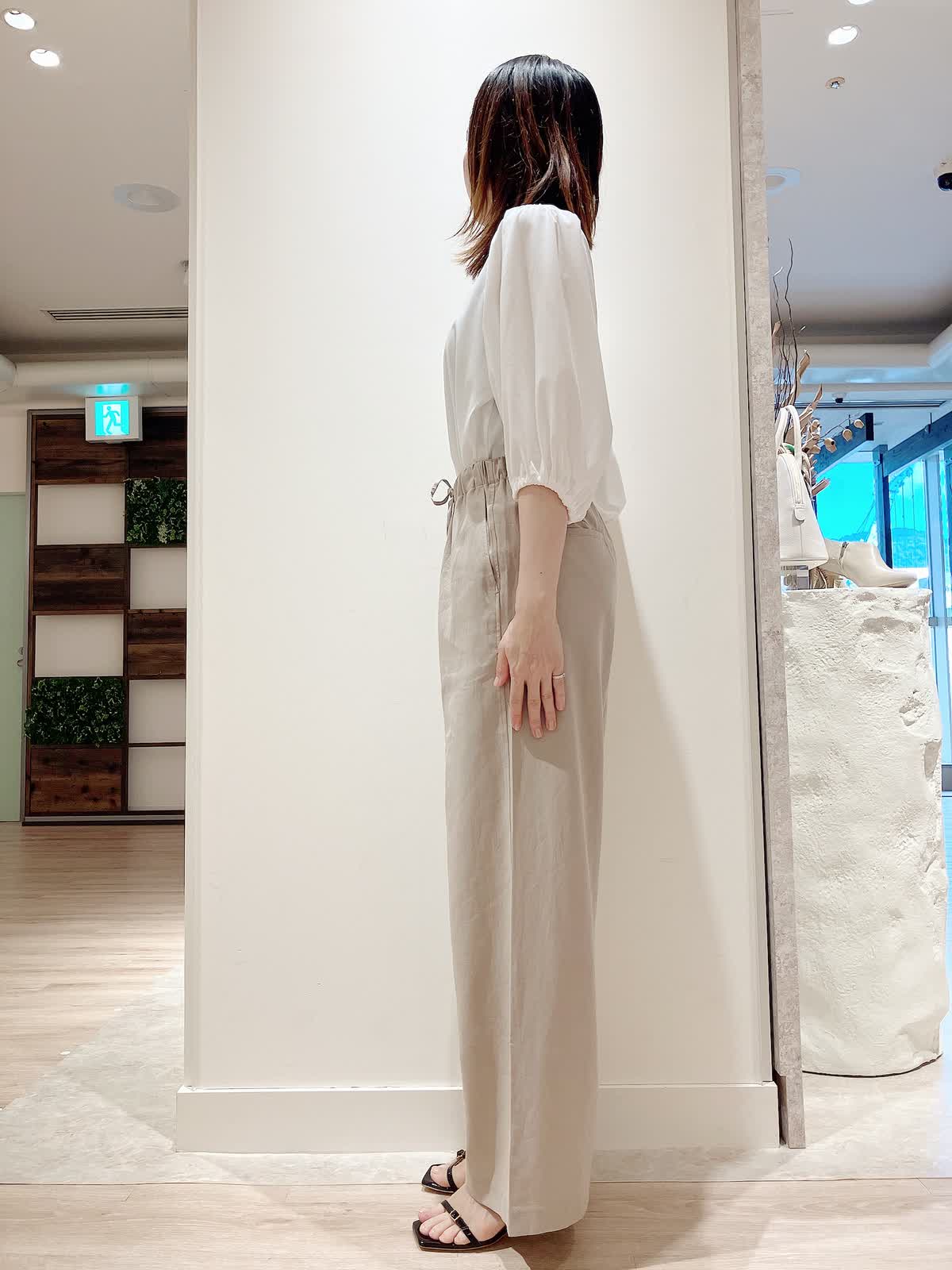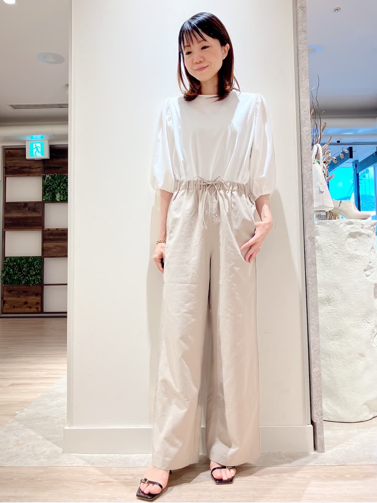 【着用サイズ】カットソー:9号 パンツ:7号 【着用カラー】カットソー:オフホワイト パンツ:ベージュ コーディネートのテーマは綺麗めカジュアルな通勤スタイリングです。 パフスリーブのカットソーは、さらっとした着心地で今からの時期大活躍。セットインスリーブでスッキリ見えも叶います。程よくゆるっとパンツにインしてきっちり見えで、お仕事着にもおすすめです。