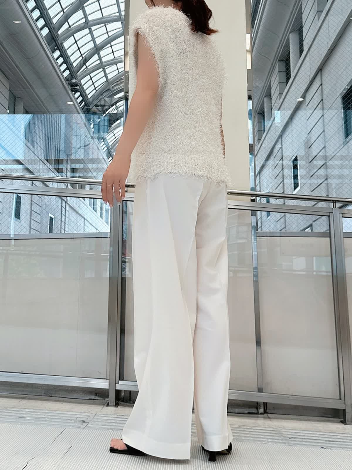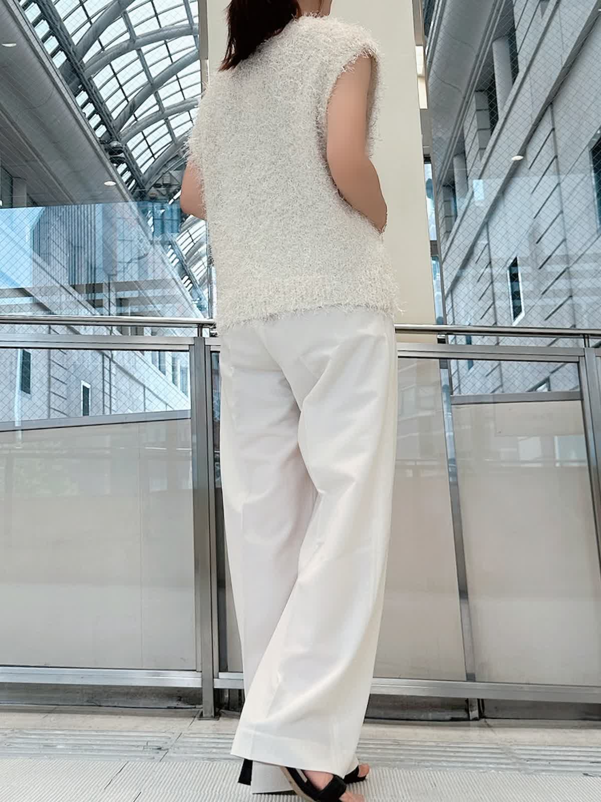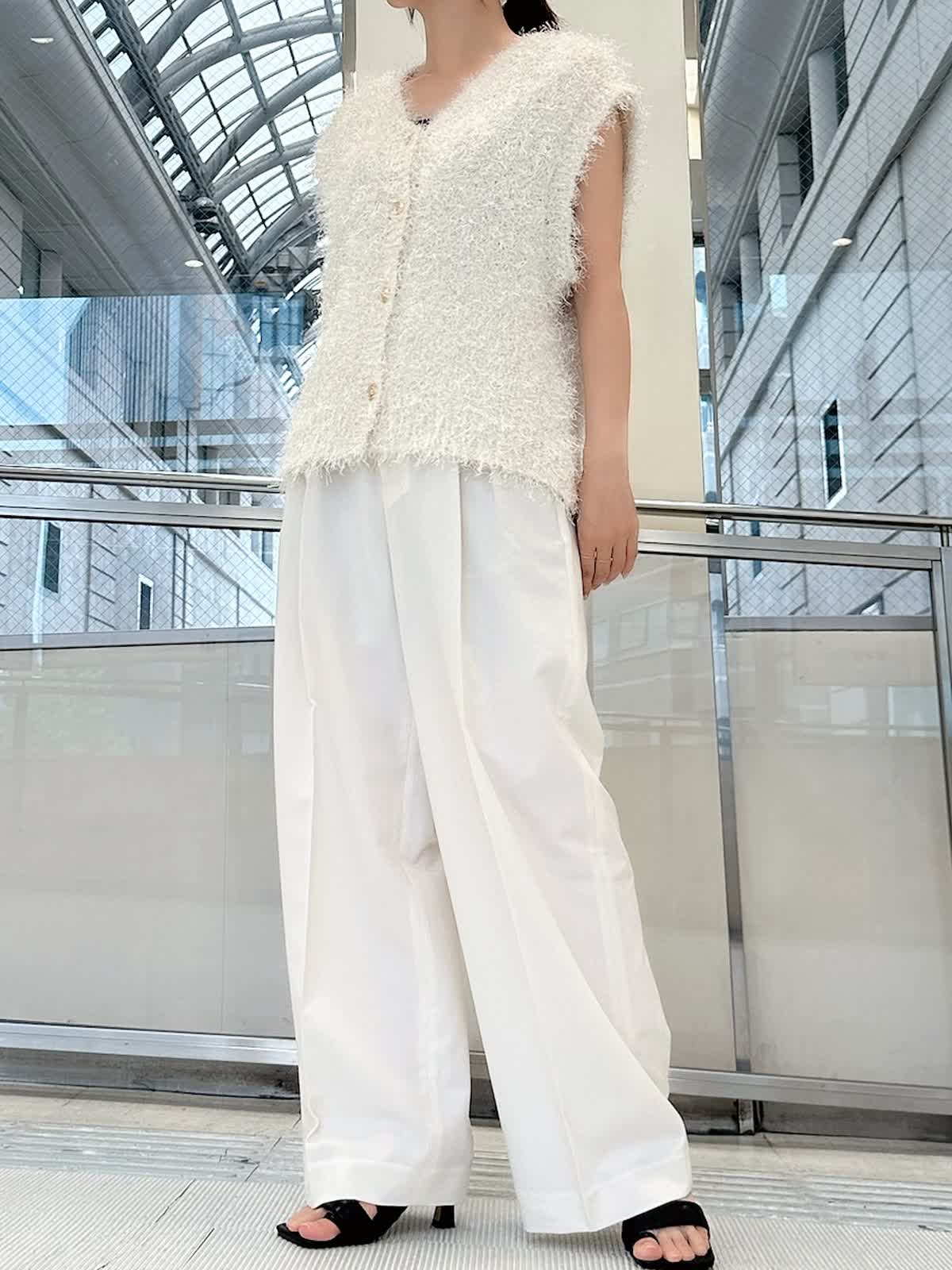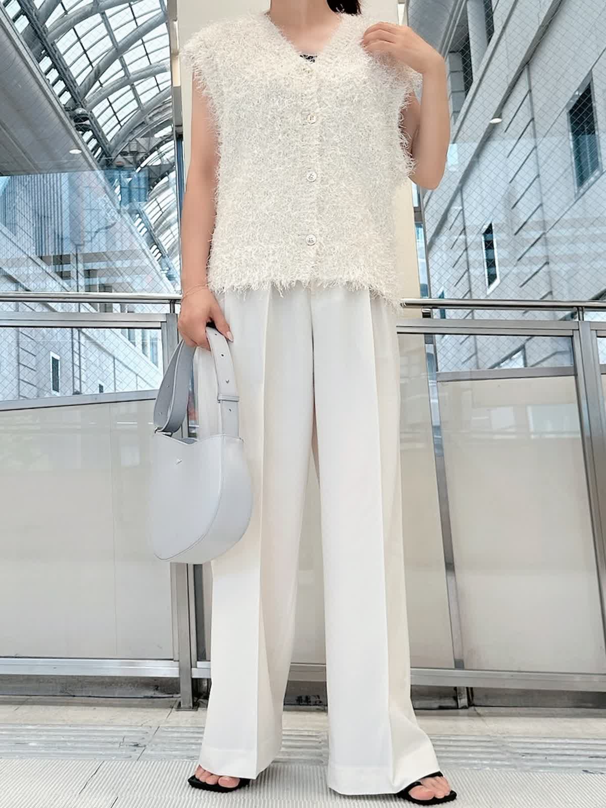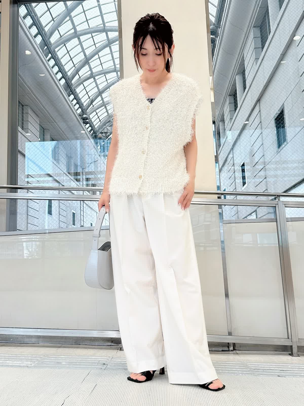 【着用サイズ/カラー】 ニットジレ:フリー/グレーベージュ パンツ:7号/オフホワイト タンクトップ:7号/ネイビー 旬度の高いジレコーデ。 1点投入するだけでいつもの着こなしをワンランクアップしてくれます。 ワイドパンツと合わせれば縦のラインが強調され、スタイルアップ効果も抜群。 寒くなればニットや長袖シャツに重ねてレイヤードも楽しめます。